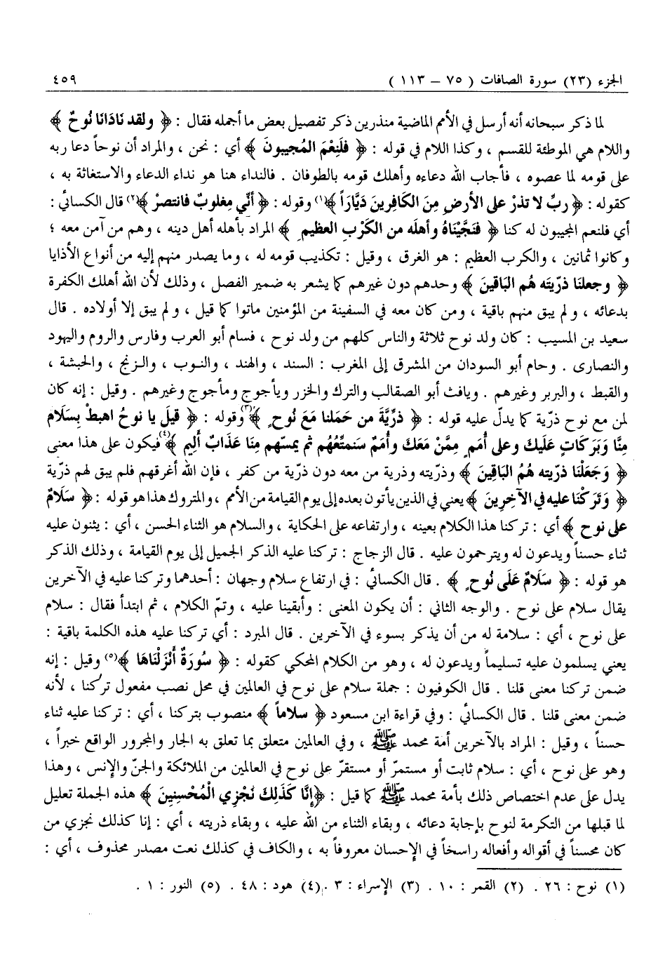 يَعْنِي يُسَلِّمُونَ عَلَيْهِ تَسْلِيمًا وَيَدْعُونَ لَهُ، وَهُوَ مِنَ الْكَلَامِ الْمَحْكِيِّ كَقَوْلِهِ: سُورَةٌ أَنْزَلْناها «5» وَقِيلَ: إِنَّهُ ضَمَّنَ تَرَكْنَا مَعْنَى قُلْنَا. قَالَ الْكُوفِيُّونَ: جُمْلَةُ سَلَامٌ عَلَى نُوحٍ فِي الْعَالَمِينَ فِي مَحَلِّ نَصْبٍ مَفْعُولِ تَرَكْنَا، لِأَنَّهُ ضُمِّنَ مَعْنَى قُلْنَا. قَالَ الْكِسَائِيُّ: وَفِي قِرَاءَةِ ابْنِ مسعود «سلاما» منصوب بتركنا، أَيْ: تَرَكْنَا عَلَيْهِ ثَنَاءً حَسَنًا، وَقِيلَ: الْمُرَادُ بالآخرين أمة محمّد صلّى الله عليه وسلم، وفي الْعَالَمِينَ مُتَعَلِّقٌ بِمَا تَعَلَّقَ بِهِ الْجَارُّ وَالْمَجْرُورُ الْوَاقِعُ خَبَرًا، وَهُوَ عَلَى نُوحٍ، أَيْ: سَلَامٌ ثَابِتٌ أَوْ مُسْتَمِرٌّ أَوْ مُسْتَقِرٌّ عَلَى نُوحٍ فِي الْعَالَمِينَ مِنَ الْمَلَائِكَةِ وَالْجِنِّ وَالْإِنْسِ، وَهَذَا يَدُلُّ عَلَى عَدَمِ اخْتِصَاصِ ذَلِكَ بِأُمَّةِ مُحَمَّدٍ صَلَّى اللَّهُ عَلَيْهِ وَسَلَّمَ كَمَا قِيلَ: إِنَّا كَذلِكَ نَجْزِي الْمُحْسِنِينَ هَذِهِ الْجُمْلَةُ تَعْلِيلٌ لِمَا قَبْلَهَا مِنَ التَّكْرِمَةِ لِنُوحٍ بِإِجَابَةِ دُعَائِهِ، وَبَقَاءِ الثَّنَاءِ مِنَ اللَّهِ عَلَيْهِ، وَبَقَاءِ ذُرِّيَّتِهِ، أَيْ: إِنَّا كَذَلِكَ نَجْزِي مَنْ كَانَ مُحْسِنًا فِي أَقْوَالِهِ وَأَفْعَالِهِ رَاسِخًا فِي الْإِحْسَانِ مَعْرُوفًا بِهِ، وَالْكَافُ فِي كَذَلِكَ نعت مصدر محذوف، أي: