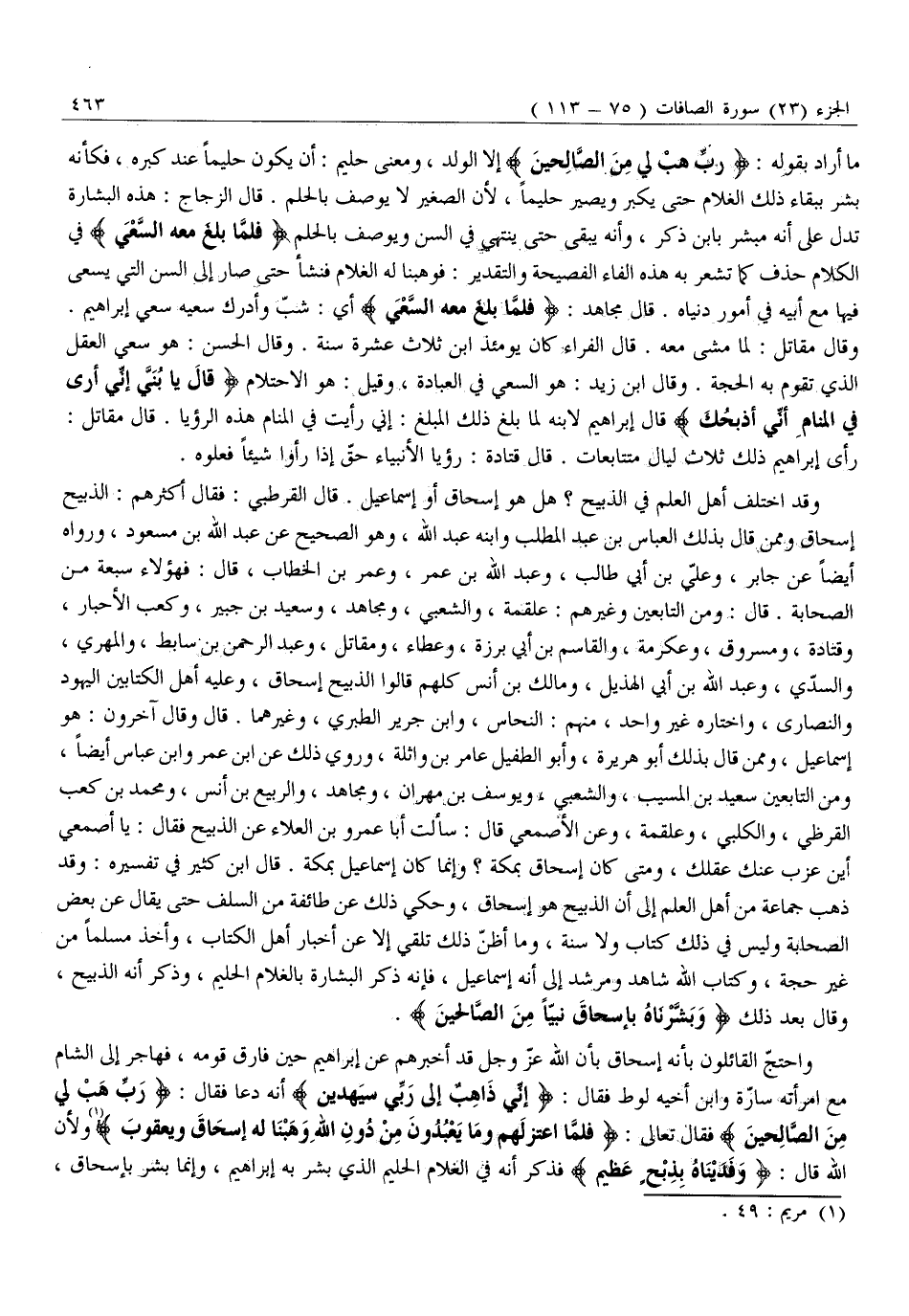 وَقَدِ اخْتَلَفَ أَهْلُ الْعِلْمِ فِي الذَّبِيحِ؟ هَلْ هُوَ إِسْحَاقُ أَوْ إِسْمَاعِيلُ. قَالَ الْقُرْطُبِيُّ: فَقَالَ أَكْثَرُهُمُ: الذَّبِيحُ إِسْحَاقُ وَمِمَّنْ قَالَ بِذَلِكَ الْعَبَّاسُ بْنُ عَبْدِ الْمَطَّلِبِ وابنه عَبْدِ اللَّهِ، وَهُوَ الصَّحِيحُ عَنْ عَبْدِ اللَّهِ بْنِ مَسْعُودٍ، وَرَوَاهُ أَيْضًا عَنْ جَابِرٍ، وَعَلِيِّ بْنِ أَبِي طَالِبٍ، وَعَبْدِ اللَّهِ بْنِ عُمَرَ، وَعُمَرَ بْنِ الْخَطَّابِ، قَالَ: فَهَؤُلَاءِ سَبْعَةٌ مِنَ الصَّحَابَةِ. قَالَ: وَمِنَ التَّابِعِينَ وَغَيْرِهِمْ: عَلْقَمَةُ، وَالشَّعْبِيُّ، وَمُجَاهِدٌ، وَسَعِيدُ بْنُ جُبَيْرٍ، وَكَعْبُ الْأَحْبَارِ، وَقَتَادَةُ، ومسروق، وعكرمة، والقاسم بن أبي برزة، وعطاء، ومقاتل، وعبد الرحمن بن سابط، والمهري، وَالسُّدِّيُّ، وَعَبْدُ اللَّهِ بْنُ أَبِي الْهُذَيْلِ، وَمَالِكُ بْنُ أَنَسٍ كُلُّهُمْ قَالُوا الذَّبِيحُ إِسْحَاقُ، وَعَلَيْهِ أَهْلُ الْكِتَابَيْنِ الْيَهُودُ وَالنَّصَارَى، وَاخْتَارَهُ غَيْرُ وَاحِدٍ، مِنْهُمُ: النَّحَّاسُ، وَابْنُ جَرِيرٍ الطَّبَرِيُّ، وَغَيْرُهُمَا. قَالَ وَقَالَ آخَرُونَ: هُوَ إِسْمَاعِيلُ، وَمِمَّنْ قَالَ بِذَلِكَ أَبُو هُرَيْرَةَ، وَأَبُو الطُّفَيْلِ عَامِرُ بْنُ وَاثِلَةَ، وَرُوِيَ ذَلِكَ عَنِ ابْنِ عُمَرَ وَابْنِ عَبَّاسٍ أَيْضًا، وَمِنَ التَّابِعِينَ سَعِيدُ بْنُ الْمُسَيَّبِ، وَالشَّعْبِيُّ، وَيُوسُفُ بْنُ مِهْرَانَ، وَمُجَاهِدٌ، وَالرَّبِيعُ بْنُ أَنَسٍ، وَمُحَمَّدُ بْنُ كَعْبٍ الْقُرَظِيُّ، وَالْكَلْبِيُّ، وَعَلْقَمَةُ، وَعَنِ الْأَصْمَعِيِّ قَالَ: سَأَلْتُ أَبَا عَمْرِو بْنَ الْعَلَاءِ عَنِ الذَّبِيحِ فَقَالَ: يَا أَصْمَعِيُّ أَيْنَ عَزَبَ عَنْكَ عَقْلُكَ، وَمَتَى كَانَ إِسْحَاقُ بِمَكَّةَ؟ وَإِنَّمَا كَانَ إِسْمَاعِيلُ بِمَكَّةَ. قَالَ ابْنُ كَثِيرٍ فِي تَفْسِيرِهِ: وَقَدْ ذَهَبَ جَمَاعَةٌ مِنْ أَهْلِ الْعِلْمِ إِلَى أَنَّ الذَّبِيحَ هُوَ إِسْحَاقُ، وَحُكِيَ ذَلِكَ عَنْ طَائِفَةٍ مِنَ السَّلَفِ حَتَّى يُقَالَ عَنْ بَعْضِ الصَّحَابَةِ وَلَيْسَ فِي ذَلِكَ كِتَابٌ وَلَا سُنَّةٌ، وَمَا أَظُنُّ ذَلِكَ تُلُقِّيَ إِلَّا عَنْ أَخْبَارِ أَهْلِ الْكِتَابِ، وَأُخِذَ مُسَلَّمًا مِنْ غَيْرِ حُجَّةٍ، وَكِتَابُ اللَّهِ شَاهِدٌ وَمُرْشِدٌ إِلَى أَنَّهُ إِسْمَاعِيلُ، فَإِنَّهُ ذَكَرَ الْبِشَارَةَ بِالْغُلَامِ الْحَلِيمِ، وَذَكَرَ أَنَّهُ الذَّبِيحُ، وَقَالَ بَعْدَ ذَلِكَ وَبَشَّرْناهُ بِإِسْحاقَ نَبِيًّا مِنَ الصَّالِحِينَ.