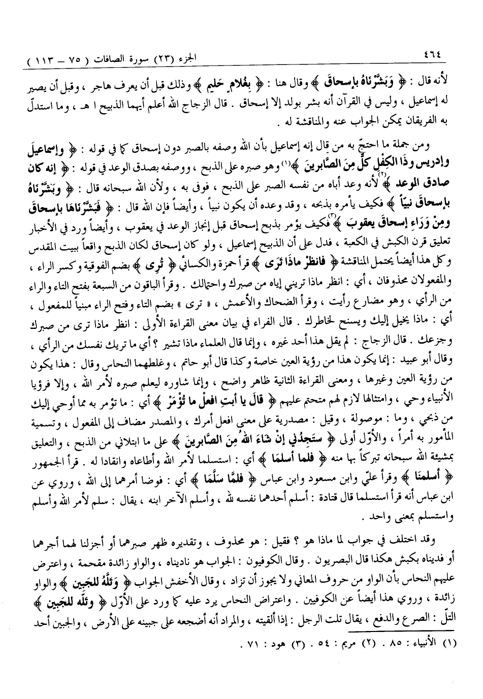 لِأَنَّهُ قَالَ: وَبَشَّرْناهُ بِإِسْحاقَ وَقَالَ هُنَا: بِغُلامٍ حَلِيمٍ وَذَلِكَ قَبْلَ أَنْ يَعْرِفَ هَاجَرَ، وَقَبْلَ أَنْ يَصِيرَ لَهُ إِسْمَاعِيلُ، وَلَيْسَ فِي الْقُرْآنِ أَنَّهُ بُشِّرَ بِوَلَدٍ إِلَّا إِسْحَاقَ. قَالَ الزَّجَّاجُ اللَّهُ أَعْلَمُ أَيُّهُمَا الذَّبِيحُ اه، وَمَا اسْتَدَلَّ بِهِ الْفَرِيقَانِ يُمْكِنُ الْجَوَابُ عَنْهُ وَالْمُنَاقَشَةُ لَهُ.