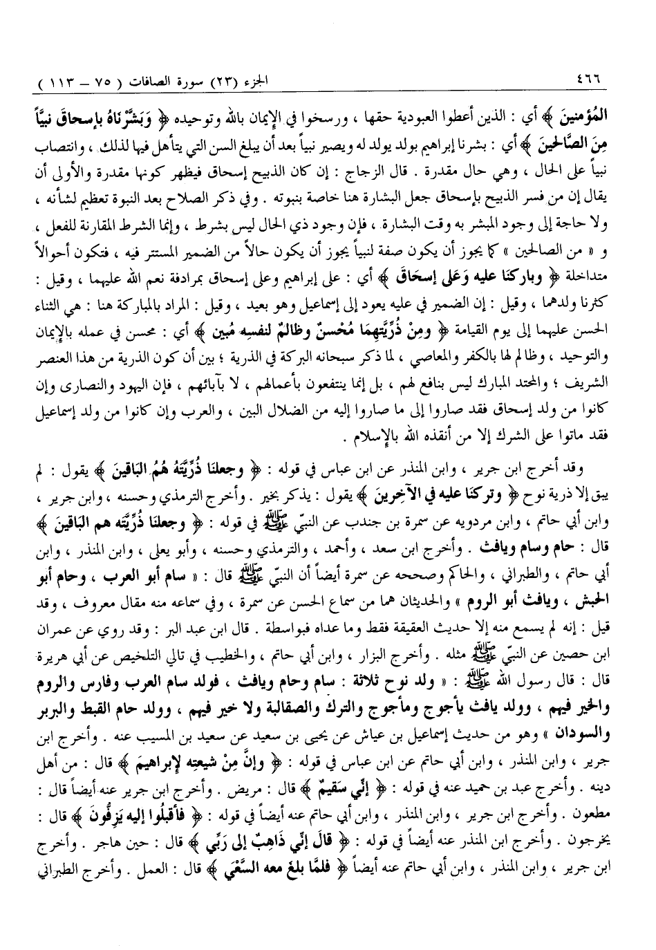 وَقَدْ أَخْرَجَ ابْنُ جَرِيرٍ، وَابْنُ الْمُنْذِرِ عَنِ ابْنِ عَبَّاسٍ فِي قَوْلِهِ: وَجَعَلْنا ذُرِّيَّتَهُ هُمُ الْباقِينَ يَقُولُ: لَمْ يُبْقِ إِلَّا ذُرِّيَّةَ نُوحٍ وَتَرَكْنا عَلَيْهِ فِي الْآخِرِينَ يَقُولُ: يُذْكَرُ بِخَيْرٍ. وَأَخْرَجَ التِّرْمِذِيُّ وَحَسَّنَهُ، وَابْنُ جَرِيرٍ، وَابْنُ أَبِي حَاتِمٍ، وَابْنُ مَرْدَوَيْهِ عَنِ سَمُرَةَ بْنِ جُنْدُبٍ عَنِ النَّبِيِّ صَلَّى اللَّهُ عَلَيْهِ وَسَلَّمَ فِي قَوْلِهِ: وَجَعَلْنا ذُرِّيَّتَهُ هُمُ الْباقِينَ قَالَ: حَامٌ وَسَامٌ وَيَافِثٌ. وَأَخْرَجَ ابْنُ سَعْدٍ، وَأَحْمَدُ، وَالتِّرْمِذِيُّ وَحَسَّنَهُ، وَأَبُو يَعْلَى، وَابْنُ الْمُنْذِرِ، وَابْنُ أَبِي حَاتِمٍ، وَالطَّبَرَانِيُّ، وَالْحَاكِمُ وَصَحَّحَهُ عَنْ سَمُرَةَ أَيْضًا أَنَّ النَّبِيَّ صَلَّى اللَّهُ عَلَيْهِ وَسَلَّمَ قَالَ: «سَامٌ أَبُو الْعَرَبِ، وَحَامٌ أَبُو الْحَبَشِ، وَيَافِثٌ أَبُو الرُّومِ» وَالْحَدِيثَانِ هُمَا مِنْ سَمَاعِ الْحَسَنِ عَنْ سَمُرَةَ، وَفِي سَمَاعِهِ مِنْهُ مَقَالٌ مَعْرُوفٌ، وَقَدْ قِيلَ: إِنَّهُ لَمْ يَسْمَعْ مِنْهُ إِلَّا حَدِيثَ الْعَقِيقَةِ فَقَطْ وَمَا عَدَاهُ فَبِوَاسِطَةٍ. قَالَ ابْنُ عَبْدِ الْبَرِّ: وَقَدْ رُوِيَ عن عمران ابن حصين عَنِ النَّبِيِّ صَلَّى اللَّهُ عَلَيْهِ وَسَلَّمَ مِثْلَهُ. وَأَخْرَجَ الْبَزَّارُ، وَابْنُ أَبِي حَاتِمٍ، وَالْخَطِيبُ فِي تَالِي التَّلْخِيصِ عَنْ أَبِي هُرَيْرَةَ قَالَ: قَالَ رَسُولُ اللَّهِ صَلَّى اللَّهُ عَلَيْهِ وَسَلَّمَ: «وَلَدُ نُوحٍ ثَلَاثَةٌ: سَامٌ وَحَامٌ وَيَافِثُ، فَوَلَدُ سَامٍ الْعَرَبُ وَفَارِسُ وَالرُّومُ وَالْخَيْرُ فِيهِمْ، وَوَلَدُ يَافِثَ يَأْجُوجُ وَمَأْجُوجُ وَالتُّرْكُ وَالصَّقَالِبَةُ وَلَا خَيْرَ فِيهِمْ، وَوَلَدُ حَامٍ الْقِبْطُ وَالْبَرْبَرُ وَالسُّودَانُ» وَهُوَ مِنْ حَدِيثِ إِسْمَاعِيلَ بْنِ عَيَّاشٍ عَنْ يَحْيَى بْنِ سَعِيدٍ عَنْ سَعِيدِ بْنِ الْمُسَيَّبِ عَنْهُ. وَأَخْرَجَ ابْنُ جَرِيرٍ، وَابْنُ الْمُنْذِرِ، وَابْنُ أَبِي حَاتِمٍ عَنِ ابْنِ عَبَّاسٍ فِي قَوْلِهِ: وَإِنَّ مِنْ شِيعَتِهِ لَإِبْراهِيمَ قَالَ: مِنْ أَهْلِ دينه. وَأَخْرَجَ عَبْدُ بْنُ حُمَيْدٍ عَنْهُ فِي قَوْلِهِ: إِنِّي سَقِيمٌ قَالَ: مَرِيضٌ. وَأَخْرَجَ ابْنُ جَرِيرٍ عَنْهُ أَيْضًا قَالَ: