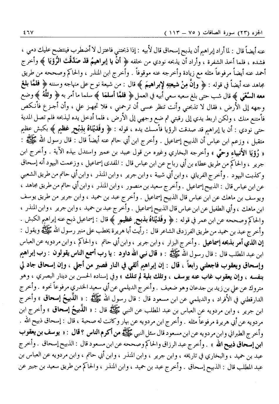 وَأَخْرَجَ الطَّبَرَانِيُّ وَابْنُ مَرْدَوَيْهِ عَنِ ابْنِ مَسْعُودٍ قَالَ سُئِلَ النَّبِيُّ صَلَّى اللَّهُ عَلَيْهِ وَسَلَّمَ مَنْ أَكْرَمُ النَّاسِ؟ قَالَ: «يُوسُفُ بْنُ يعقوب ابن إِسْحَاقَ ذَبِيحِ اللَّهِ» . وَأَخْرَجَ عَبْدُ الرَّزَّاقِ وَالْحَاكِمُ وَصَحَّحَهُ عَنِ ابْنِ مَسْعُودٍ قَالَ: الذَّبِيحُ إِسْحَاقُ. وَأَخْرَجَ عَبْدُ بْنُ حُمَيْدٍ، وَالْبُخَارِيُّ فِي تَارِيخِهِ، وَابْنُ جَرِيرٍ، وَابْنُ الْمُنْذِرِ، وَابْنُ أَبِي حَاتِمٍ، وَابْنُ مَرْدَوَيْهِ عَنِ الْعَبَّاسِ بْنِ عَبْدِ الْمُطَّلِبِ قَالَ: الذَّبِيحُ إِسْحَاقُ. وَأَخْرَجَ عَبْدُ بْنُ حُمَيْدٍ، وَابْنُ الْمُنْذِرِ، وَالْحَاكِمُ مِنْ طَرِيقِ سَعِيدِ بْنِ جُبَيْرٍ عَنِ