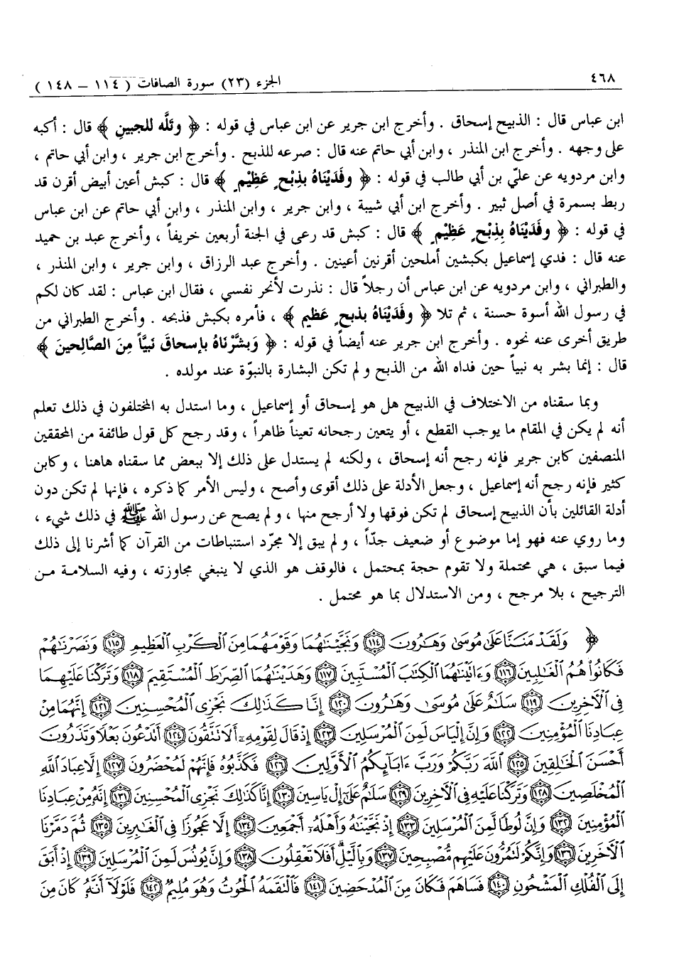 ابْنِ عَبَّاسٍ قَالَ: الذَّبِيحُ إِسْحَاقُ. وَأَخْرَجَ ابْنُ جَرِيرٍ عَنِ ابْنِ عَبَّاسٍ فِي قَوْلِهِ: وَتَلَّهُ لِلْجَبِينِ قَالَ: أَكَبَّهُ عَلَى وَجْهِهِ. وَأَخْرَجَ ابْنُ الْمُنْذِرِ، وَابْنُ أَبِي حَاتِمٍ عَنْهُ قَالَ: صَرَعَهُ لِلذَّبْحِ. وَأَخْرَجَ ابْنُ جَرِيرٍ، وَابْنُ أَبِي حَاتِمٍ، وَابْنُ مَرْدَوَيْهِ عَنْ عَلِيِّ بْنِ أَبِي طَالِبٍ فِي قَوْلِهِ: وَفَدَيْناهُ بِذِبْحٍ عَظِيمٍ قَالَ: كَبْشٌ أَعْيَنُ أَبْيَضُ أَقْرَنُ قَدْ رُبِطَ بِسَمُرَةٍ فِي أَصْلِ ثَبِيرٍ. وَأَخْرَجَ ابْنُ أَبِي شَيْبَةَ، وَابْنُ جَرِيرٍ، وَابْنُ الْمُنْذِرِ، وَابْنُ أَبِي حَاتِمٍ عَنِ ابْنِ عَبَّاسٍ فِي قَوْلِهِ: وَفَدَيْناهُ بِذِبْحٍ عَظِيمٍ قَالَ: كَبْشٌ قَدْ رَعَى فِي الْجَنَّةِ أَرْبَعِينَ خَرِيفًا، وَأَخْرَجَ عَبْدُ بْنُ حُمَيْدٍ عَنْهُ قَالَ: فُدِيَ إِسْمَاعِيلُ بِكَبْشَيْنِ أَمْلَحَيْنِ أَقْرَنَيْنِ أَعْيَنَيْنِ. وَأَخْرَجَ عَبْدُ الرَّزَّاقِ، وَابْنُ جَرِيرٍ، وَابْنُ الْمُنْذِرِ، وَالطَّبَرَانِيُّ، وَابْنُ مَرْدَوَيْهِ عَنِ ابْنِ عَبَّاسٍ أَنَّ رَجُلًا قَالَ: نَذَرْتُ لِأَنْحَرَ نَفْسِي، فَقَالَ ابْنُ عَبَّاسٍ: لَقَدْ كَانَ لَكُمْ فِي رَسُولِ اللَّهِ أُسْوَةٌ حَسَنَةٌ، ثُمَّ تَلَا وَفَدَيْناهُ بِذِبْحٍ عَظِيمٍ، فَأَمَرَهُ بِكَبْشٍ فَذَبَحَهُ. وَأَخْرَجَ الطَّبَرَانِيُّ مِنْ طَرِيقٍ أُخْرَى عَنْهُ نَحْوَهُ. وَأَخْرَجَ ابْنُ جَرِيرٍ عَنْهُ أَيْضًا فِي قَوْلِهِ: وَبَشَّرْناهُ بِإِسْحاقَ نَبِيًّا مِنَ الصَّالِحِينَ قَالَ: إِنَّمَا بُشِّرَ بِهِ نَبِيًّا حِينَ فَدَاهُ اللَّهُ مِنَ الذَّبْحِ وَلَمْ تَكُنِ الْبِشَارَةُ بِالنُّبُوَّةِ عِنْدَ مَوْلِدِهِ.