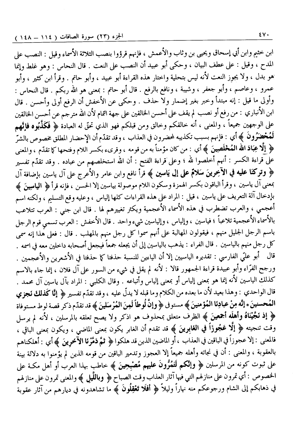 وَأَوْلَى مَا قِيلَ: إِنَّهُ مُبْتَدَأٌ وَخَبَرٌ بِغَيْرِ إِضْمَارٍ وَلَا حَذْفٍ. وَحُكِيَ عَنِ الْأَخْفَشِ أَنَّ الرَّفْعَ أَوْلَى وَأَحْسَنُ. قَالَ ابْنُ الْأَنْبَارِيِّ: مَنْ رَفَعَ أَوْ نَصَبَ لَمْ يَقِفْ عَلَى أَحْسَنِ الْخَالِقِينَ عَلَى جِهَةِ التَّمَامِ لِأَنَّ اللَّهَ مُتَرْجَمٌ عَنْ أَحْسَنِ الْخَالِقِينَ عَلَى الْوَجْهَيْنِ جَمِيعًا، وَالْمَعْنَى، أَنَّهُ خَالِقُكُمْ وخالق ومن قَبْلَكُمْ فَهُوَ الَّذِي تَحِقُّ لَهُ الْعِبَادَةُ فَكَذَّبُوهُ فَإِنَّهُمْ لَمُحْضَرُونَ أي: فإنهم بِسَبَبِ تَكْذِيبِهِ لَمُحْضَرُونَ فِي الْعَذَابِ، وَقَدْ تَقَدَّمَ أَنَّ الْإِحْضَارَ الْمُطْلَقَ مَخْصُوصٌ بِالشَّرِّ إِلَّا عِبادَ اللَّهِ الْمُخْلَصِينَ أَيْ: مَنْ كَانَ مُؤْمِنًا بِهِ من قومه، وقرئ بِكَسْرِ اللَّامِ وَفَتْحِهَا كَمَا تَقَدَّمَ، وَالْمَعْنَى عَلَى قِرَاءَةِ الْكَسْرِ: أَنَّهُمْ أَخْلَصُوا لِلَّهِ وَعَلَى قِرَاءَةِ الْفَتْحِ: أَنَّ اللَّهَ اسْتَخْلَصَهُمْ مِنْ عِبَادِهِ. وَقَدْ تَقَدَّمَ تَفْسِيرُ وَتَرَكْنا عَلَيْهِ فِي الْآخِرِينَ سَلامٌ عَلى إِلْ ياسِينَ قَرَأَ نَافِعٌ وَابْنُ عَامِرٍ والأعرج عَلَى آلِ يَاسِينَ بِإِضَافَةِ آلٍ بِمَعْنَى آلِ يَاسِينَ، وَقَرَأَ الْبَاقُونَ بِكَسْرِ الْهَمْزَةِ وَسُكُونِ اللَّامِ موصولة بياسين إِلَّا الْحَسَنَ، فَإِنَّهُ قَرَأَ «الْيَاسِينَ» بِإِدْخَالِ آلَةِ التَّعْرِيفِ عَلَى يَاسِينَ، قِيلَ: الْمُرَادُ عَلَى هَذِهِ الْقِرَاءَاتِ كُلِّهَا إِلْيَاسُ، وَعَلَيْهِ وَقَعَ التَّسْلِيمُ، وَلَكِنَّهُ اسْمٌ أَعْجَمِيٌّ، وَالْعَرَبُ تَضْطَرِبُ فِي هَذِهِ الْأَسْمَاءِ الْأَعْجَمِيَّةِ وَيَكْثُرُ تَغْيِيرُهُمْ لَهَا. قَالَ ابْنُ جِنِّيٍّ: العرب تتلاعب بالأسماء الأعجمية تلاعبا فياسين، وَإِلْيَاسُ، وَإِلْيَاسِينُ شَيْءٌ وَاحِدٌ. قَالَ الْأَخْفَشُ: الْعَرَبُ تُسَمِّي قَوْمَ الرَّجُلِ بِاسْمِ الرَّجُلِ الْجَلِيلِ مِنْهُمْ، فَيَقُولُونَ الْمَهَالِبَةُ عَلَى أَنَّهُمْ سَمَّوْا كُلَّ رَجُلٍ مِنْهُمْ بِالْمُهَلَّبِ. قَالَ: فَعَلَى هَذَا إِنَّهُ سَمَّى كُلَّ رَجُلٍ مِنْهُمْ بِالْيَاسِينِ. قَالَ الْفَرَّاءُ: يُذْهَبُ بِالْيَاسِينِ إِلَى أَنْ يَجْعَلَهُ جَمْعًا فَيُجْعَلُ أَصْحَابُهُ دَاخِلِينَ مَعَهُ فِي اسْمِهِ.