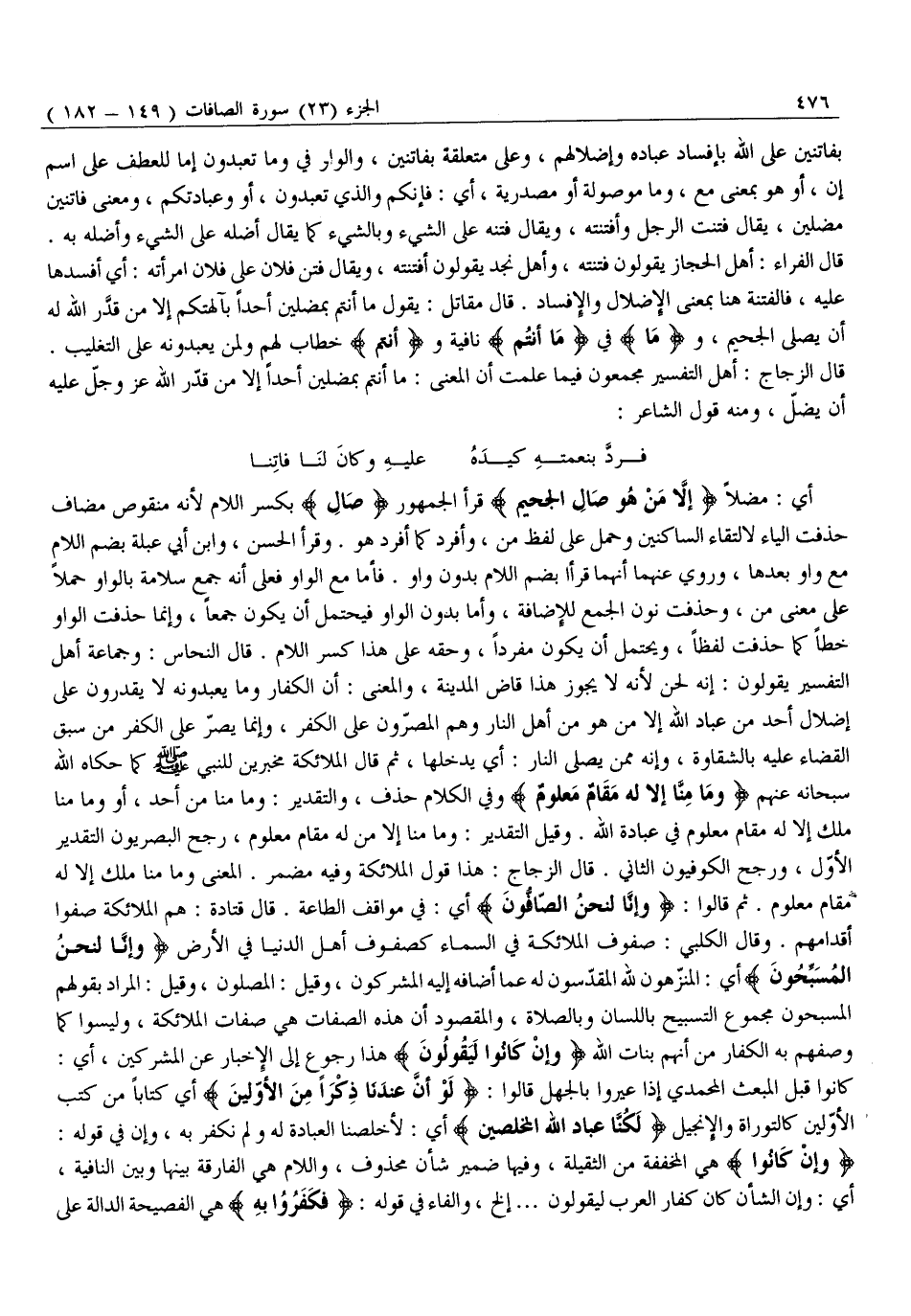 أَيْ: مُضِلًّا إِلَّا مَنْ هُوَ صالِ الْجَحِيمِ قَرَأَ الْجُمْهُورُ صالِ بِكَسْرِ اللَّامِ لِأَنَّهُ مَنْقُوصٌ مُضَافٌ حُذِفَتِ الْيَاءُ لِالْتِقَاءِ السَّاكِنَيْنِ وَحُمِلَ عَلَى لَفْظِ مَنْ، وَأُفْرِدَ كَمَا أُفْرِدَ هُوَ. وَقَرَأَ الْحَسَنُ، وَابْنُ أَبِي عَبْلَةَ بِضَمِّ اللَّامِ مع واو بعدها، وروي عنهما أنهما قرءا بِضَمِّ اللَّامِ بِدُونِ وَاوٍ. فَأَمَّا مَعَ الْوَاوِ فَعَلَى أَنَّهُ جَمْعُ سَلَامَةٍ بِالْوَاوِ حَمْلًا عَلَى مَعْنَى مَنْ، وَحُذِفَتْ نُونُ الْجَمْعِ لِلْإِضَافَةِ، وَأَمَّا بِدُونِ الْوَاوِ فَيَحْتَمِلُ أَنْ يَكُونَ جَمْعًا، وَإِنَّمَا حُذِفَتِ الْوَاوُ خَطًّا كَمَا حُذِفَتْ لَفْظًا، وَيَحْتَمِلُ أَنْ يَكُونَ مُفْرَدًا، وَحَقُّهُ عَلَى هَذَا كَسْرُ اللَّامِ. قَالَ النَّحَّاسُ: وَجَمَاعَةُ أَهْلِ التَّفْسِيرِ يَقُولُونَ: إِنَّهُ لَحْنٌ لِأَنَّهُ لَا يَجُوزُ هَذَا قَاضِ الْمَدِينَةِ، وَالْمَعْنَى: أَنَّ الْكُفَّارَ وَمَا يَعْبُدُونَهُ لَا يَقْدِرُونَ عَلَى إِضْلَالِ أَحَدٍ مِنْ عِبَادِ اللَّهِ إِلَّا مَنْ هُوَ مِنْ أَهْلِ النَّارِ وَهُمُ الْمُصِرُّونَ عَلَى الْكُفْرِ، وَإِنَّمَا يُصِرُّ عَلَى الْكُفْرِ مَنْ سَبَقَ الْقَضَاءُ عَلَيْهِ بِالشَّقَاوَةِ، وَإِنَّهُ مِمَّنْ يَصْلَى النَّارَ: أَيْ: يَدْخُلُهَا، ثُمَّ قَالَ الْمَلَائِكَةُ مخبرين للنبي صلّى الله عليه وَسَلَّمَ كَمَا حَكَاهُ اللَّهُ سُبْحَانَهُ عَنْهُمْ وَما مِنَّا إِلَّا لَهُ مَقامٌ مَعْلُومٌ وَفِي الْكَلَامِ حذف، والتقدير: وما منا من أَحَدٌ، أَوْ وَمَا مِنَّا مَلَكٌ إِلَّا لَهُ مَقَامٌ مَعْلُومٌ فِي عِبَادَةِ اللَّهِ. وَقِيلَ التَّقْدِيرُ: وَمَا مَنَّا إِلَّا مَنْ لَهُ مَقَامٌ مَعْلُومٌ، رَجَّحَ الْبَصْرِيُّونَ التَّقْدِيرَ الْأَوَّلَ، وَرَجَّحَ الْكُوفِيُّونَ الثَّانِيَ. قَالَ الزَّجَّاجُ: هَذَا قَوْلُ الْمَلَائِكَةِ وَفِيهِ مُضْمَرٌ. الْمَعْنَى وَمَا مِنَّا مَلَكٌ إِلَّا لَهُ مَقَامٌ مَعْلُومٌ. ثُمَّ قَالُوا: وَإِنَّا لَنَحْنُ الصَّافُّونَ أَيْ: فِي مَوَاقِفِ الطَّاعَةِ. قَالَ قَتَادَةُ: هُمُ الْمَلَائِكَةُ صَفُّوا أَقْدَامَهُمْ. وَقَالَ الْكَلْبِيُّ: صُفُوفُ الْمَلَائِكَةِ فِي السَّمَاءِ كَصُفُوفِ أَهْلِ الدُّنْيَا فِي الْأَرْضِ وَإِنَّا لَنَحْنُ الْمُسَبِّحُونَ أَيِ: الْمُنَزِّهُونَ لِلَّهِ الْمُقَدِّسُونَ لَهُ عَمَّا أَضَافَهُ إِلَيْهِ الْمُشْرِكُونَ، وَقِيلَ: الْمُصَلُّونَ، وَقِيلَ: الْمُرَادُ بِقَوْلِهِمُ الْمُسَبِّحُونَ مَجْمُوعُ التَّسْبِيحِ بِاللِّسَانِ وَبِالصَّلَاةِ، وَالْمَقْصُودُ أَنَّ هَذِهِ الصِّفَاتِ هِيَ صِفَاتُ الْمَلَائِكَةِ، وَلَيْسُوا كَمَا وَصَفَهُمْ بِهِ الْكُفَّارُ مِنْ أَنَّهُمْ بَنَاتُ اللَّهِ وَإِنْ كانُوا لَيَقُولُونَ هَذَا رُجُوعٌ إِلَى الْإِخْبَارِ عَنِ الْمُشْرِكِينَ، أَيْ:
