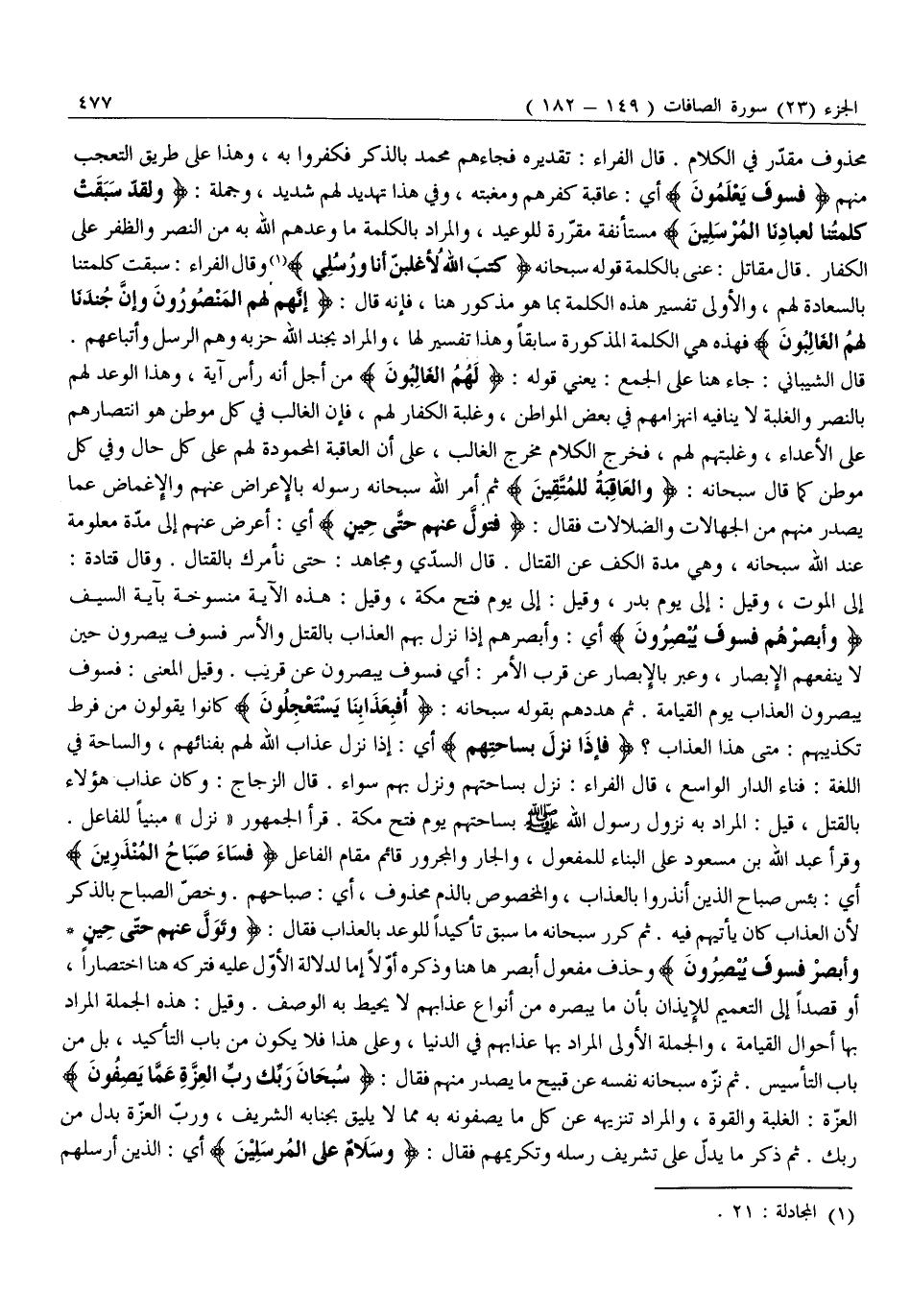 مَحْذُوفٍ مُقَدَّرٍ فِي الْكَلَامِ. قَالَ الْفَرَّاءُ: تَقْدِيرُهُ فَجَاءَهُمْ مُحَمَّدٌ بِالذِّكْرِ فَكَفَرُوا بِهِ، وَهَذَا عَلَى طَرِيقِ التَّعَجُّبِ مِنْهُمْ فَسَوْفَ يَعْلَمُونَ أَيْ: عَاقِبَةَ كُفْرِهِمْ وَمَغَبَّتَهُ، وَفِي هَذَا تَهْدِيدٌ لَهُمْ شَدِيدٌ، وَجُمْلَةُ: وَلَقَدْ سَبَقَتْ كَلِمَتُنا لِعِبادِنَا الْمُرْسَلِينَ مُسْتَأْنَفَةٌ مُقَرِّرَةٌ لِلْوَعِيدِ، وَالْمُرَادُ بِالْكَلِمَةِ مَا وَعَدَهُمُ اللَّهُ بِهِ مِنَ النَّصْرِ وَالظَّفَرِ عَلَى الْكُفَّارِ. قَالَ مُقَاتِلٌ: عَنَى بِالْكَلِمَةِ قَوْلَهُ سُبْحَانَهُ كَتَبَ اللَّهُ لَأَغْلِبَنَّ أَنَا وَرُسُلِي «1» وَقَالَ الْفَرَّاءُ: سَبَقَتْ كَلِمَتُنَا بِالسَّعَادَةِ لَهُمْ، وَالْأُولَى تَفْسِيرُ هَذِهِ الْكَلِمَةِ بِمَا هُوَ مَذْكُورٌ هُنَا، فَإِنَّهُ قَالَ: إِنَّهُمْ لَهُمُ الْمَنْصُورُونَ وَإِنَّ جُنْدَنا لَهُمُ الْغالِبُونَ فهذه هي الْكَلِمَةُ الْمَذْكُورَةُ سَابِقًا وَهَذَا تَفْسِيرٌ لَهَا، وَالْمُرَادُ بِجُنْدِ اللَّهِ حِزْبُهُ وَهُمُ الرُّسُلُ وَأَتْبَاعُهُمْ.