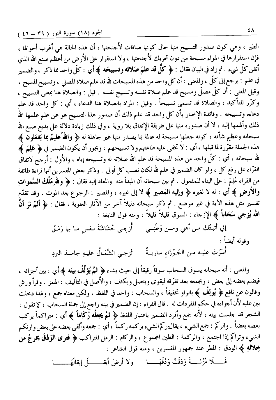 الطَّيْرِ، وَهِيَ كَوْنُ صُدُورِ التَّسْبِيحِ مِنْهَا حَالَ كونها صافات لأجنحتها، أن هَذِهِ الْحَالَةَ هِيَ أَغْرَبُ أَحْوَالِهَا، فَإِنَّ اسْتِقْرَارَهَا فِي الْهَوَاءِ مُسَبِّحَةً مِنْ دُونِ تَحْرِيكٍ لِأَجْنِحَتِهَا، وَلَا اسْتِقْرَارٍ عَلَى الْأَرْضِ مِنْ أَعْظَمِ صُنْعِ اللَّهِ الَّذِي أَتْقَنَ كُلَّ شَيْءٍ. ثُمَّ زَادَ فِي الْبَيَانِ فَقَالَ: كُلٌّ قَدْ عَلِمَ صَلاتَهُ وَتَسْبِيحَهُ أَيْ: كُلُّ وَاحِدٍ مِمَّا ذُكِرَ، وَالضَّمِيرُ فِي عَلِمَ: يَرْجِعُ إِلَى كُلٍّ، وَالْمَعْنَى: أَنَّ كُلَّ وَاحِدٍ مِنْ هَذِهِ الْمُسَبِّحَاتِ لِلَّهِ قَدْ عَلِمَ صَلَاةَ الْمُصَلِّي، وَتَسْبِيحَ الْمُسَبِّحِ، وَقِيلَ الْمَعْنَى: أَنَّ كُلَّ مُصَلٍّ وَمُسَبِّحٍ قَدْ عَلِمَ صَلَاةَ نَفْسِهِ وَتَسْبِيحَ نَفْسِهِ. قِيلَ: وَالصَّلَاةُ هُنَا بِمَعْنَى التَّسْبِيحِ، وَكُرِّرَ لِلتَّأْكِيدِ، وَالصَّلَاةُ قَدْ تُسَمَّى تَسْبِيحًا. وَقِيلَ: الْمُرَادُ بِالصَّلَاةِ هُنَا الدُّعَاءُ، أَيْ: كُلُّ وَاحِدٍ قَدْ عَلِمَ دُعَاءَهُ وَتَسْبِيحَهُ. وَفَائِدَةُ الْإِخْبَارِ بِأَنَّ كُلَّ وَاحِدٍ قَدْ عَلِمَ ذَلِكَ أَنَّ صدور هذا التسبيح هو عن علم علمها الله ذلك وألهمها إليه، لا أَنَّ صُدُورَهُ مِنْهَا عَلَى طَرِيقَةِ الِاتِّفَاقِ بِلَا رَوِيَّةٍ، وَفِي ذَلِكَ زِيَادَةُ دَلَالَةٍ عَلَى بَدِيعِ صُنْعِ اللَّهِ سُبْحَانَهُ وَعَظِيمِ شَأْنِهِ، كَوْنُهُ جَعَلَهَا مُسَبِّحَةً لَهُ عَالِمَةً بِمَا يَصْدُرُ مِنْهَا غَيْرَ جَاهِلَةٍ لَهُ وَاللَّهُ عَلِيمٌ بِما يَفْعَلُونَ هَذِهِ الْجُمْلَةُ مُقَرِّرَةٌ لِمَا قَبْلَهَا، أَيْ: لَا تَخْفَى عَلَيْهِ طَاعَتُهُمْ وَلَا تَسْبِيحُهُمْ، وَيَجُوزُ أَنْ يَكُونَ الضَّمِيرُ فِي عَلِمَ لِلَّهِ سُبْحَانَهُ، أَيْ: كُلُّ وَاحِدٍ مِنْ هَذِهِ الْمُسَبِّحَةِ قَدْ عَلِمَ اللَّهُ صلاته له وَتَسْبِيحَهُ إِيَّاهُ، وَالْأَوَّلُ: أَرْجَحُ لِاتِّفَاقِ الْقُرَّاءِ عَلَى رَفْعِ كُلٌّ، وَلَوْ كَانَ الضَّمِيرُ فِي عَلِمَ لِلَّهِ لَكَانَ نَصْبُ كُلٌّ أَوْلَى. وَذَكَرَ بَعْضُ الْمُفَسِّرِينَ أَنَّهَا قِرَاءَةُ طَائِفَةٍ مِنَ الْقُرَّاءِ عُلِمَ: عَلَى الْبِنَاءِ لِلْمَفْعُولِ. ثُمَّ بَيَّنَ سُبْحَانَهُ أَنَّ الْمَبْدَأَ مِنْهُ وَالْمَعَادَ إِلَيْهِ فَقَالَ: وَلِلَّهِ مُلْكُ السَّماواتِ وَالْأَرْضِ أي: له لا لغيره وَإِلَى اللَّهِ الْمَصِيرُ لَا إِلَى غَيْرِهِ، وَالْمَصِيرُ: الرُّجُوعُ بَعْدَ الْمَوْتِ. وَقَدْ تَقَدَّمَ تَفْسِيرُ مِثْلِ هَذِهِ الْآيَةِ فِي غَيْرِ مَوْضِعٍ. ثُمَّ ذَكَرَ سُبْحَانَهُ دَلِيلًا آخَرَ مِنَ الْآثَارِ الْعُلْوِيَّةِ، فَقَالَ: أَلَمْ تَرَ أَنَّ اللَّهَ يُزْجِي سَحاباً الْإِزْجَاءُ: السَّوْقُ قَلِيلًا قَلِيلًا، وَمِنْهُ قَوْلُ النَّابِغَةِ:
