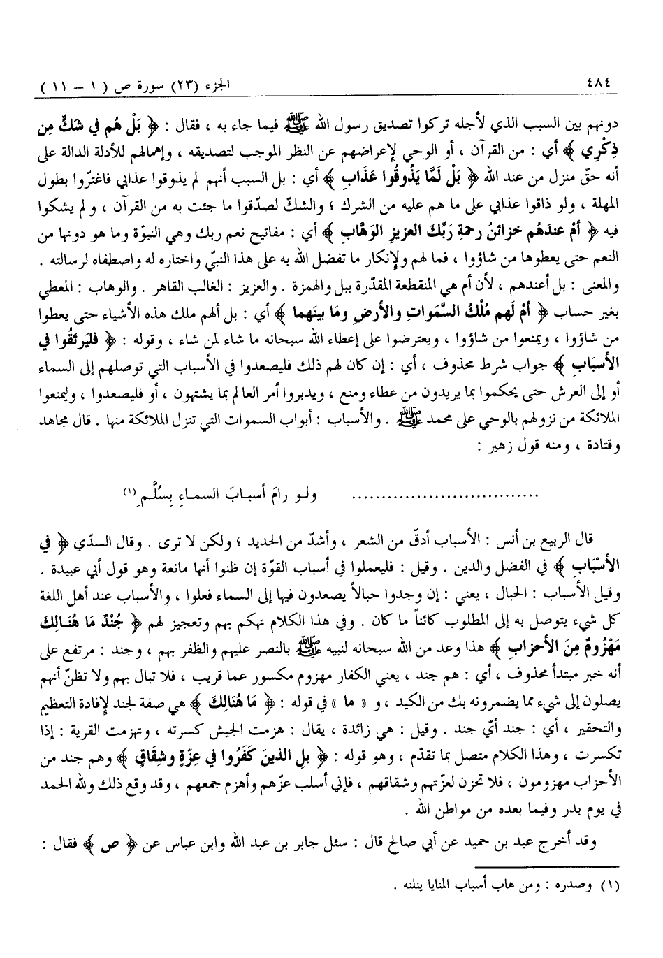 وَقِيلَ الْأَسْبَابُ: الْحِبَالُ، يَعْنِي: إِنْ وَجَدُوا حِبَالًا يَصْعَدُونَ فِيهَا إِلَى السَّمَاءِ فَعَلُوا، وَالْأَسْبَابُ عِنْدَ أَهْلِ اللُّغَةِ كُلُّ شَيْءٍ يُتَوَصَّلُ بِهِ إِلَى الْمَطْلُوبِ كَائِنًا مَا كَانَ. وَفِي هَذَا الْكَلَامِ تَهَكُّمٌ بِهِمْ وَتَعْجِيزٌ لَهُمْ جُنْدٌ مَا هُنالِكَ مَهْزُومٌ مِنَ الْأَحْزابِ هَذَا وَعْدٌ مِنَ اللَّهِ سُبْحَانَهُ لِنَبِيِّهِ صَلَّى اللَّهُ عَلَيْهِ وَسَلَّمَ بالنصر عليهم والظفر بهم، وجند: مُرْتَفِعٌ عَلَى أَنَّهُ خَبَرُ مُبْتَدَأٍ مَحْذُوفٍ، أَيْ: هُمْ جُنْدٌ، يَعْنِي الْكُفَّارَ مَهْزُومٌ مَكْسُورٌ عَمَّا قَرِيبٍ، فَلَا تُبَالِ بِهِمْ وَلَا تَظُنَّ أَنَّهُمْ يَصِلُونَ إِلَى شَيْءٍ مِمَّا يُضْمِرُونَهُ بِكَ مِنَ الْكَيْدِ، وَ «مَا» فِي قَوْلِهِ: مَا هُنالِكَ هي صفة لجند لِإِفَادَةِ التَّعْظِيمِ وَالتَّحْقِيرِ، أَيْ: جُنْدٌ أَيُّ جُنْدٍ. وَقِيلَ: هِيَ زَائِدَةٌ، يُقَالُ: هَزَمْتَ الْجَيْشَ كَسَرْتَهُ، وَتَهَزَّمَتِ الْقَرْيَةُ: إِذَا تَكَسَّرَتْ، وَهَذَا الْكَلَامُ مُتَّصِلٌ بِمَا تَقَدَّمَ، وَهُوَ قَوْلُهُ: بَلِ الَّذِينَ كَفَرُوا فِي عِزَّةٍ وَشِقاقٍ وَهُمْ جُنْدٌ مِنَ الْأَحْزَابِ مَهْزُومُونَ، فَلَا تَحْزَنْ لِعِزَّتِهِمْ وَشِقَاقِهِمْ، فَإِنِّي أَسْلُبُ عِزَّهُمْ وَأَهْزِمُ جَمْعَهُمْ، وَقَدْ وَقَعَ ذَلِكَ وَلِلَّهِ الحمد في يوم بَدْرٍ وَفِيمَا بَعْدَهُ مِنْ مُوَاطِنِ اللَّهِ.