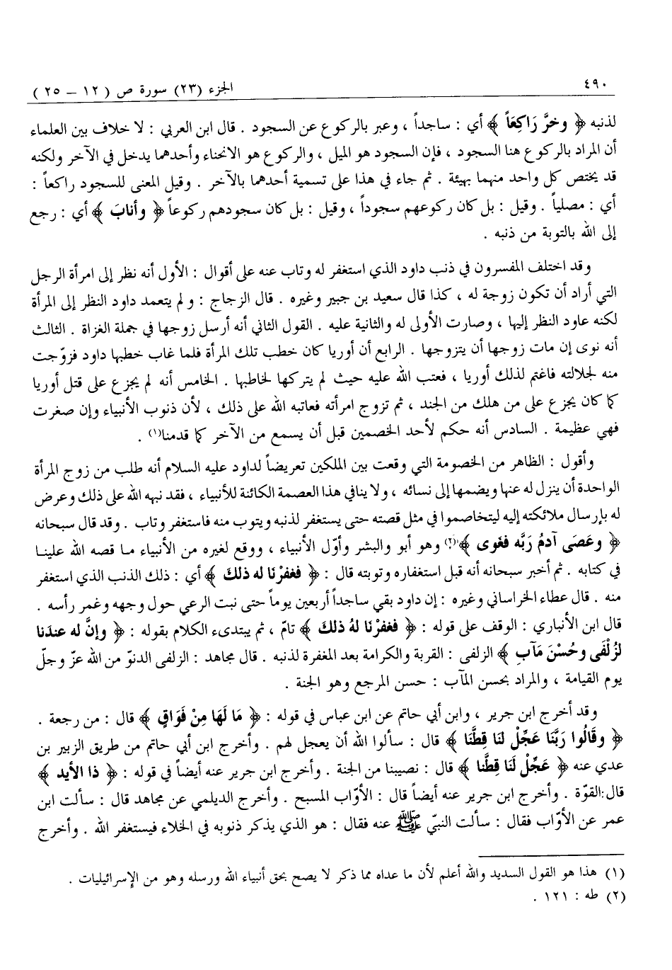 وَقَدِ اخْتَلَفَ الْمُفَسِّرُونَ فِي ذَنْبِ دَاوُدَ الَّذِي اسْتَغْفَرَ لَهُ وَتَابَ عَنْهُ عَلَى أَقْوَالٍ: الْأَوَّلُ أَنَّهُ نَظَرَ إِلَى امْرَأَةِ الرَّجُلِ الَّتِي أَرَادَ أَنْ تَكُونَ زَوْجَةً لَهُ، كَذَا قَالَ سَعِيدُ بْنُ جُبَيْرٍ وَغَيْرُهُ. قَالَ الزَّجَّاجُ: وَلَمْ يَتَعَمَّدْ دَاوُدُ النَّظَرَ إِلَى الْمَرْأَةِ لَكِنَّهُ عَاوَدَ النَّظَرَ إِلَيْهَا، وَصَارَتِ الْأُولَى لَهُ وَالثَّانِيَةُ عَلَيْهِ. الْقَوْلُ الثَّانِي أَنَّهُ أَرْسَلَ زَوْجَهَا فِي جُمْلَةِ الْغُزَاةِ. الثَّالِثُ أَنَّهُ نَوَى إِنْ مَاتَ زَوْجُهَا أَنْ يَتَزَوَّجَهَا. الرَّابِعُ أَنَّ أُورِيَا كَانَ خَطَبَ تِلْكَ الْمَرْأَةَ فَلَمَّا غَابَ خَطَبَهَا دَاوُدُ فَزُوِّجَتْ مِنْهُ لِجَلَالَتِهِ فَاغْتَمَّ لِذَلِكَ أُورِيَا، فَعَتَبَ اللَّهُ عَلَيْهِ حَيْثُ لَمْ يَتْرُكْهَا لِخَاطِبِهَا. الْخَامِسُ أَنَّهُ لَمْ يَجْزَعْ عَلَى قَتْلِ أُورِيَا كَمَا كَانَ يَجْزَعُ عَلَى مَنْ هَلَكَ مِنَ الْجُنْدِ، ثُمَّ تَزَوَّجَ امْرَأَتَهُ فَعَاتَبَهُ اللَّهُ عَلَى ذَلِكَ، لِأَنَّ ذُنُوبَ الْأَنْبِيَاءِ وَإِنْ صَغُرَتْ فَهِيَ عَظِيمَةٌ. السَّادِسُ أَنَّهُ حَكَمَ لِأَحَدِ الْخَصْمَيْنِ قَبْلَ أَنْ يَسْمَعَ مِنَ الْآخَرِ كَمَا قَدَّمْنَا «1» .