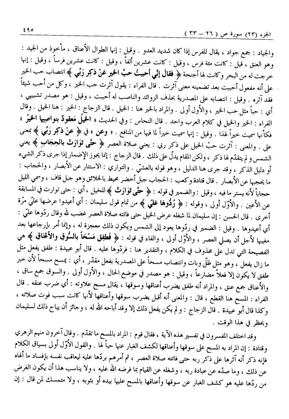 وَهُوَ الْعُنُقُ، قِيلَ: كَانَتْ مِائَةَ فَرَسٍ، وَقِيلَ: كَانَتْ عِشْرِينَ أَلْفًا، وَقِيلَ: كَانَتْ عِشْرِينَ فَرَسًا، وَقِيلَ: إِنَّهَا خَرَجَتْ لَهُ مِنَ الْبَحْرِ وَكَانَتْ لَهَا أَجْنِحَةٌ فَقالَ إِنِّي أَحْبَبْتُ حُبَّ الْخَيْرِ عَنْ ذِكْرِ رَبِّي انْتِصَابُ حُبَّ الْخَيْرِ عَلَى أَنَّهُ مَفْعُولُ أَحْبَبْتُ بَعْدَ تَضْمِينِهِ مَعْنَى آثَرْتُ. قَالَ الْفَرَّاءُ: يَقُولُ آثَرْتُ حُبَّ الْخَيْرِ، وَكُلُّ مَنْ أَحَبَّ شَيْئًا فَقَدْ آثَرَهُ. وَقِيلَ: انْتِصَابُهُ عَلَى الْمَصْدَرِيَّةِ بِحَذْفِ الزَّوَائِدِ وَالنَّاصِبُ لَهُ أَحْبَبْتُ، وَقِيلَ: هُوَ مَصْدَرٌ تَشْبِيهِيٌّ، أَيْ: حُبًّا مِثْلَ حُبِّ الْخَيْرِ، وَالْأَوَّلُ أَوْلَى. وَالْمُرَادُ بِالْخَيْرِ هُنَا: الْخَيْلُ. قَالَ الزَّجَّاجُ: الْخَيْرُ: هُنَا الْخَيْلُ. وَقَالَ الْفَرَّاءُ: الْخَيْرُ وَالْخَيْلُ فِي كَلَامِ الْعَرَبِ وَاحِدٌ. قَالَ النَّحَّاسُ: وَفِي الْحَدِيثِ «الْخَيْلُ مَعْقُودٌ بِنَوَاصِيهَا الْخَيْرُ» فَكَأَنَّهَا سُمِّيَتْ خَيْرًا لِهَذَا. وَقِيلَ: إِنَّهَا سُمِّيَتْ خَيْرًا لِمَا فيها من المنافع. «وعن» فِي عَنْ ذِكْرِ رَبِّي بِمَعْنَى عَلَى. وَالْمَعْنَى: آثَرْتُ حُبَّ الْخَيْلِ عَلَى ذِكْرِ رَبِّي: يَعْنِي صَلَاةَ الْعَصْرِ حَتَّى تَوارَتْ بِالْحِجابِ يَعْنِي الشَّمْسَ وَلَمْ يَتَقَدَّمْ لَهَا ذِكْرٌ، وَلَكِنَّ الْمَقَامَ يَدُلُّ عَلَى ذَلِكَ. قَالَ الزَّجَّاجُ: إِنَّمَا يَجُوزُ الْإِضْمَارُ إِذَا جَرَى ذِكْرُ الشَّيْءِ أَوْ دَلِيلُ الذِّكْرِ، وَقَدْ جَرَى هُنَا الدَّلِيلُ، وَهُوَ قَوْلُهُ بِالْعَشِيِّ. وَالتَّوَارِي: الِاسْتِتَارُ عَنِ الْأَبْصَارِ، وَالْحِجَابُ: