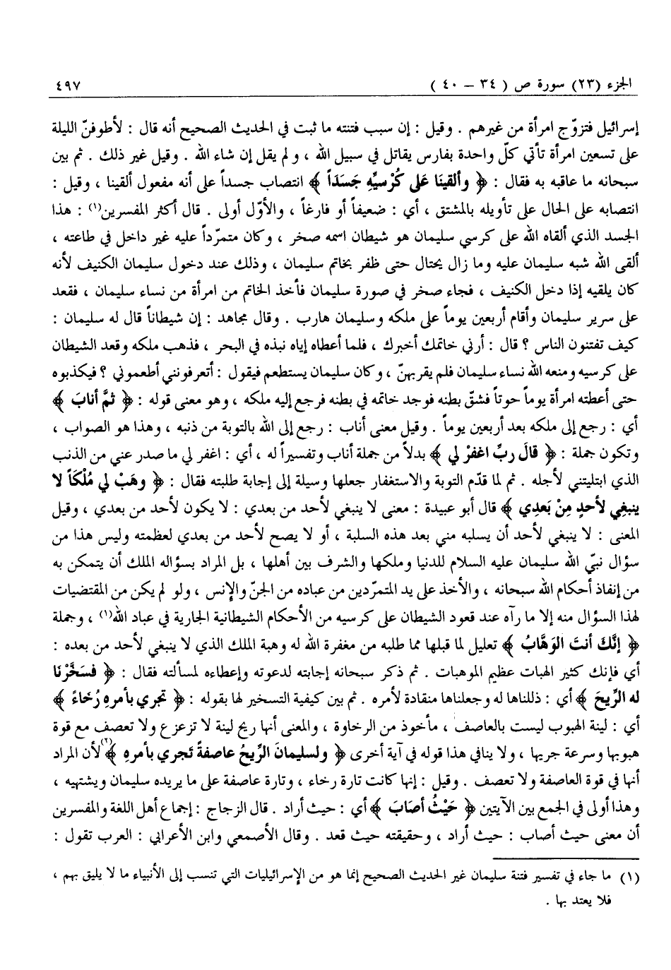 إِسْرَائِيلَ فَتَزَوَّجَ امْرَأَةً مِنْ غَيْرِهِمْ. وَقِيلَ: إِنَّ سَبَبَ فِتْنَتِهِ مَا ثَبَتَ فِي الْحَدِيثِ الصَّحِيحِ أَنَّهُ قَالَ: لَأَطُوفَنَّ اللَّيْلَةَ عَلَى تِسْعِينَ امْرَأَةً تَأْتِي كُلُّ وَاحِدَةٍ بِفَارِسٍ يُقَاتِلُ فِي سَبِيلِ اللَّهِ، وَلَمْ يَقِلْ إِنْ شَاءَ اللَّهُ. وَقِيلَ غَيْرُ ذَلِكَ. ثُمَّ بَيَّنَ سُبْحَانَهُ مَا عَاقَبَهُ بِهِ فَقَالَ: وَأَلْقَيْنا عَلى كُرْسِيِّهِ جَسَداً انْتِصَابُ جَسَدًا عَلَى أَنَّهُ مَفْعُولُ أَلْقَيْنَا، وَقِيلَ: