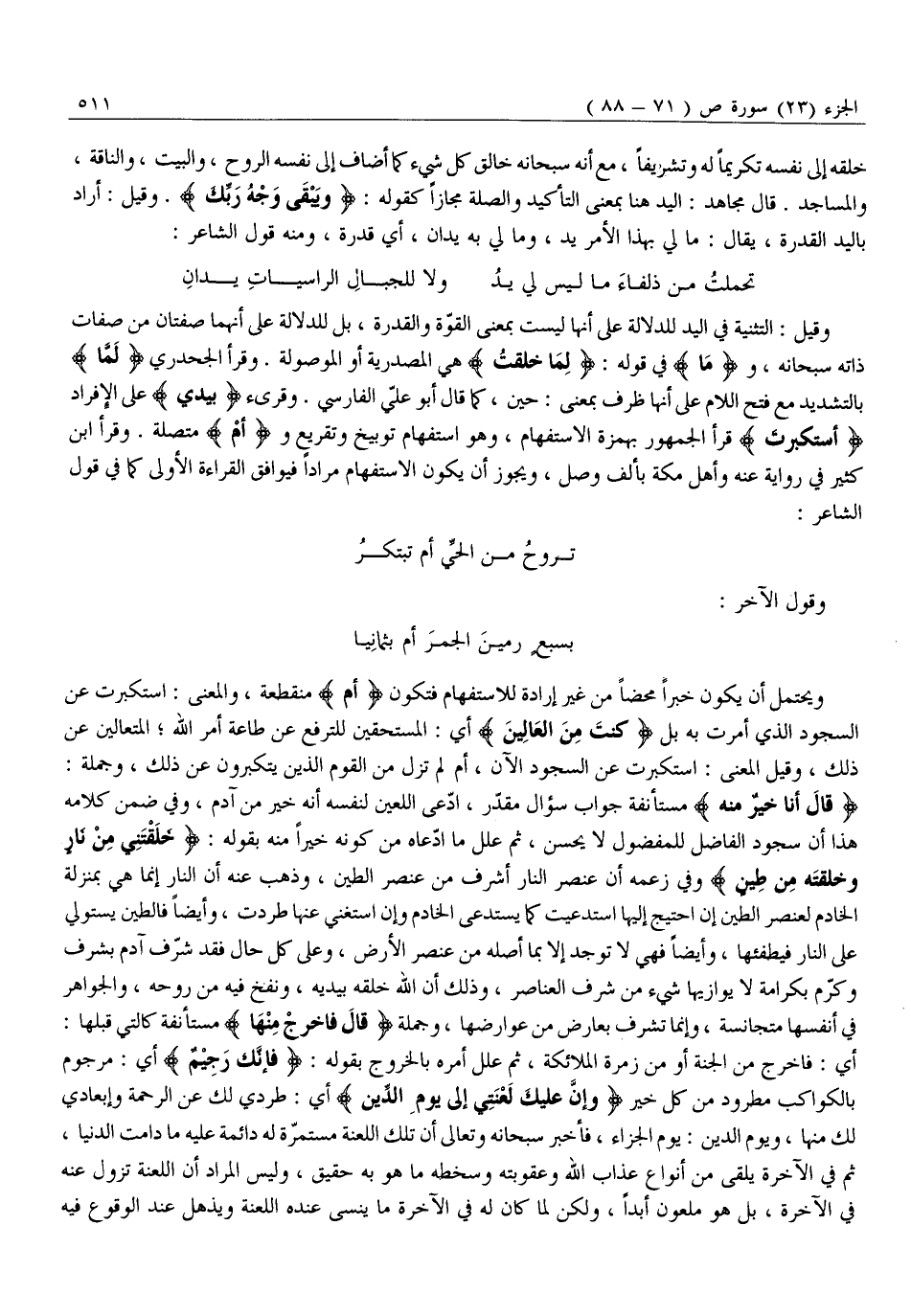 وَقِيلَ: التَّثْنِيَةُ فِي الْيَدِ لِلدَّلَالَةِ على أنها ليست بِمَعْنَى الْقُوَّةِ وَالْقُدْرَةِ، بَلْ لِلدَّلَالَةِ عَلَى أَنَّهُمَا صِفَتَانِ مِنْ صِفَاتِ ذَاتِهِ سُبْحَانَهُ، وَ «مَا» فِي قَوْلِهِ: لِما خَلَقْتُ هِيَ الْمَصْدَرِيَّةُ أَوِ الْمَوْصُولَةُ. وَقَرَأَ الْجَحْدَرِيُّ «لَمَّا» بِالتَّشْدِيدِ مَعَ فَتْحِ اللَّامِ عَلَى أَنَّهَا ظَرْفٌ بِمَعْنَى: حِينَ، كَمَا قَالَ أَبُو عَلِيٍّ الْفَارِسِيُّ. وَقُرِئَ «بِيَدِي» عَلَى الْإِفْرَادِ أَسْتَكْبَرْتَ قَرَأَ الْجُمْهُورُ بِهَمْزَةِ الِاسْتِفْهَامِ، وَهُوَ استفهام توبيخ وتقريع وأَمْ مُتَّصِلَةٌ. وَقَرَأَ ابْنُ كَثِيرٍ فِي رِوَايَةٍ عَنْهُ وَأَهْلُ مَكَّةَ بِأَلِفِ وَصْلٍ، وَيَجُوزُ أَنْ يَكُونَ الِاسْتِفْهَامُ مُرَادًا فَيُوَافِقُ الْقِرَاءَةَ الْأُولَى كَمَا فِي قَوْلِ الشَّاعِرِ: