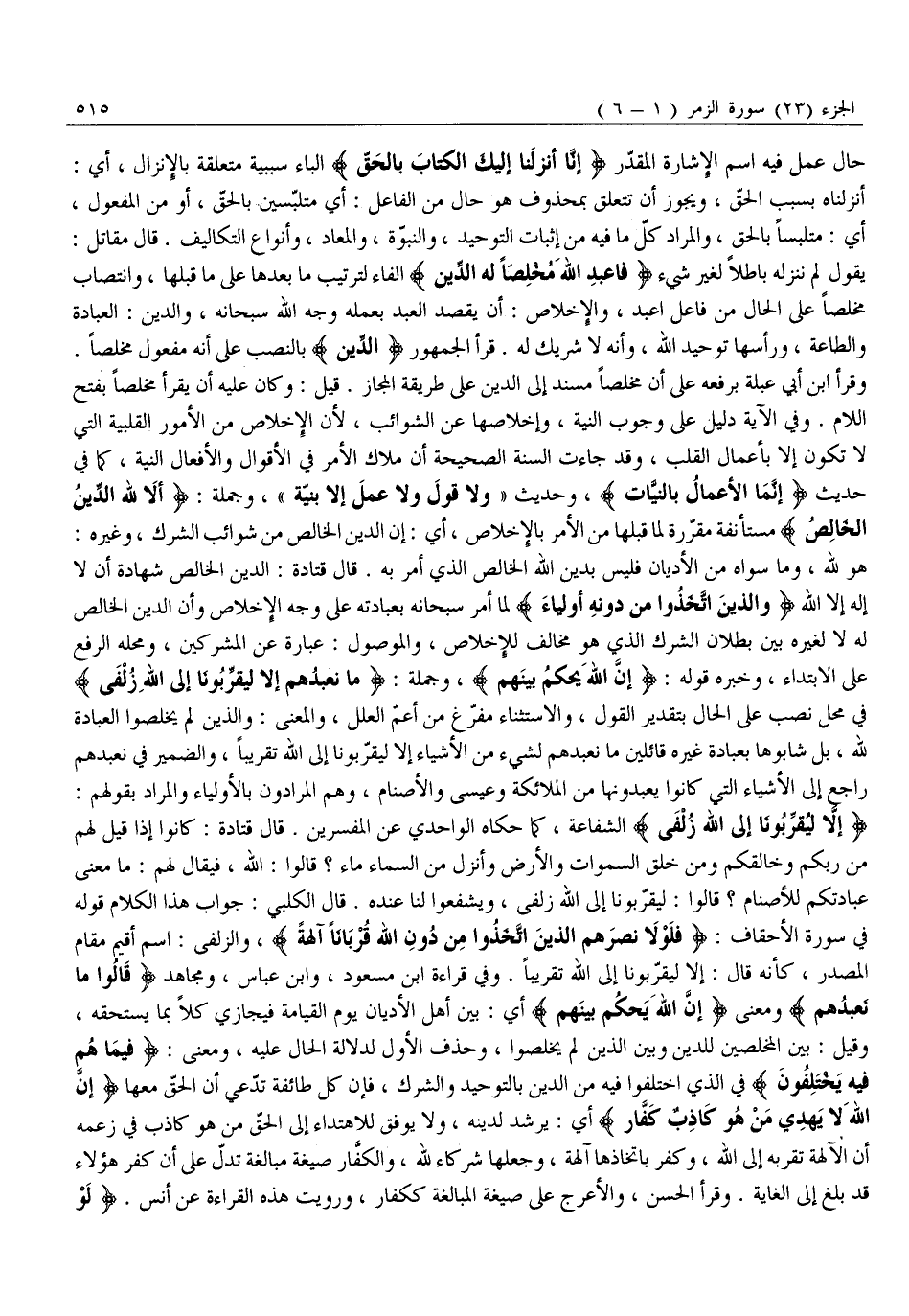 وَقَرَأَ ابْنُ أَبِي عَبْلَةَ بِرَفْعِهِ عَلَى أَنَّ مُخْلِصًا مُسْنَدٌ إِلَى الدِّينَ عَلَى طَرِيقَةِ الْمَجَازِ. قِيلَ: وَكَانَ عَلَيْهِ أَنْ يَقْرَأَ مُخْلِصًا بِفَتْحِ اللَّامِ. وَفِي الْآيَةِ دَلِيلٌ عَلَى وُجُوبِ النِّيَّةِ، وَإِخْلَاصِهَا عَنِ الشَّوَائِبِ، لِأَنَّ الْإِخْلَاصَ مِنَ الْأُمُورِ الْقَلْبِيَّةِ الَّتِي لَا تَكُونُ إِلَّا بِأَعْمَالِ الْقَلْبِ، وَقَدْ جَاءَتِ السُّنَّةُ الصَّحِيحَةُ أَنَّ مَلَاكَ الْأَمْرِ فِي الْأَقْوَالِ وَالْأَفْعَالِ النِّيَّةُ، كَمَا في حديث «إنّما الأعمال بالنيّات» ، وحديث «ولا قَوْلَ وَلَا عَمَلَ إِلَّا بِنِيَّةٍ» ، وَجُمْلَةُ: أَلا لِلَّهِ الدِّينُ الْخالِصُ مُسْتَأْنَفَةٌ مُقَرِّرَةٌ لِمَا قَبْلَهَا مِنَ الْأَمْرِ بِالْإِخْلَاصِ، أَيْ: إِنِ الدِّينَ الْخَالِصَ مِنْ شَوَائِبِ الشِّرْكِ، وَغَيْرِهِ: