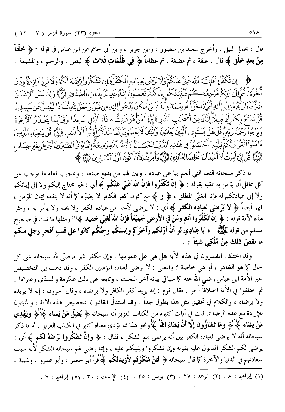 ثُمَّ اخْتَلَفُوا فِي الْآيَةِ اخْتِلَافًا آخَرَ. فَقَالَ قَوْمٌ: إِنَّهُ يُرِيدُ كُفْرَ الْكَافِرِ وَلَا يَرْضَاهُ، وَقَالَ آخَرُونَ: إِنَّهُ لَا يُرِيدُهُ وَلَا يَرْضَاهُ، وَالْكَلَامُ فِي تَحْقِيقِ مِثْلِ هَذَا يَطُولُ جِدًّا. وَقَدِ اسْتَدَلَّ الْقَائِلُونَ بِتَخْصِيصِ هَذِهِ الْآيَةِ، وَالْمُثْبِتُونَ لِلْإِرَادَةِ مَعَ عَدَمِ الرِّضَا بِمَا ثَبَتَ فِي آيَاتٍ كَثِيرَةٍ مِنِ الْكِتَابِ الْعَزِيزِ أَنَّهُ سُبْحَانَهُ يُضِلُّ مَنْ يَشاءُ «2» وَيَهْدِي مَنْ يَشاءُ «3» وَما تَشاؤُنَ إِلَّا أَنْ يَشاءَ اللَّهُ «4» وَنَحْوُ هَذَا مِمَّا يُؤَدِّي مَعْنَاهُ كَثِيرٌ فِي الْكِتَابِ الْعَزِيزِ. ثُمَّ لَمَّا ذَكَرَ سُبْحَانَهُ أَنَّهُ لَا يَرْضَى لِعِبَادِهِ الْكُفْرَ بَيَّنَ أَنَّهُ يَرْضَى لَهُمُ الشُّكْرَ، فَقَالَ: وَإِنْ تَشْكُرُوا يَرْضَهُ لَكُمْ أَيْ: