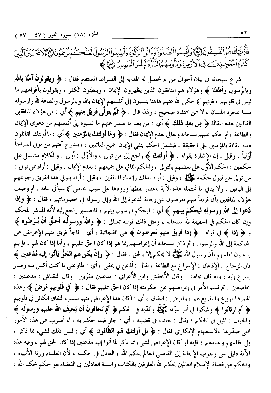 مَنْ تَوَلَّى عَنْ قَبُولِ حُكْمِهِ صَلَّى اللَّهُ عليه وَسَلَّمَ، وَقِيلَ: أَرَادَ بِذَلِكَ رُؤَسَاءَ الْمُنَافِقِينَ، وَقِيلَ: أَرَادَ بِتَوَلِّي هَذَا الْفَرِيقِ رُجُوعَهُمْ إِلَى الْبَاقِينَ، وَلَا يُنَافِي مَا تَحْتَمِلُهُ هَذِهِ الْآيَةُ بِاعْتِبَارِ لَفْظِهَا وُرُودِهَا عَلَى سَبَبٍ خَاصٍّ كَمَا سَيَأْتِي بَيَانُهُ. ثُمَّ وَصَفَ هَؤُلَاءِ الْمُنَافِقِينَ بِأَنَّ فَرِيقًا مِنْهُمْ يُعْرِضُونَ عَنْ إِجَابَةِ الدَّعْوَةِ إِلَى اللَّهِ وَإِلَى رَسُولِهِ فِي خُصُومَاتِهِمْ، فَقَالَ: وَإِذا دُعُوا إِلَى اللَّهِ وَرَسُولِهِ لِيَحْكُمَ بَيْنَهُمْ أَيْ: لِيَحْكُمَ الرَّسُولُ بَيْنَهُمْ، فَالضَّمِيرُ رَاجِعٌ إِلَيْهِ لِأَنَّهُ الْمُبَاشِرُ لِلْحُكْمِ وَإِنْ كَانَ الْحُكْمُ فِي الْحَقِيقَةِ لِلَّهِ سُبْحَانَهُ، وَمِثْلُ ذَلِكَ قَوْلُهُ تَعَالَى: وَاللَّهُ وَرَسُولُهُ أَحَقُّ أَنْ يُرْضُوهُ وإِذا فِي قَوْلِهِ: إِذا فَرِيقٌ مِنْهُمْ مُعْرِضُونَ هِيَ الْفُجَائِيَّةُ، أَيْ: فَاجَأَ فَرِيقٌ مِنْهُمُ الْإِعْرَاضَ عَنِ الْمُحَاكَمَةِ إِلَى اللَّهِ وَالرَّسُولِ، ثُمَّ ذَكَرَ سُبْحَانَهُ أَنَّ إِعْرَاضَهُمْ إِنَّمَا هُوَ إِذَا كَانَ الْحَقُّ عَلَيْهِمْ، وَأَمَّا إِذَا كَانَ لَهُمْ، فَإِنَّهُمْ يُذْعِنُونَ لِعِلْمِهِمْ بِأَنَّ رَسُولُ اللَّهِ صَلَّى اللَّهُ عَلَيْهِ وَسَلَّمَ لَا يَحْكُمُ إِلَّا بِالْحَقِّ، فَقَالَ: وَإِنْ يَكُنْ لَهُمُ الْحَقُّ يَأْتُوا إِلَيْهِ مُذْعِنِينَ قَالَ الزَّجَّاجُ: الْإِذْعَانُ: الْإِسْرَاعُ مَعَ الطَّاعَةِ، يُقَالُ: أَذْعَنَ لِي بِحَقِّي، أَيْ: طَاوَعَنِي لِمَا كُنْتُ أَلْتَمِسُ مِنْهُ وَصَارَ يُسْرِعُ إِلَيْهِ، وَبِهِ قَالَ مُجَاهِدٌ. وَقَالَ الْأَخْفَشُ وَابْنُ الْأَعْرَابِيِّ: مُذْعِنِينَ مُقِرِّينَ. وَقَالَ النَّقَّاشُ: مُذْعِنِينَ: