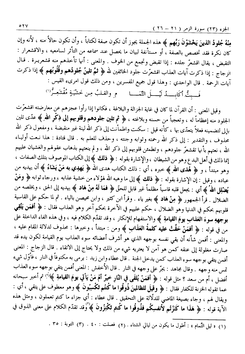مِنْهُ جُلُودُ الَّذِينَ يَخْشَوْنَ رَبَّهُمْ هَذِهِ الْجُمْلَةُ يَجُوزُ أَنْ تَكُونَ صِفَةً لِكِتَابًا، وَأَنْ تَكُونَ حَالًا مِنْهُ، لِأَنَّهُ وَإِنْ كَانَ نَكِرَةً فَقَدْ تَخَصَّصَ بِالصِّفَةِ، أَوْ مُسْتَأْنَفَةً لِبَيَانِ مَا يَحْصُلُ عِنْدَ سَمَاعِهِ مِنَ التَّأَثُّرِ لِسَامِعِيهِ، وَالِاقْشِعْرَارُ: