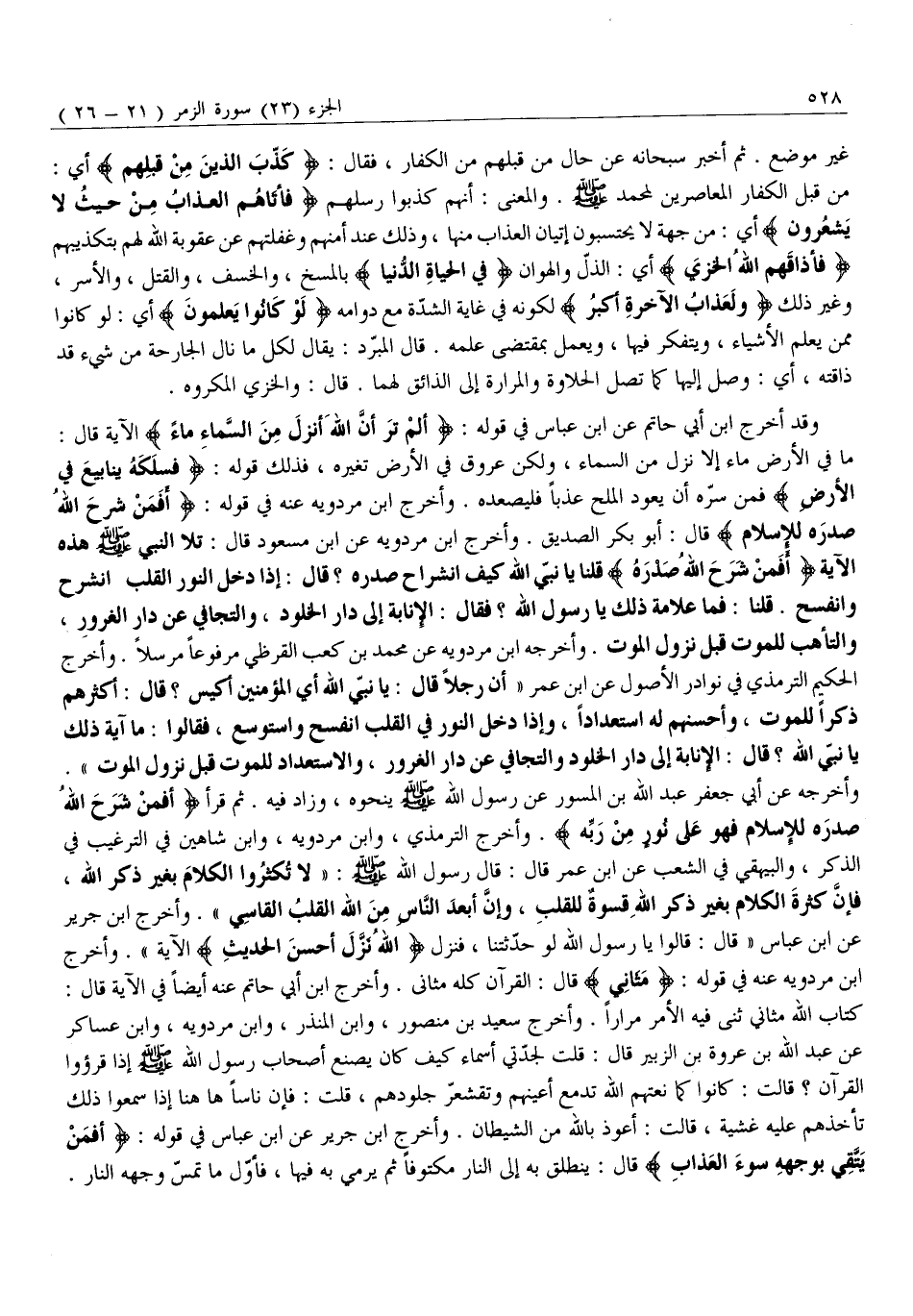 وَأَخْرَجَهُ عَنْ أَبِي جَعْفَرٍ عَبْدِ اللَّهِ بْنِ الْمِسْوَرِ عَنْ رَسُولِ اللَّهِ صَلَّى اللَّهُ عَلَيْهِ وَسَلَّمَ ينحوه، وَزَادَ فِيهِ. ثُمَّ قَرَأَ أَفَمَنْ شَرَحَ اللَّهُ صَدْرَهُ لِلْإِسْلامِ فَهُوَ عَلى نُورٍ مِنْ رَبِّهِ. وَأَخْرَجَ التِّرْمِذِيُّ، وَابْنُ مَرْدَوَيْهِ، وَابْنُ شَاهِينَ فِي التَّرْغِيبِ فِي الذِّكْرِ، وَالْبَيْهَقِيُّ فِي الشُّعَبِ عَنِ ابْنِ عُمَرَ قَالَ: قَالَ رَسُولُ اللَّهِ صَلَّى اللَّهُ عَلَيْهِ وَسَلَّمَ: «لَا تُكْثِرُوا الْكَلَامَ بِغَيْرِ ذِكْرِ اللَّهِ، فَإِنَّ كَثْرَةَ الْكَلَامِ بِغَيْرِ ذِكْرِ اللَّهِ قَسْوَةٌ لِلْقَلْبِ، وَإِنَّ أَبْعَدَ النَّاسِ مِنَ اللَّهِ الْقَلْبُ الْقَاسِي» . وَأَخْرَجَ ابْنُ جَرِيرٍ عَنِ ابْنِ عَبَّاسٍ «قَالَ: قَالُوا يَا رَسُولَ اللَّهِ لَوْ حَدَّثْتَنَا، فَنَزَلَ اللَّهُ نَزَّلَ أَحْسَنَ الْحَدِيثِ الْآيَةَ» . وَأَخْرَجَ ابْنُ مَرْدَوَيْهِ عَنْهُ فِي قَوْلِهِ: مَثانِيَ قَالَ: الْقُرْآنُ كُلُّهُ مَثَانِي. وَأَخْرَجَ ابْنُ أَبِي حَاتِمٍ عَنْهُ أَيْضًا فِي الْآيَةِ قَالَ: