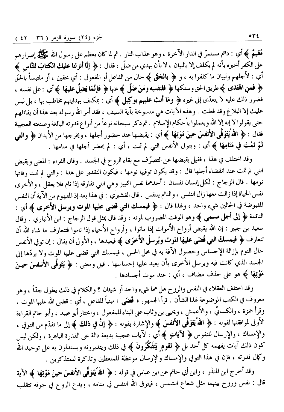 وَقَدِ اخْتَلَفَ الْعُقَلَاءُ فِي النَّفْسِ وَالرُّوحِ هَلْ هُمَا شَيْءٌ وَاحِدٌ أَوْ شَيْئَانِ؟ وَالْكَلَامُ فِي ذَلِكَ يَطُولُ جِدًّا، وَهُوَ مَعْرُوفٌ فِي الْكُتُبِ الْمَوْضُوعَةِ لِهَذَا الشَّأْنِ. قَرَأَ الْجُمْهُورُ «قَضَى» مَبْنِيًّا لِلْفَاعِلِ، أَيْ: قَضَى اللَّهُ عَلَيْهَا الْمَوْتَ، وَقَرَأَ حَمْزَةُ، وَالْكِسَائِيُّ، وَالْأَعْمَشُ، وَيَحْيَى بْنُ وَثَّابٍ عَلَى الْبِنَاءِ لِلْمَفْعُولِ، وَاخْتَارَ أَبُو عُبَيْدٍ، وَأَبُو حَاتِمٍ الْقِرَاءَةَ الْأُولَى لِمُوَافَقَتِهَا لِقَوْلِهِ: اللَّهُ يَتَوَفَّى الْأَنْفُسَ وَالْإِشَارَةُ بِقَوْلِهِ: إِنَّ فِي ذلِكَ إِلَى مَا تَقَدَّمَ مِنَ التَّوَفِّي، وَالْإِمْسَاكِ، وَالْإِرْسَالِ لِلنُّفُوسِ لَآياتٍ أَيْ: لَآيَاتٍ عَجِيبَةٍ بَدِيعَةٍ دَالَّةٍ عَلَى الْقُدْرَةِ الْبَاهِرَةِ، وَلَكِنْ لَيْسَ كَوْنُ ذَلِكَ آيَاتٍ يَفْهَمُهُ كُلُّ أَحَدٍ بَلْ لِقَوْمٍ يَتَفَكَّرُونَ فِي ذَلِكَ وَيَتَدَبَّرُونَهُ وَيَسْتَدِلُّونَ بِهِ عَلَى تَوْحِيدِ الله وكما قُدْرَتِهِ، فَإِنَّ فِي هَذَا التَّوَفِّي وَالْإِمْسَاكِ وَالْإِرْسَالِ مَوْعِظَةً لِلْمُتَّعِظِينَ وَتَذْكِرَةً لِلْمُتَذَكِّرِينَ.
