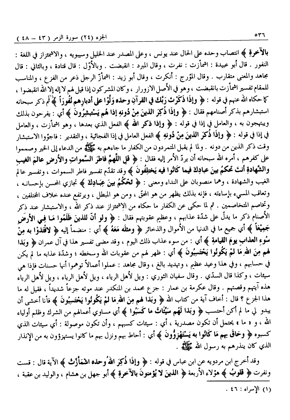 النُّفُورُ. قَالَ أَبُو عُبَيْدَةَ: اشْمَأَزَّتْ: نَفَرَتْ، وَقَالَ الْمُبَرِّدُ: انْقَبَضَتْ. وَبِالْأَوَّلِ: قَالَ قَتَادَةُ، وَبِالثَّانِي: قَالَ مُجَاهِدٌ وَالْمَعْنَى مُتَقَارِبٌ. وَقَالَ الْمُؤَرِّجُ: أَنْكَرَتْ، وَقَالَ أَبُو زَيْدٍ: اشْمَأَزَّ الرَّجُلُ ذُعِرَ مِنَ الْفَزَعِ، والمناسب للمقام تفسير اشمأزت بانقبضت، وَهُوَ فِي الْأَصْلِ الِازْوِرَارُ، وَكَانَ الْمُشْرِكُونَ إِذَا قِيلَ لَهُمْ لَا إِلَهَ إِلَّا اللَّهُ انْقَبَضُوا، كَمَا حَكَاهُ اللَّهُ عَنْهُمْ فِي قَوْلِهِ: وَإِذا ذَكَرْتَ رَبَّكَ فِي الْقُرْآنِ وَحْدَهُ وَلَّوْا عَلى أَدْبارِهِمْ نُفُوراً «1» ثُمَّ ذَكَرَ سُبْحَانَهُ اسْتِبْشَارَهُمْ بِذِكْرِ أَصْنَامِهِمْ فَقَالَ: وَإِذا ذُكِرَ الَّذِينَ مِنْ دُونِهِ إِذا هُمْ يَسْتَبْشِرُونَ أي: يفرحون بذلك ويبتهجون بِهِ، وَالْعَامِلُ فِي إِذَا فِي قَوْلِهِ: وَإِذا ذُكِرَ اللَّهُ الْفِعْلُ الَّذِي بَعْدَهَا، وَهُوَ اشْمَأَزَّتْ، وَالْعَامِلُ فِي إِذَا فِي قَوْلِهِ: وَإِذا ذُكِرَ الَّذِينَ مِنْ دُونِهِ الْفِعْلُ الْعَامِلُ فِي إِذَا الفجائية، والتقدير: فاجؤوا الِاسْتِبْشَارَ وَقْتَ ذِكْرِ الَّذِينَ مِنْ دُونِهِ. وَلَمَّا لَمْ يَقْبَلِ الْمُتَمَرِّدُونَ مِنَ الْكُفَّارِ مَا جَاءَهُمْ به صلّى الله عليه وَسَلَّمَ مِنَ الدُّعَاءِ إِلَى الْخَيْرِ وَصَمَّمُوا عَلَى كُفْرِهِمْ، أَمَرَهُ اللَّهُ سُبْحَانَهُ أَنْ يَرُدَّ الْأَمْرَ إليه فَقَالَ: قُلِ اللَّهُمَّ فاطِرَ السَّماواتِ وَالْأَرْضِ عالِمَ الْغَيْبِ وَالشَّهادَةِ أَنْتَ تَحْكُمُ بَيْنَ عِبادِكَ فِي مَا كانُوا فِيهِ يَخْتَلِفُونَ وَقَدْ تَقَدَّمَ تَفْسِيرُ فاطر السموات، وَتَفْسِيرُ عَالِمَ الْغَيْبِ وَالشَّهَادَةِ، وَهُمَا مَنْصُوبَانِ عَلَى النِّدَاءِ وَمَعْنَى: تَحْكُمُ بَيْنَ عِبادِكَ تُجَازِي الْمُحْسِنَ بِإِحْسَانِهِ، وَتُعَاقِبُ الْمُسِيءَ بِإِسَاءَتِهِ، فَإِنَّهُ بِذَلِكَ يُظْهِرُ مَنْ هُوَ الْمُحِقُّ، وَمَنْ هُوَ الْمُبْطِلُ، وَيَرْتَفِعُ عِنْدَهُ خِلَافُ الْمُخْتَلِفِينَ، وَتَخَاصُمُ الْمُتَخَاصِمِينَ. ثُمَّ لَمَّا حَكَى عَنِ الْكُفَّارِ مَا حَكَاهُ مِنَ الِاشْمِئْزَازِ عِنْدَ ذِكْرِ اللَّهِ، وَالِاسْتِبْشَارِ عِنْدَ ذِكْرِ الْأَصْنَامِ ذَكَرَ مَا يَدُلُّ عَلَى شِدَّةِ عَذَابِهِمْ، وَعَظِيمِ عُقُوبَتِهِمْ فَقَالَ: وَلَوْ أَنَّ لِلَّذِينَ ظَلَمُوا مَا فِي الْأَرْضِ جَمِيعاً أَيْ جَمِيعَ مَا فِي الدُّنْيَا مِنَ الْأَمْوَالِ وَالذَّخَائِرِ وَمِثْلَهُ مَعَهُ أَيْ: مُنْضَمًّا إِلَيْهِ لَافْتَدَوْا بِهِ مِنْ سُوءِ الْعَذابِ يَوْمَ الْقِيامَةِ أَيْ: مِنْ سُوءِ عَذَابِ ذَلِكَ الْيَوْمِ، وَقَدْ مَضَى تَفْسِيرُ هَذَا فِي آلِ عِمْرَانَ وَبَدا لَهُمْ مِنَ اللَّهِ مَا لَمْ يَكُونُوا يَحْتَسِبُونَ أَيْ: ظَهَرَ لَهُمْ مِنْ عُقُوبَاتِ اللَّهِ وَسُخْطِهِ وَشِدَّةِ عَذَابِهِ مَا لَمْ يَكُنْ فِي حِسَابِهِمْ، وَفِي هَذَا وَعِيدٌ عَظِيمٌ، وَتَهْدِيدٌ بَالِغٌ، وَقَالَ مُجَاهِدٌ: عَمِلُوا أَعْمَالًا تَوَهَّمُوا أَنَّهَا حَسَنَاتٌ فَإِذَا هِيَ سَيِّئَاتٌ، وَكَذَا قَالَ السُّدِّيُّ. وَقَالَ سُفْيَانُ الثَّوْرِيُّ: وَيْلٌ لِأَهْلِ الرِّيَاءِ، وَيْلٌ لِأَهْلِ الرِّيَاءِ، وَيْلٌ لِأَهْلِ الرِّيَاءِ هَذِهِ آيَتُهُمْ وَقِصَّتُهُمْ. وَقَالَ عِكْرِمَةُ بْنُ عَمَّارٍ: جَزِعَ مُحَمَّدُ بْنُ الْمُنْكَدِرِ عِنْدَ مَوْتِهِ جَزَعًا شَدِيدًا، فَقِيلَ لَهُ مَا هَذَا الْجَزَعُ؟ قَالَ: أَخَافُ آيَةً مِنْ كِتَابِ اللَّهِ وَبَدا لَهُمْ مِنَ اللَّهِ مَا لَمْ يَكُونُوا يَحْتَسِبُونَ فَأَنَا أَخْشَى أَنْ يَبْدُوَ لِي مَا لَمْ أَكُنْ أَحْتَسِبُ وَبَدا لَهُمْ سَيِّئاتُ ما كَسَبُوا أي مساوي أَعْمَالِهِمْ مِنَ الشِّرْكِ وَظُلْمِ أ