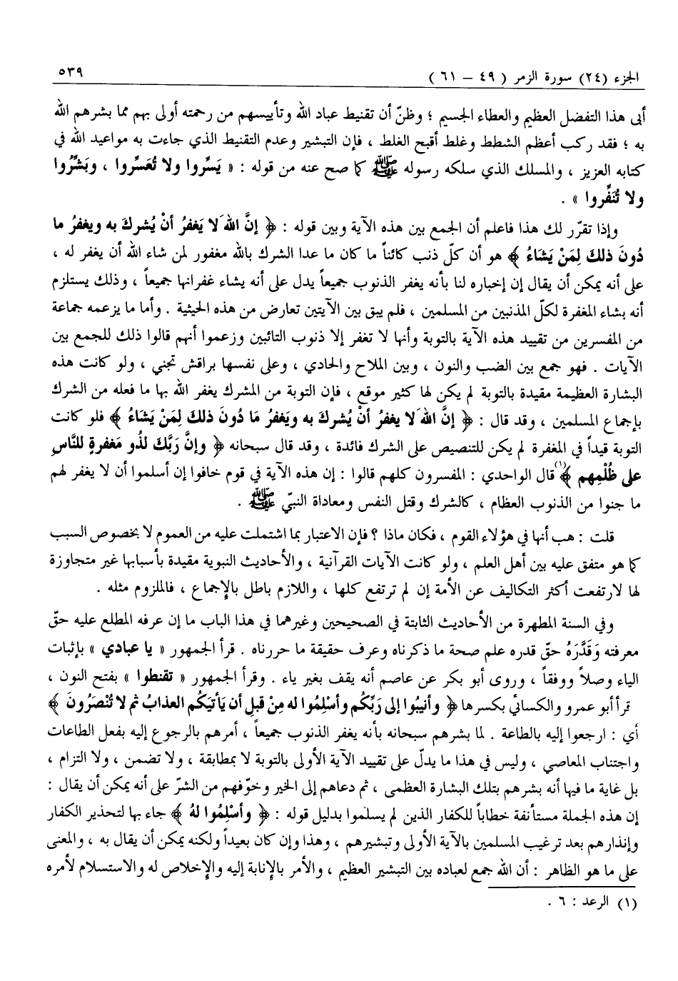 وَفِي السُّنَّةِ الْمُطَهَّرَةِ مِنَ الْأَحَادِيثِ الثَّابِتَةِ فِي الصَّحِيحَيْنِ وَغَيْرِهِمَا فِي هَذَا الْبَابِ مَا إِنْ عَرَفَهُ الْمُطَّلِعُ عَلَيْهِ حَقَّ مَعْرِفَتِهِ وَقَدَرَهُ حَقَّ قَدْرِهِ عَلِمَ صِحَّةَ مَا ذَكَرْنَاهُ وَعَرَفَ حَقِيَقَةَ مَا حَرَّرْنَاهُ. قَرَأَ الْجُمْهُورُ «يَا عبادي» بإثبات الياء وصلا ووفقا، وَرَوَى أَبُو بَكْرٍ عَنْ عَاصِمٍ أَنَّهُ يَقِفُ بِغَيْرِ يَاءٍ. وَقَرَأَ الْجُمْهُورُ «تَقْنَطُوا» بِفَتْحِ النُّونِ، قرأ أَبُو عَمْرٍو وَالْكِسَائِيُّ بِكَسْرِهَا وَأَنِيبُوا إِلى رَبِّكُمْ وَأَسْلِمُوا لَهُ مِنْ قَبْلِ أَنْ يَأْتِيَكُمُ الْعَذابُ ثُمَّ لَا تُنْصَرُونَ أَيِ: ارْجِعُوا إِلَيْهِ بِالطَّاعَةِ. لَمَّا بَشَّرَهُمْ سُبْحَانَهُ بِأَنَّهُ يَغْفِرُ الذُّنُوبَ جَمِيعًا، أَمَرَهُمْ بِالرُّجُوعِ إِلَيْهِ بِفِعْلِ الطَّاعَاتِ وَاجْتِنَابِ الْمَعَاصِي، وَلَيْسَ فِي هَذَا مَا يَدُلُّ عَلَى تَقْيِيدِ الْآيَةِ الْأُولَى بِالتَّوْبَةِ لَا بِمُطَابَقَةٍ، وَلَا تَضَمُّنٍ، وَلَا الْتِزَامٍ، بَلْ غَايَةُ مَا فِيهَا أَنَّهُ بَشَّرَهُمْ بِتِلْكَ الْبِشَارَةِ الْعُظْمَى، ثُمَّ دَعَاهُمْ إِلَى الْخَيْرِ وَخَوَّفَهُمْ مِنَ الشَّرِّ عَلَى أَنَّهُ يُمْكِنُ أَنْ يُقَالَ: