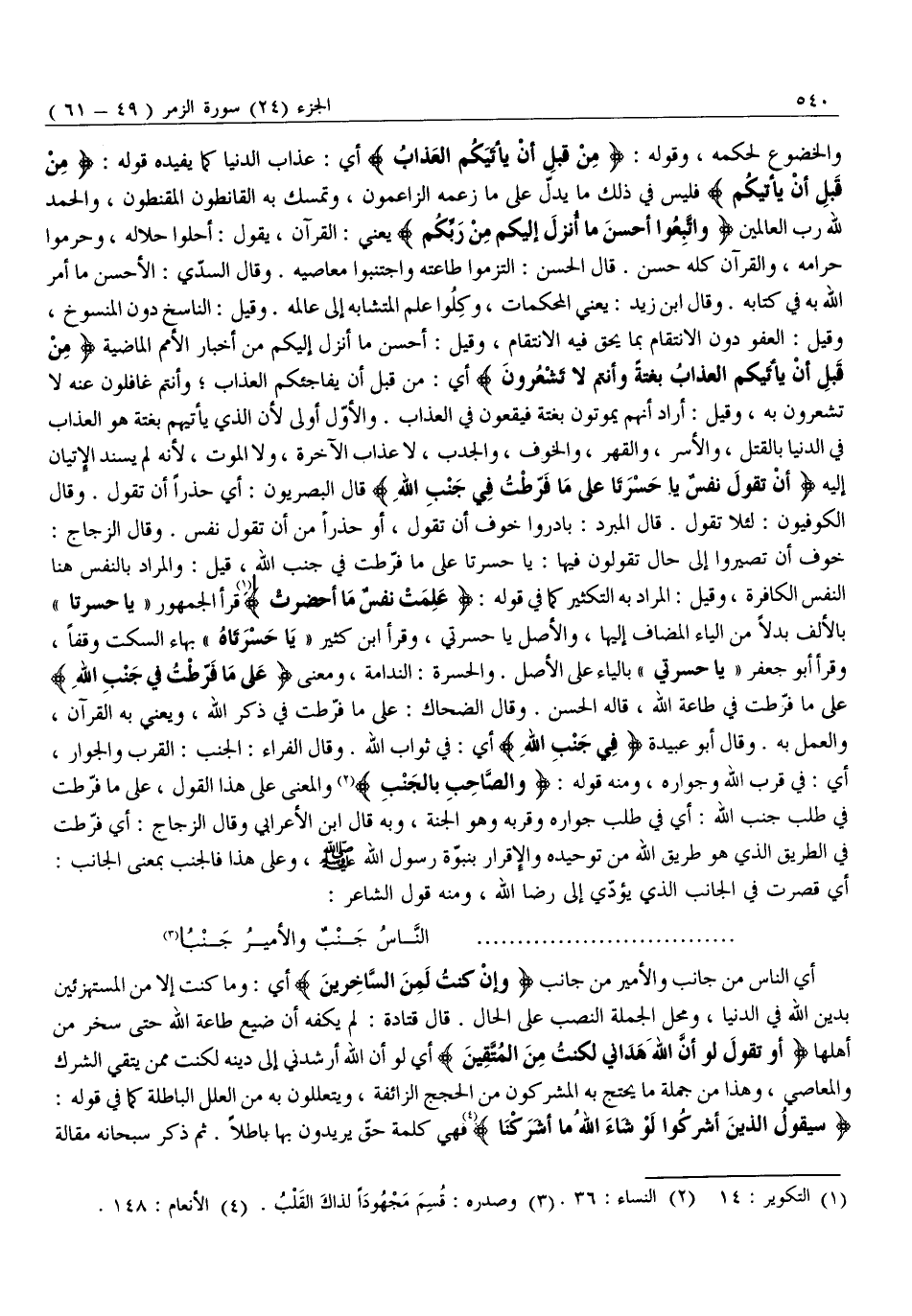 وَالْخُضُوعِ لِحُكْمِهِ، وَقَوْلُهُ: مِنْ قَبْلِ أَنْ يَأْتِيَكُمُ الْعَذابُ أَيْ: عَذَابُ الدُّنْيَا كَمَا يُفِيدُهُ قَوْلُهُ: مِنْ قَبْلِ أَنْ يَأْتِيَكُمُ فَلَيْسَ فِي ذَلِكَ مَا يَدُلُّ عَلَى مَا زَعَمَهُ الزَّاعِمُونَ، وَتَمَسَّكَ بِهِ الْقَانِطُونَ الْمُقَنِّطُونَ، وَالْحَمْدُ لِلَّهِ رَبِّ الْعَالَمِينَ وَاتَّبِعُوا أَحْسَنَ مَا أُنْزِلَ إِلَيْكُمْ مِنْ رَبِّكُمْ يَعْنِي: الْقُرْآنَ، يَقُولُ: أَحِلُّوا حَلَالَهُ، وَحَرِّمُوا حَرَامَهُ، وَالْقُرْآنُ كُلُّهُ حَسَنٌ. قَالَ الْحَسَنُ: الْتَزِمُوا طَاعَتَهُ وَاجْتَنِبُوا مَعَاصِيَهُ. وَقَالَ السُّدِّيُّ: الْأَحْسَنُ مَا أَمَرَ اللَّهُ بِهِ فِي كِتَابِهِ. وَقَالَ ابْنُ زَيْدٍ: يَعْنِي الْمُحْكَمَاتِ، وَكِلُوا عِلْمَ الْمُتَشَابِهِ إِلَى عَالِمِهِ. وَقِيلَ: النَّاسِخُ دُونَ الْمَنْسُوخِ، وَقِيلَ: الْعَفْوُ دُونَ الِانْتِقَامِ بِمَا يَحِقُّ فِيهِ الِانْتِقَامُ، وَقِيلَ: أَحْسَنَ مَا أُنْزِلَ إِلَيْكُمْ مِنْ أَخْبَارِ الْأُمَمِ الْمَاضِيَةِ مِنْ قَبْلِ أَنْ يَأْتِيَكُمُ الْعَذابُ بَغْتَةً وَأَنْتُمْ لَا تَشْعُرُونَ أَيْ: مِنْ قَبْلِ أَنْ يُفَاجِئَكُمُ الْعَذَابُ وَأَنْتُمْ غَافِلُونَ عَنْهُ لَا تَشْعُرُونَ بِهِ، وَقِيلَ: أَرَادَ أَنَّهُمْ يَمُوتُونَ بَغْتَةً فَيَقَعُونَ فِي الْعَذَابِ. وَالْأَوَّلُ أَوْلَى لِأَنَّ الَّذِي يَأْتِيهِمْ بَغْتَةً هُوَ الْعَذَابُ فِي الدُّنْيَا بِالْقَتْلِ، وَالْأَسْرِ، وَالْقَهْرِ، وَالْخَوْفِ، وَالْجَدْبِ، لَا عَذَابُ الْآخِرَةِ، وَلَا الْمَوْتُ، لِأَنَّهُ لَمْ يُسْنِدِ الْإِتْيَانَ إِلَيْهِ أَنْ تَقُولَ نَفْسٌ يا حَسْرَتى عَلى مَا فَرَّطْتُ فِي جَنْبِ اللَّهِ قَالَ الْبَصْرِيُّونَ: أَيْ حَذَرًا أَنْ تَقُولَ. وَقَالَ الْكُوفِيُّونَ: لِئَلَّا تَقُولَ. قَالَ الْمُبَرِّدُ: بَادِرُوا خَوْفَ أَنْ تَقُولَ، أَوْ حَذَرًا مِنْ أَنْ تَقُولَ نَفْسٌ. وَقَالَ الزَّجَّاجُ: