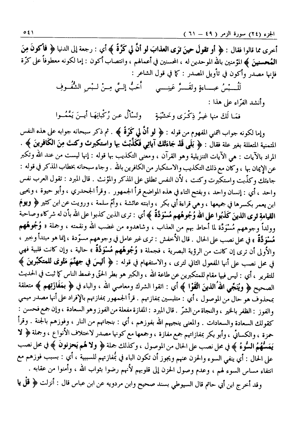 أُخْرَى مِمَّا قَالُوا فَقَالَ: أَوْ تَقُولَ حِينَ تَرَى الْعَذابَ لَوْ أَنَّ لِي كَرَّةً أَيْ: رَجْعَةً إِلَى الدُّنْيَا فَأَكُونَ مِنَ الْمُحْسِنِينَ الْمُؤْمِنِينَ بِاللَّهِ الْمُوَحِّدِينَ لَهُ، الْمُحْسِنِينَ فِي أَعْمَالِهِمْ، وَانْتِصَابُ أَكُونَ: إِمَّا لِكَوْنِهِ مَعْطُوفًا عَلَى كَرَّةٍ فَإِنَّهَا مَصْدَرٌ وَأَكُونُ فِي تَأْوِيلِ الْمَصْدَرِ: كَمَا فِي قَوْلِ الشَّاعِرِ: