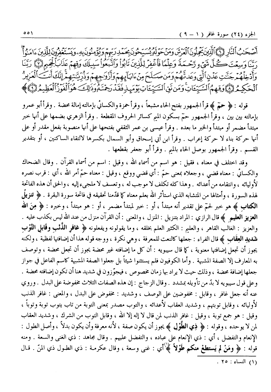 وَعَلَى قَوْلِ سِيبَوَيْهِ لَا بُدَّ مِنْ تَأْوِيلِهِ بِمُشَدَّدٍ. وَقَالَ الزَّجَّاجُ: إِنَّ هَذِهِ الصِّفَاتِ الثَّلَاثَ مَخْفُوضَةٌ عَلَى الْبَدَلِ. وَرُوِيَ عَنْهُ أَنَّهُ جَعَلَ غَافِرَ، وَقَابِلَ: مخفوضين على الوصف، وشديد: مخفوض عَلَى الْبَدَلِ، وَالْمَعْنَى: غَافِرِ الذَّنْبِ لِأَوْلِيَائِهِ، وَقَابِلِ تَوْبَتِهِمْ، وَشَدِيدِ الْعِقَابِ لِأَعْدَائِهِ، وَالتَّوْبُ مَصْدَرٌ بِمَعْنَى التَّوْبَةِ مِنْ تَابَ يَتُوبُ تَوْبَةً وَتَوْبًا، وَقِيلَ: هُوَ جَمْعُ تَوْبَةٍ، وَقِيلَ: غَافِرِ الذَّنْبِ لِمَنْ قَالَ لَا إِلَهَ إِلَّا اللَّهُ، وَقَابِلِ التَّوْبِ مِنَ الشِّرْكِ، وَشَدِيدِ الْعِقَابِ لِمَنْ لَا يُوَحِّدُهُ، وَقَوْلُهُ: ذِي الطَّوْلِ يَجُوزُ أَنْ يَكُونَ صِفَةً، لِأَنَّهُ مَعْرِفَةٌ وَأَنْ يَكُونَ بَدَلًا، وَأَصْلُ الطَّوْلِ: