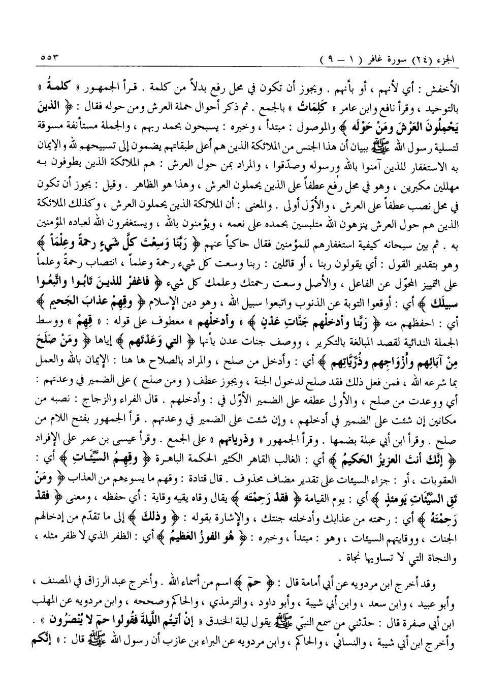 الْأَخْفَشُ: أَيْ لِأَنَّهُمْ، أَوْ بِأَنَّهُمْ. وَيَجُوزُ أَنْ تَكُونَ فِي مَحَلِّ رَفْعٍ بَدَلًا مِنْ كَلِمَةُ. قَرَأَ الْجُمْهُورُ «كَلِمَةُ» بِالتَّوْحِيدِ، وَقَرَأَ نَافِعٌ وَابْنُ عَامِرٍ «كَلِمَاتٌ» بِالْجَمْعِ. ثُمَّ ذَكَرَ أَحْوَالَ حَمَلَةِ الْعَرْشِ وَمَنْ حَوْلَهُ فَقَالَ: الَّذِينَ يَحْمِلُونَ الْعَرْشَ وَمَنْ حَوْلَهُ وَالْمَوْصُولُ: مُبْتَدَأٌ، وَخَبَرُهُ: يُسَبِّحُونَ بِحَمْدِ رَبِّهِمْ، وَالْجُمْلَةُ مُسْتَأْنَفَةٌ مَسُوقَةٌ لِتَسْلِيَةِ رَسُولِ اللَّهِ صَلَّى اللَّهُ عليه وَسَلَّمَ بِبَيَانِ أَنَّ هَذَا الْجِنْسَ مِنَ الْمَلَائِكَةِ الَّذِينَ هُمْ أَعْلَى طَبَقَاتِهِمْ يَضُمُّونَ إِلَى تَسْبِيحِهِمْ لِلَّهِ وَالْإِيمَانِ بِهِ الِاسْتِغْفَارَ لِلَّذِينِ آمَنُوا بِاللَّهِ وَرَسُولِهِ وَصَدَقُوا، وَالْمُرَادُ بِمَنْ حَوْلَ الْعَرْشِ: هُمُ الْمَلَائِكَةُ الَّذِينَ يَطُوفُونَ بِهِ مُهَلِّلِينَ مُكَبِّرِينَ، وَهُوَ فِي مَحَلِّ رَفْعٍ عَطْفًا عَلَى الَّذِينَ يَحْمِلُونَ الْعَرْشَ، وَهَذَا هُوَ الظَّاهِرُ. وَقِيلَ: يَجُوزُ أَنْ تَكُونَ فِي مَحَلِّ نَصْبٍ عَطْفًا عَلَى الْعَرْشِ، وَالْأَوَّلُ أَوْلَى. وَالْمَعْنَى: أَنَّ الْمَلَائِكَةَ الَّذِينَ يَحْمِلُونَ الْعَرْشَ، وَكَذَلِكَ الْمَلَائِكَةُ الَّذِينَ هُمْ حَوْلَ الْعَرْشِ ينزهون الله متلبسين بِحَمْدِهِ عَلَى نِعَمِهِ، وَيُؤْمِنُونَ بِاللَّهِ، وَيَسْتَغْفِرُونَ اللَّهَ لِعِبَادِهِ الْمُؤْمِنِينَ بِهِ. ثُمَّ بَيَّنَ سُبْحَانَهُ كَيْفِيَّةَ اسْتِغْفَارِهِمْ لِلْمُؤْمِنِينَ فَقَالَ حَاكِيًا عَنْهُمْ رَبَّنا وَسِعْتَ كُلَّ شَيْءٍ رَحْمَةً وَعِلْماً وَهُوَ بِتَقْدِيرِ الْقَوْلِ: أَيْ يَقُولُونَ رَبَّنَا، أَوْ قَائِلِينَ: رَبَّنَا وَسِعْتَ كُلَّ شَيْءٍ رَحْمَةً وَعِلْمًا، انْتِصَابُ رَحْمَةً وَعِلْمًا عَلَى التَّمْيِيزِ الْمُحَوَّلِ عَنِ الْفَاعِلِ، وَالْأَصْلُ وَسِعَتْ رَحْمَتُكَ وَعِلْمُكَ كُلَّ شَيْءٍ فَاغْفِرْ لِلَّذِينَ تابُوا وَاتَّبَعُوا سَبِيلَكَ أَيْ: أَوْقَعُوا التَّوْبَةَ عَنِ الذُّنُوبِ وَاتَّبَعُوا سَبِيلَ اللَّهِ، وَهُوَ دِينُ الْإِسْلَامِ وَقِهِمْ عَذابَ الْجَحِيمِ أَيِ: احْفَظْهُمْ مِنْهُ رَبَّنا وَأَدْخِلْهُمْ جَنَّاتِ عَدْنٍ «وَأَدْخِلْهُمْ» مَعْطُوفٌ عَلَى قَوْلِهِ: «قِهِمْ» وَوَسَّطَ الْجُمْلَةَ النِّدَائِيَّةَ لِقَصْدِ الْمُبَالَغَةِ بِالتَّكْرِيرِ، وَوَصَفَ جَنَّاتِ عَدْنٍ بِأَنَّهَا الَّتِي وَعَدْتَهُمْ إِيَّاهَا وَمَنْ صَلَحَ مِنْ آبائِهِمْ وَأَزْواجِهِمْ وَذُرِّيَّاتِهِمْ أَيْ: وَأَدْخِلْ مَنْ صَلَحَ، وَالْمُرَادُ بِالصَّلَاحِ هَاهُنَا: الْإِيمَانُ بِاللَّهِ وَالْعَمَلُ بِمَا شَرَعَهُ اللَّهُ، فَمَنْ فَعَلَ ذَلِكَ فَقَدْ صَلَحَ لِدُخُولِ الْجَنَّةِ، وَيَجُوزُ عَطْفُ (وَمَنْ صَلَحَ) عَلَى الضَّمِيرِ فِي وَعَدْتَهُمْ: