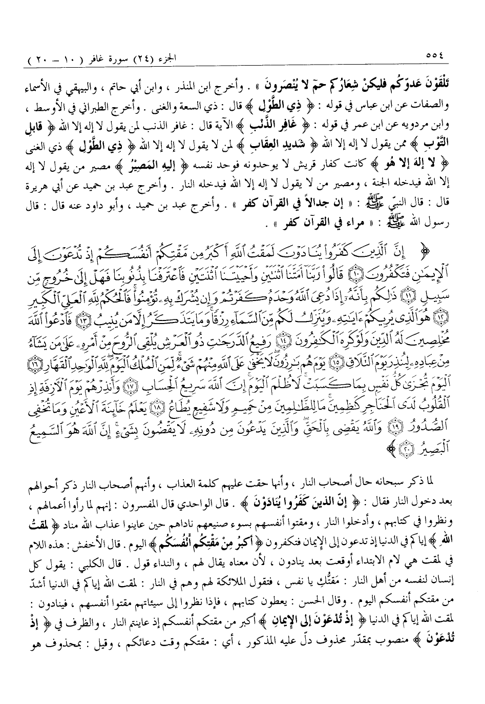 تَلْقَوْنَ عَدُوَّكُمْ فَلْيَكُنْ شِعَارُكُمْ حم لَا يُنْصَرُونَ» . وَأَخْرَجَ ابْنُ الْمُنْذِرِ، وَابْنُ أَبِي حَاتِمٍ، وَالْبَيْهَقِيُّ فِي الْأَسْمَاءِ وَالصِّفَاتِ عَنِ ابْنِ عَبَّاسٍ فِي قَوْلِهِ: ذِي الطَّوْلِ قَالَ: ذِي السَّعَةِ وَالْغِنَى. وَأَخْرَجَ الطَّبَرَانِيُّ فِي الْأَوْسَطِ، وَابْنُ مَرْدَوَيْهِ عَنِ ابْنِ عُمَرَ فِي قَوْلِهِ: غافِرِ الذَّنْبِ الْآيَةَ قَالَ: غَافِرِ الذَّنْبِ لِمَنْ يَقُولُ لَا إِلَهَ إلا الله قابِلِ التَّوْبِ مِمَّنْ يَقُولُ لَا إِلَهَ إِلَّا اللَّهُ شَدِيدِ الْعِقابِ لِمَنْ لَا يَقُولُ لَا إِلَهَ إِلَّا اللَّهُ ذِي الطَّوْلِ ذِي الْغِنَى لَا إِلهَ إِلَّا هُوَ كَانَتْ كُفَّارُ قُرَيْشٍ لَا يُوَحِّدُونَهُ فَوَحَّدَ نَفْسَهُ إِلَيْهِ الْمَصِيرُ مَصِيرُ مَنْ يَقُولُ لَا إِلَهَ إِلَّا اللَّهُ فَيُدْخِلُهُ الْجَنَّةَ، وَمَصِيرُ مَنْ لَا يَقُولُ لَا إِلَهَ إِلَّا اللَّهُ فَيُدْخِلُهُ النَّارَ. وَأَخْرَجَ عَبْدُ بْنُ حُمَيْدٍ عَنْ أَبِي هُرَيْرَةَ قَالَ: قَالَ النَّبِيُّ صَلَّى اللَّهُ عَلَيْهِ وَسَلَّمَ: «إِنَّ جِدَالًا فِي الْقُرْآنِ كُفْرٌ» . وَأَخْرَجَ عَبْدُ بْنُ حُمَيْدٍ، وَأَبُو دَاوُدَ عَنْهُ قَالَ: قَالَ رَسُولُ اللَّهِ صَلَّى اللَّهُ عَلَيْهِ وسلم: «مراء في القرآن كفر» .