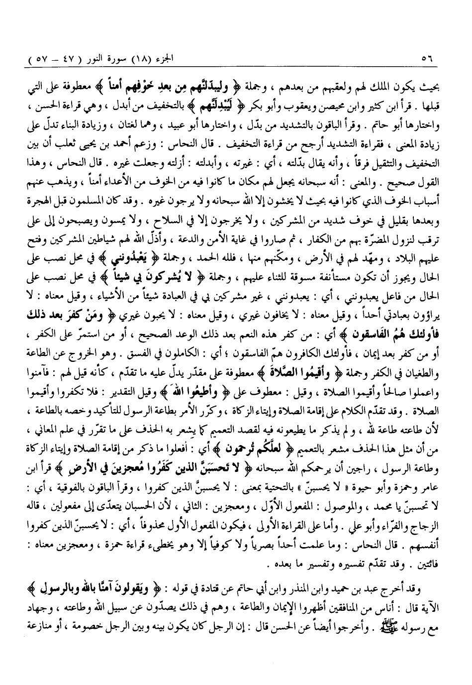 بِحَيْثُ يَكُونُ الْمُلْكُ لَهُمْ وَلِعَقِبِهِمْ مِنْ بَعْدِهِمْ، وَجُمْلَةُ وَلَيُبَدِّلَنَّهُمْ مِنْ بَعْدِ خَوْفِهِمْ أَمْناً مَعْطُوفَةٌ عَلَى الَّتِي قَبْلَهَا. قَرَأَ ابْنُ كَثِيرٍ وَابْنُ مُحَيْصِنٍ وَيَعْقُوبُ وَأَبُو بَكْرٍ لَيُبَدِّلَنَّهُمْ بِالتَّخْفِيفِ مِنْ أَبْدَلَ، وَهِيَ قِرَاءَةٌ الْحَسَنِ، وَاخْتَارَهَا أَبُو حَاتِمٍ. وَقَرَأَ الْبَاقُونَ بِالتَّشْدِيدِ مَنْ بَدَّلَ، وَاخْتَارَهَا أَبُو عُبَيْدٍ، وَهُمَا لُغَتَانِ، وَزِيَادَةُ الْبِنَاءِ تَدُلُّ عَلَى زِيَادَةِ الْمَعْنَى، فَقِرَاءَةُ التَّشْدِيدِ أَرْجَحُ مِنْ قِرَاءَةِ التَّخْفِيفِ. قَالَ النَّحَّاسُ: وَزَعَمَ أَحْمَدُ بْنُ يَحْيَى ثَعْلَبٌ أَنَّ بَيْنَ التَّخْفِيفِ وَالتَّثْقِيلِ فَرْقًا، وَأَنَّهُ يُقَالُ بَدَّلْتُهُ، أَيْ: غَيَّرْتَهُ، وَأَبْدَلْتُهُ: أَزَلْتُهُ وَجَعَلْتُ غَيْرَهُ. قَالَ النَّحَّاسُ، وَهَذَا الْقَوْلُ صَحِيحٌ. وَالْمَعْنَى: أَنَّهُ سُبْحَانَهُ يَجْعَلُ لَهُمْ مَكَانَ مَا كَانُوا فِيهِ مِنَ الْخَوْفِ مِنَ الْأَعْدَاءِ أَمْنًا، وَيُذْهِبُ عَنْهُمْ أَسْبَابَ الْخَوْفِ الَّذِي كَانُوا فِيهِ بِحَيْثُ لَا يَخْشَوْنَ إِلَّا اللَّهَ سُبْحَانَهُ وَلَا يَرْجُونَ غَيْرَهُ. وَقَدْ كَانَ الْمُسْلِمُونَ قَبْلَ الْهِجْرَةِ وَبَعْدَهَا بقليل في خوف شديد من المشركين، ولا يَخْرُجُونَ إِلَّا فِي السِّلَاحِ، وَلَا يُمْسُونَ وَيُصْبِحُونَ إلى عَلَى تَرَقُّبٍ لِنُزُولِ الْمَضَرَّةِ بِهِمْ مِنَ الْكُفَّارِ، ثُمَّ صَارُوا فِي غَايَةِ الْأَمْنِ وَالدَّعَةِ، وَأَذَلَّ اللَّهُ لَهُمْ شَيَاطِينَ الْمُشْرِكِينَ وَفَتَحَ عَلَيْهِمِ الْبِلَادَ، وَمَهَّدَ لَهُمْ فِي الْأَرْضِ، وَمَكَّنَهُمْ مِنْهَا، فَلِلَّهِ الْحَمْدُ، وَجُمْلَةُ يَعْبُدُونَنِي فِي مَحَلِّ نَصْبٍ عَلَى الْحَالِ وَيَجُوزُ أَنْ تَكُونَ مُسْتَأْنَفَةً مَسُوَقَةً لِلثَّنَاءِ عَلَيْهِمْ، وَجُمْلَةُ لَا يُشْرِكُونَ بِي شَيْئاً فِي مَحَلِّ نَصْبٍ عَلَى الْحَالِ مِنْ فَاعِلِ يَعْبُدُونَنِي، أَيْ: يَعْبُدُونَنِي، غَيْرَ مُشْرِكِينَ بِي فِي الْعِبَادَةِ شَيْئًا مِنَ الْأَشْيَاءِ، وَقِيلَ مَعْنَاهُ: لَا يُرَاءُونَ بِعِبَادَتِي أَحَدًا، وَقِيلَ مَعْنَاهُ: لَا يَخَافُونَ غَيْرِي، وَقِيلَ مَعْنَاهُ: لَا يُحِبُّونَ غَيْرِي وَمَنْ كَفَرَ بَعْدَ ذلِكَ فَأُولئِكَ هُمُ الْفاسِقُونَ أَيْ: مَنْ كَفَرَ هَذِهِ النِّعَمَ بَعْدَ ذَلِكَ الْوَعْدِ الصَّحِيحِ، أَوْ مَنِ اسْتَمَرَّ عَلَى الْكُفْرِ، أَوْ مَنْ كَفَرَ بَعْدَ إِيمَانٍ، فَأُولَئِكَ الْكَافِرُونَ هُمُ الْفَاسِقُونَ أَيِ: الْكَامِلُونَ فِي الْفِسْقِ. وَهُوَ الْخُرُوجُ عَنِ الطَّاعَةِ وَالطُّغْيَانِ فِي الْكُفْرِ وَجُمْلَةُ وَأَقِيمُوا الصَّلاةَ مَعْطُوفَةٌ عَلَى مُقَدَّرٍ يَدُلُّ عَلَيْهِ مَا تَقَدَّمَ، كَأَنَّهُ قِيلَ لَهُمْ: فَآمِنُوا وَاعْمَلُوا صَالِحًا وَأَقِيمُوا الصلاة، وقيل: معطوف على أَطِيعُوا اللَّهَ وَقِيلَ التَّقْدِيرُ: فَلَا تَكْفُرُوا وَأَقِيمُوا الصَّلَاةَ. وَقَدْ تَقَدَّمَ الْكَلَامُ عَلَى إِقَامَةِ الصَّلَاةِ وَإِيتَاءِ الزَّكَاةِ، وَكَرَّرَ الْأَمْرَ بِطَاعَةِ الرَّسُولِ لِلتَّأْكِيدِ وَخَصَّهُ بِالطَّاعَةِ، لِأَنَّ طَاعَتَهُ طَاعَةٌ لِلَّهِ، وَلَمْ يَذْكُرْ مَا يُطِيعُونَهُ فِيهِ لِقَصْدِ التَّعْمِيمِ كَمَا يُشْعِرُ بِهِ الْحَذْفُ عَلَى مَا تَقَرَّرَ فِي عِلْمِ الْمَعَانِي، مِنْ أَنَّ مِثْلَ هَذَا الْحَذْفِ مُشْعِرٌ بِالتَّعْمِيمِ لَعَلَّكُمْ تُرْحَمُونَ أَيِ: افْعَلُوا مَا ذَكَرَ مِنْ إِقَامَةِ الصَّلَاةِ وَإِيتَاءِ الزَّكَاةِ وَطَاعَةِ الرَّسُولِ، رَاجِينَ أَنْ يَرْحَمَكُمُ اللَّهُ سُبْحَانَهُ لَا تَحْسَبَنَّ الَّذِينَ كَفَرُوا مُعْجِزِينَ فِي الْأَر