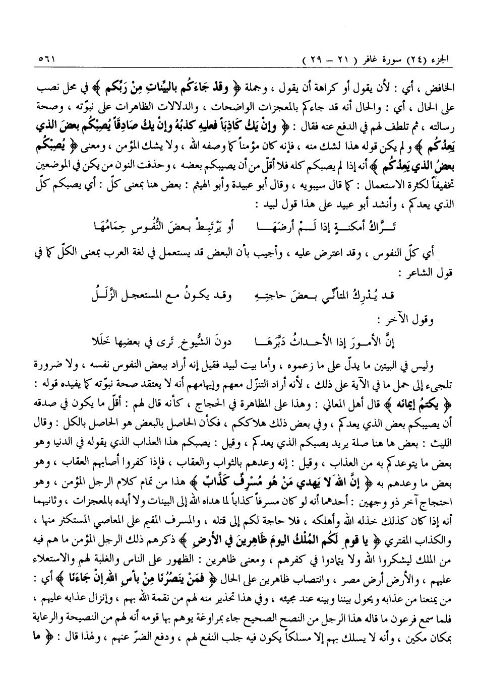 يَكْتُمُ إِيمانَهُ قَالَ أَهْلُ الْمَعَانِي: وَهَذَا عَلَى الْمُظَاهَرَةِ فِي الْحِجَاجِ، كَأَنَّهُ قَالَ لَهُمْ: أَقَلُّ مَا يَكُونُ فِي صِدْقِهِ أَنْ يُصِيبَكُمْ بَعْضُ الَّذِي يَعِدُكُمْ، وَفِي بَعْضِ ذَلِكَ هَلَاكُكُمْ، فَكَأَنَّ الْحَاصِلَ بِالْبَعْضِ هُوَ الْحَاصِلُ بِالْكُلِّ: وَقَالَ اللَّيْثُ: بَعْضُ هَاهُنَا صِلَةٌ يُرِيدُ يُصِبْكُمُ الَّذِي يَعِدُكُمْ، وَقِيلَ: يُصِبْكُمْ هَذَا الْعَذَابُ الَّذِي يَقُولُهُ فِي الدُّنْيَا وَهُوَ بَعْضُ مَا يَتَوَعَّدُكُمْ بِهِ مِنَ الْعَذَابِ، وَقِيلَ: إِنَّهُ وَعَدَهُمْ بِالثَّوَابِ وَالْعِقَابِ، فَإِذَا كَفَرُوا أَصَابَهُمُ الْعِقَابُ، وَهُوَ بَعْضُ مَا وَعَدَهُمْ بِهِ إِنَّ اللَّهَ لَا يَهْدِي مَنْ هُوَ مُسْرِفٌ كَذَّابٌ هَذَا مِنْ تَمَامِ كَلَامِ الرَّجُلِ الْمُؤْمِنِ، وَهُوَ احْتِجَاجٌ آخَرُ ذُو وَجْهَيْنِ: أَحَدُهُمَا أَنَّهُ لَوْ كَانَ مُسْرِفًا كَذَّابًا لَمَا هَدَاهُ اللَّهُ إِلَى الْبَيِّنَاتِ وَلَا أَيَّدَهُ بِالْمُعْجِزَاتِ، وَثَانِيهِمَا أَنَّهُ إِذَا كَانَ كَذَلِكَ خَذَلَهُ اللَّهُ وَأَهْلَكَهُ، فَلَا حَاجَةَ لَكُمْ إِلَى قَتْلِهِ، وَالْمُسْرِفُ الْمُقِيمُ عَلَى الْمَعَاصِي الْمُسْتَكْثِرُ مِنْهَا، وَالْكَذَّابُ الْمُفْتَرِي يَا قَوْمِ لَكُمُ الْمُلْكُ الْيَوْمَ ظاهِرِينَ فِي الْأَرْضِ ذَكَّرَهُمْ ذَلِكَ الرَّجُلُ الْمُؤْمِنُ مَا هُمْ فِيهِ مِنَ الْمُلْكِ لِيَشْكُرُوا اللَّهَ وَلَا يَتَمَادَوْا فِي كُفْرِهِمْ، وَمَعْنَى ظَاهِرِينَ: الظُّهُورُ عَلَى النَّاسِ وَالْغَلَبَةُ لَهُمْ وَالِاسْتِعْلَاءُ عَلَيْهِمْ، وَالْأَرْضُ أَرْضُ مِصْرَ، وَانْتِصَابُ ظَاهِرِينَ عَلَى الْحَالِ فَمَنْ يَنْصُرُنا مِنْ بَأْسِ اللَّهِ إِنْ جاءَنا أَيْ: