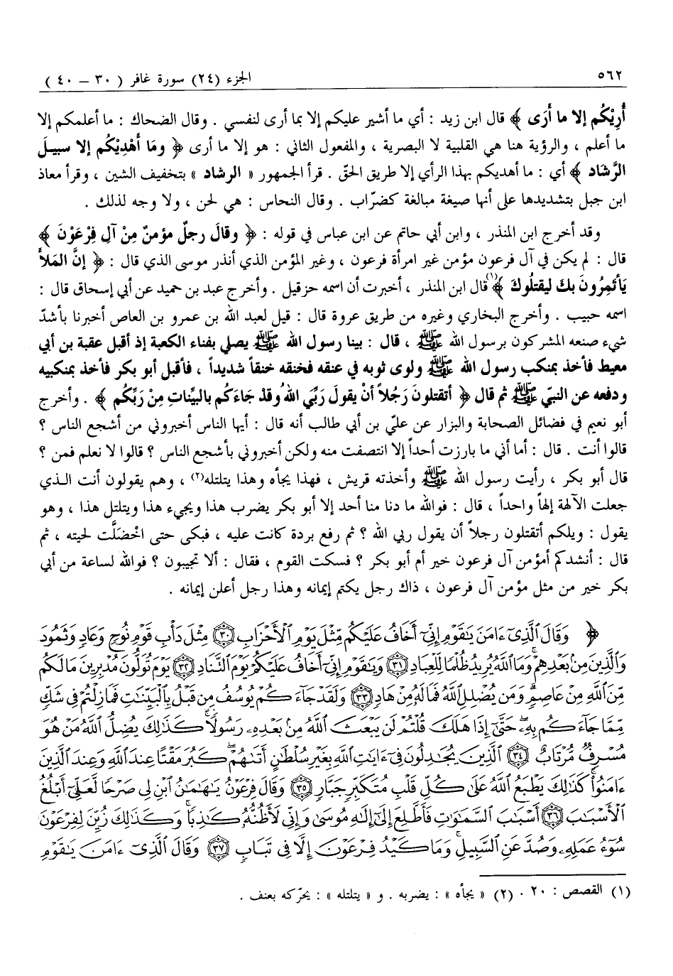 قَالَ أَبُو بَكْرٍ، رَأَيْتُ رَسُولَ اللَّهِ صَلَّى اللَّهُ عَلَيْهِ وَسَلَّمَ وأخذته قريش، فهذا يجؤه وَهَذَا يُتَلْتِلُهُ «2» ، وَهُمْ يَقُولُونَ أَنْتَ الَّذِي جَعَلْتَ الآلهة إلها واحدا، قال: فو الله مَا دَنَا مِنَّا أَحَدٌ إِلَّا أَبُو بَكْرٍ يَضْرِبُ هَذَا وَيَجِيءُ هَذَا وَيُتَلْتِلُ هَذَا، وَهُوَ يَقُولُ: وَيْلَكُمْ أَتَقْتُلُونَ رَجُلًا أَنْ يَقُولَ رَبِّيَ اللَّهُ؟ ثُمَّ رَفَعَ بُرْدَةً كَانَتْ عَلَيْهِ، فَبَكَى حَتَّى اخْضَلَّتْ لِحْيَتُهُ، ثُمَّ قَالَ: أَنْشُدُكُمْ أَمُؤْمِنُ آلِ فِرْعَوْنَ خَيْرٌ أَمْ أَبُو بَكْرٍ؟ فَسَكَتَ القوم، فقال: ألا تجيبون؟ فو الله لَسَاعَةٌ مِنْ أَبِي بَكْرٍ خَيْرٌ مِنْ مِثْلِ مؤمن آل فرعون، ذاك رَجُلٌ يَكْتُمُ إِيمَانَهُ وَهَذَا رَجُلٌ أَعْلَنَ إِيمَانَهُ.