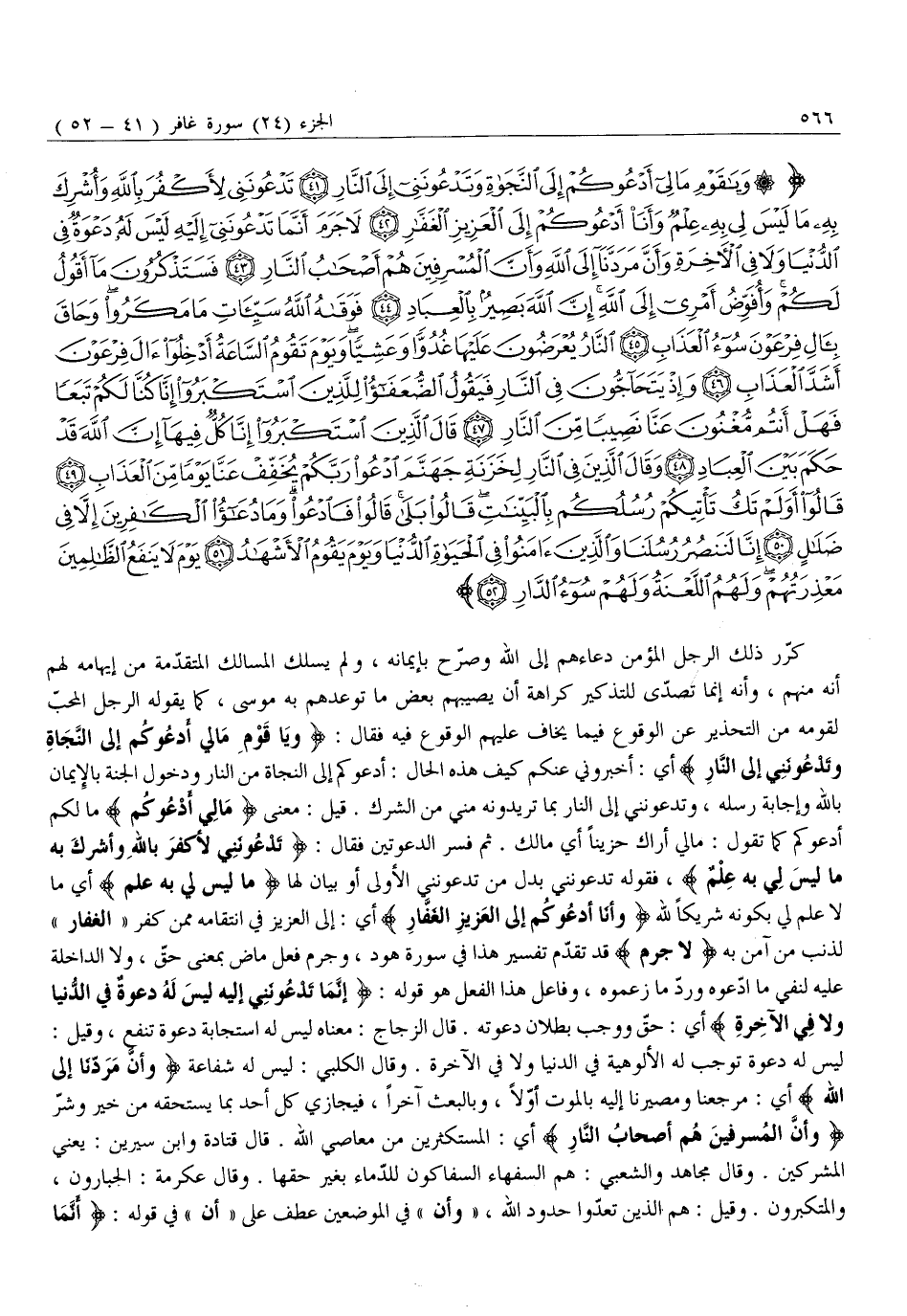 وَيا قَوْمِ مَا لِي أَدْعُوكُمْ إِلَى النَّجاةِ وَتَدْعُونَنِي إِلَى النَّارِ (41) تَدْعُونَنِي لِأَكْفُرَ بِاللَّهِ وَأُشْرِكَ بِهِ مَا لَيْسَ لِي بِهِ عِلْمٌ وَأَنَا أَدْعُوكُمْ إِلَى الْعَزِيزِ الْغَفَّارِ (42) لَا جَرَمَ أَنَّما تَدْعُونَنِي إِلَيْهِ لَيْسَ لَهُ دَعْوَةٌ فِي الدُّنْيا وَلا فِي الْآخِرَةِ وَأَنَّ مَرَدَّنا إِلَى اللَّهِ وَأَنَّ الْمُسْرِفِينَ هُمْ أَصْحابُ النَّارِ (43) فَسَتَذْكُرُونَ مَا أَقُولُ لَكُمْ وَأُفَوِّضُ أَمْرِي إِلَى اللَّهِ إِنَّ اللَّهَ بَصِيرٌ بِالْعِبادِ (44) فَوَقاهُ اللَّهُ سَيِّئاتِ مَا مَكَرُوا وَحاقَ بِآلِ فِرْعَوْنَ سُوءُ الْعَذابِ (45)
