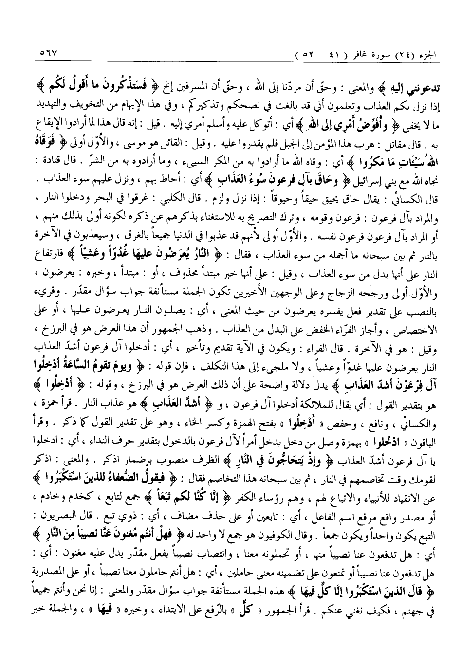 قَالَ الْكِسَائِيُّ: يُقَالُ حَاقَ يَحِيقُ حَيْقًا وَحُيُوقًا: إِذَا نَزَلَ وَلَزِمَ. قَالَ الْكَلْبِيُّ: غَرِقُوا فِي الْبَحْرِ وَدَخَلُوا النَّارَ، وَالْمُرَادُ بِآلِ فِرْعَوْنَ: فِرْعَوْنُ وَقَوْمُهُ، وَتَرَكَ التَّصْرِيحَ بِهِ لِلِاسْتِغْنَاءِ بِذِكْرِهِمْ عَنْ ذِكْرِهِ لِكَوْنِهِ أَوْلَى بِذَلِكَ مِنْهُمْ، أَوِ الْمُرَادُ بِآلِ فِرْعَوْنَ فِرْعَوْنُ نَفْسُهُ. وَالْأَوَّلُ أَوْلَى لِأَنَّهُمْ قَدْ عُذِّبُوا فِي الدُّنْيَا جَمِيعًا بِالْغَرَقِ، وَسَيُعَذَّبُونَ فِي الْآخِرَةِ بِالنَّارِ ثُمَّ بَيَّنَ سُبْحَانَهُ مَا أَجْمَلَهُ مِنْ سُوءِ الْعَذَابِ، فَقَالَ: النَّارُ يُعْرَضُونَ عَلَيْها غُدُوًّا وَعَشِيًّا فَارْتِفَاعُ النَّارِ عَلَى أَنَّهَا بَدَلٌ مِنْ سُوءِ الْعَذَابِ، وَقِيلَ: عَلَى أَنَّهَا خَبَرُ مُبْتَدَأٍ مَحْذُوفٍ، أَوْ: مُبْتَدَأٌ، وَخَبَرُهُ: يُعْرَضُونَ، وَالْأَوَّلُ أَوْلَى وَرَجَّحَهُ الزَّجَّاجُ وَعَلَى الْوَجْهَيْنِ الْأَخِيرَيْنِ تَكُونُ الْجُمْلَةُ مُسْتَأْنَفَةً جَوَابَ سُؤَالٍ مُقَدَّرٍ. وقريء بِالنَّصْبِ عَلَى تَقْدِيرِ فِعْلٍ يُفَسِّرُهُ يُعْرَضُونَ مِنْ حَيْثُ الْمَعْنَى، أَيْ: يَصِلُونَ النَّارَ يُعْرَضُونَ عَلَيْهَا، أَوْ عَلَى الِاخْتِصَاصِ، وَأَجَازَ الْفَرَّاءُ الْخَفْضَ عَلَى الْبَدَلِ مِنَ الْعَذَابِ. وَذَهَبَ الْجُمْهُورُ أَنَّ هَذَا الْعَرْضَ هُوَ فِي الْبَرْزَخِ، وَقِيلَ: هُوَ فِي الْآخِرَةِ. قَالَ الْفَرَّاءُ: وَيَكُونُ فِي الْآيَةِ تَقْدِيمٌ وَتَأْخِيرٌ، أَيْ: أَدْخِلُوا آلَ فِرْعَوْنَ أَشَدَّ الْعَذَابِ النَّارُ يُعْرَضُونَ عَلَيْهَا غُدُوًّا وَعَشِيًّا، وَلَا مُلْجِئَ إِلَى هَذَا التَّكَلُّفِ، فَإِنَّ قَوْلَهُ: وَيَوْمَ تَقُومُ السَّاعَةُ أَدْخِلُوا آلَ فِرْعَوْنَ أَشَدَّ الْعَذابِ يَدُلُّ دَلَالَةً وَاضِحَةً عَلَى أَنَّ ذَلِكَ الْعَرْضَ هُوَ فِي الْبَرْزَخِ، وَقَوْلُهُ: أَدْخِلُوا هُوَ بِتَقْدِيرِ الْقَوْلِ: أي يقال للملائكة أدخلوا آل فرعون، وأَشَدَّ الْعَذابِ هُوَ عَذَابُ النَّارِ. قَرَأَ حَمْزَةُ، وَالْكِسَائِيُّ، وَنَافِعٌ، وَحَفْصٌ «أَدْخِلُوا» بِفَتْحِ الْهَمْزَةِ وَكَسْرِ الْخَاءِ، وَهُوَ عَلَى تَقْدِيرِ الْقَوْلِ كَمَا ذُكِرَ. وَقَرَأَ الْبَاقُونَ «ادْخُلُوا» بِهَمْزَةِ وَصْلٍ مِنْ دَخَلَ يَدْخُلُ أَمْرًا لِآلِ فِرْعَوْنَ بِالدُّخُولِ بِتَقْدِيرِ حَرْفِ النِّدَاءِ، أَيِ: ادْخُلُوا يَا آلَ فِرْعَوْنَ أَشَدَّ الْعَذَابِ وَإِذْ يَتَحاجُّونَ فِي النَّارِ الظَّرْفُ مَنْصُوبٌ بِإِضْمَارِ اذْكُرْ. وَالْمَعْنَى: اذْكُرْ لِقَوْمِكَ وَقْتَ تَخَاصُمِهِمْ فِي النَّارِ، ثُمَّ بَيَّنَ سُبْحَانَهُ هَذَا التَّخَاصُمَ فَقَالَ: فَيَقُولُ الضُّعَفاءُ لِلَّذِينَ اسْتَكْبَرُوا عَنِ الِانْقِيَادِ لِلْأَنْبِيَاءِ وَالِاتِّبَاعِ لَهُمْ، وَهُمْ رُؤَسَاءُ الْكُفْرِ إِنَّا كُنَّا لَكُمْ تَبَعاً جَمْعٌ لِتَابِعٍ، كَخَدَمٍ وَخَادِمٍ، أَوْ مَصْدَرٌ وَاقِعٌ مَوْقِعَ اسْمِ الْفَاعِلِ، أَيْ: تَابِعِينَ أَوْ عَلَى حَذْفِ مُضَافٍ، أَيْ: ذَوِي تَبَعٍ. قَالَ الْبَصْرِيُّونَ: