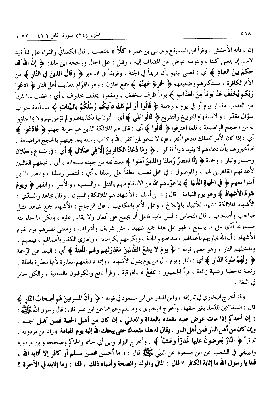 ثُمَّ قَرَأَ النَّارُ يُعْرَضُونَ عَلَيْها غُدُوًّا وَعَشِيًّا. وَأَخْرَجَ الْبَزَّارُ وَابْنُ أَبِي حَاتِمٍ وَالْحَاكِمُ وَصَحَّحَهُ وَابْنُ مَرْدَوَيْهِ وَالْبَيْهَقِيُّ فِي الشُّعَبِ عَنِ ابْنِ مَسْعُودٍ عَنِ النَّبِيِّ صَلَّى اللَّهُ عَلَيْهِ وَسَلَّمَ قَالَ: «مَا أَحْسَنَ مُحْسِنٌ مُسْلِمٌ أَوْ كَافِرٌ إِلَّا أَثَابَهُ اللَّهُ، قُلْنَا يَا رَسُولَ اللَّهِ مَا إِثَابَةُ الْكَافِرِ؟ قَالَ: الْمَالُ وَالْوَلَدُ وَالصِّحَّةُ وَأَشْبَاهُ ذَلِكَ، قُلْنَا: وَمَا إِثَابَتُهُ فِي الآخرة؟