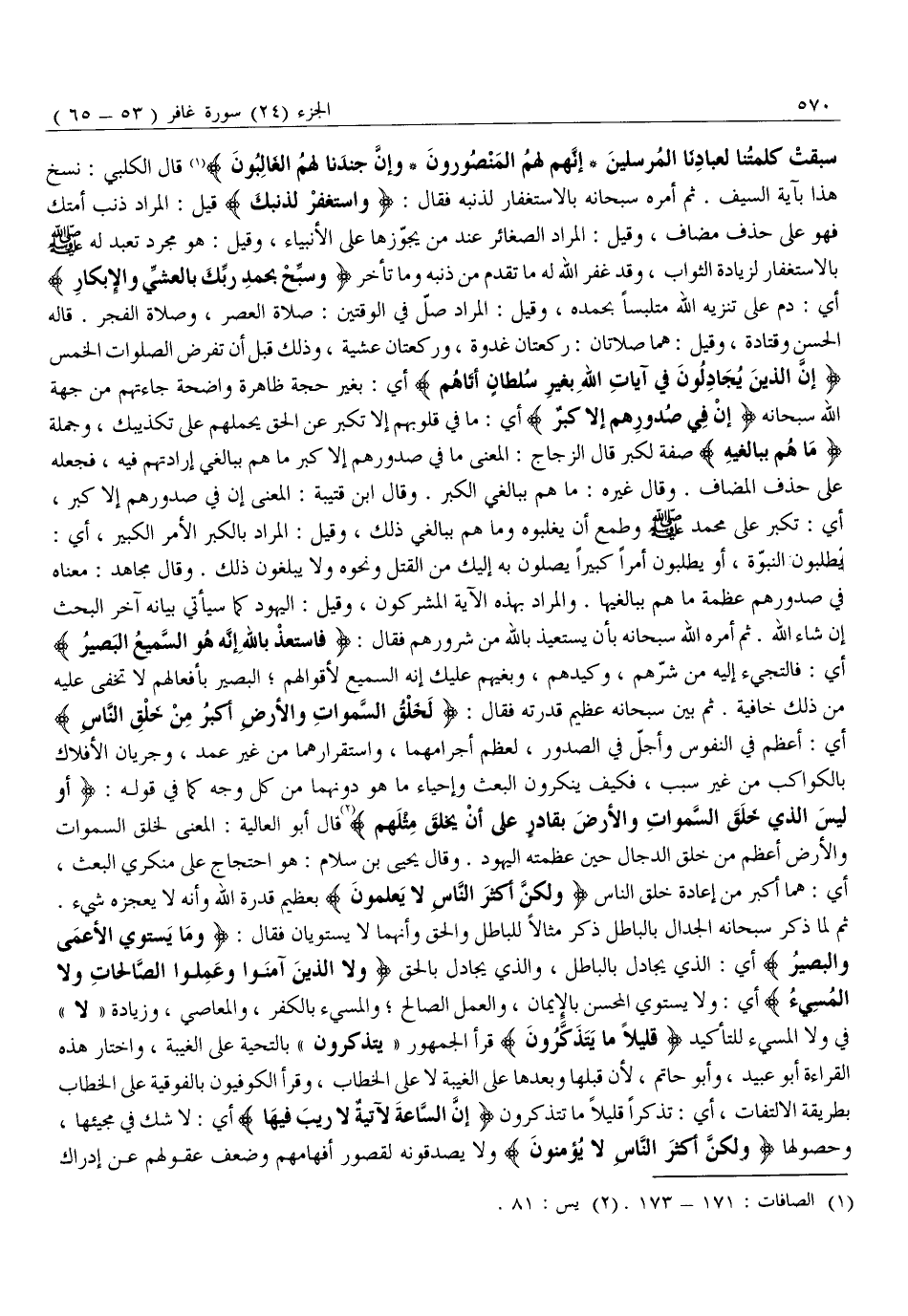 وَلَقَدْ سَبَقَتْ كَلِمَتُنا لِعِبادِنَا الْمُرْسَلِينَ إِنَّهُمْ لَهُمُ الْمَنْصُورُونَ وَإِنَّ جُنْدَنا لَهُمُ الْغالِبُونَ «1» قَالَ الْكَلْبِيُّ: نُسِخَ هَذَا بِآيَةِ السَّيْفِ. ثُمَّ أَمَرَهُ سُبْحَانَهُ بِالِاسْتِغْفَارِ لِذَنْبِهِ فَقَالَ: وَاسْتَغْفِرْ لِذَنْبِكَ قِيلَ: الْمُرَادُ ذَنْبُ أُمَّتِكَ فَهُوَ عَلَى حَذْفِ مُضَافٍ، وَقِيلَ: الْمُرَادُ الصَّغَائِرُ عِنْدَ مَنْ يُجَوِّزُهَا عَلَى الْأَنْبِيَاءِ، وَقِيلَ: هُوَ مُجَرَّدُ تَعَبُّدٍ لَهُ صلّى الله عليه وَسَلَّمَ بِالِاسْتِغْفَارِ لِزِيَادَةِ الثَّوَابِ، وَقَدْ غَفَرَ اللَّهُ لَهُ مَا تَقَدَّمَ مِنْ ذَنْبِهِ وَمَا تَأَخَّرَ وَسَبِّحْ بِحَمْدِ رَبِّكَ بِالْعَشِيِّ وَالْإِبْكارِ أَيْ: دُمْ على تنزيه الله متلبسا بِحَمْدِهِ، وَقِيلَ: الْمُرَادُ صَلِّ فِي الْوَقْتَيْنِ: صَلَاةَ الْعَصْرِ، وَصَلَاةَ الْفَجْرِ. قَالَهُ الْحَسَنُ وَقَتَادَةُ، وَقِيلَ: هُمَا صَلَاتَانِ: رَكْعَتَانِ غُدْوَةً، وَرَكْعَتَانِ عَشِيَّةً، وَذَلِكَ قَبْلَ أَنْ تُفْرَضَ الصَّلَوَاتُ الْخَمْسُ إِنَّ الَّذِينَ يُجادِلُونَ فِي آياتِ اللَّهِ بِغَيْرِ سُلْطانٍ أَتاهُمْ أَيْ: بِغَيْرِ حُجَّةٍ ظَاهِرَةٍ وَاضِحَةٍ جَاءَتْهُمْ مِنْ جِهَةِ اللَّهِ سُبْحَانَهُ إِنْ فِي صُدُورِهِمْ إِلَّا كِبْرٌ أي: ما في قلوبهم إلا تكبر عَنِ الْحَقِّ يَحْمِلُهُمْ عَلَى تَكْذِيبِكَ، وَجُمْلَةُ مَا هُمْ بِبالِغِيهِ صفة لكبر قَالَ الزَّجَّاجُ: الْمَعْنَى مَا فِي صُدُورِهِمْ إِلَّا كِبْرٌ مَا هُمْ بِبَالِغِي إِرَادَتِهِمْ فِيهِ، فَجَعَلَهُ عَلَى حَذْفِ الْمُضَافِ. وَقَالَ غَيْرُهُ: مَا هُمْ بِبَالِغِي الْكِبْرَ. وَقَالَ ابْنُ قُتَيْبَةَ: الْمَعْنَى إِنْ فِي صُدُورِهِمْ إِلَّا كِبْرٌ، أَيْ: تَكَبُّرٌ عَلَى محمد صلّى الله عليه وَسَلَّمَ وَطَمَعٌ أَنْ يَغْلِبُوهُ وَمَا هُمْ بِبَالِغِي ذَلِكَ، وَقِيلَ: الْمُرَادُ بِالْكِبْرِ الْأَمْرُ الْكَبِيرُ، أَيْ: