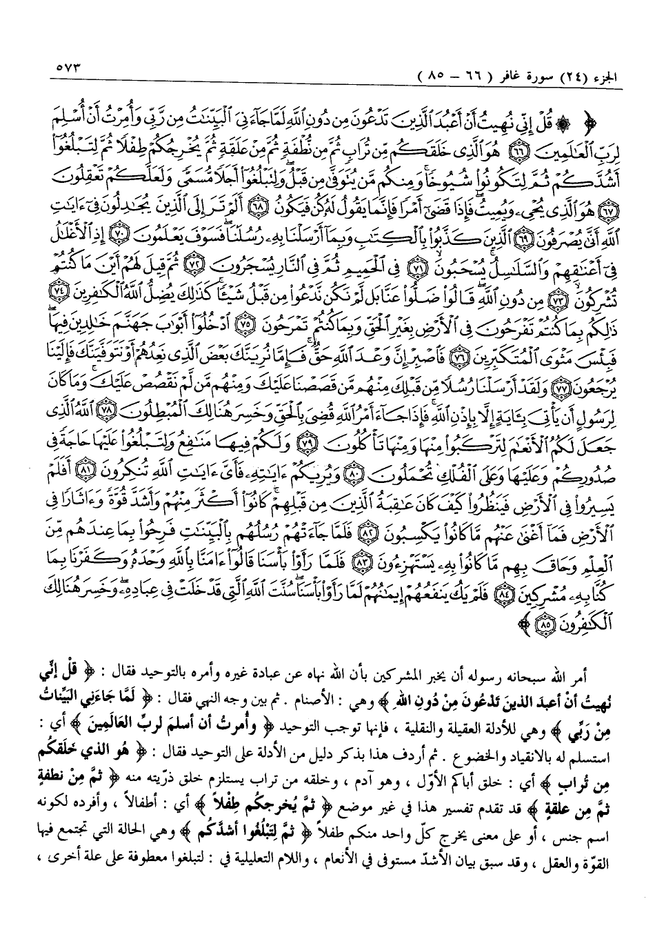 قُلْ إِنِّي نُهِيتُ أَنْ أَعْبُدَ الَّذِينَ تَدْعُونَ مِنْ دُونِ اللَّهِ لَمَّا جاءَنِي الْبَيِّناتُ مِنْ رَبِّي وَأُمِرْتُ أَنْ أُسْلِمَ لِرَبِّ الْعالَمِينَ (66) هُوَ الَّذِي خَلَقَكُمْ مِنْ تُرابٍ ثُمَّ مِنْ نُطْفَةٍ ثُمَّ مِنْ عَلَقَةٍ ثُمَّ يُخْرِجُكُمْ طِفْلاً ثُمَّ لِتَبْلُغُوا أَشُدَّكُمْ ثُمَّ لِتَكُونُوا شُيُوخاً وَمِنْكُمْ مَنْ يُتَوَفَّى مِنْ قَبْلُ وَلِتَبْلُغُوا أَجَلاً مُسَمًّى وَلَعَلَّكُمْ تَعْقِلُونَ (67) هُوَ الَّذِي يُحْيِي وَيُمِيتُ فَإِذا قَضى أَمْراً فَإِنَّما يَقُولُ لَهُ كُنْ فَيَكُونُ (68) أَلَمْ تَرَ إِلَى الَّذِينَ يُجادِلُونَ فِي آياتِ اللَّهِ أَنَّى يُصْرَفُونَ (69) الَّذِينَ كَذَّبُوا بِالْكِتابِ وَبِما أَرْسَلْنا بِهِ رُسُلَنا فَسَوْفَ يَعْلَمُونَ (70)