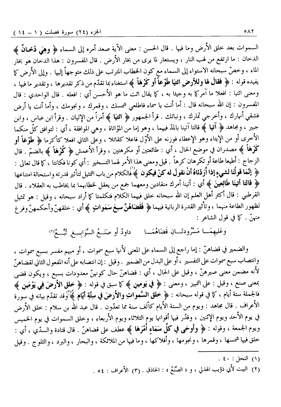 إِنَّما قَوْلُنا لِشَيْءٍ إِذا أَرَدْناهُ أَنْ نَقُولَ لَهُ كُنْ فَيَكُونُ «1» فَالْكَلَامُ مِنْ بَابِ التَّمْثِيلِ لِتَأْثِيرِ قُدْرَتِهِ وَاسْتِحَالَةِ امْتِنَاعِهَا قالَتا أَتَيْنا طائِعِينَ أَيْ: أَتَيْنَا أَمْرَكَ منقادين ومعهما جَمْعَ مَنْ يَعْقِلُ لِخِطَابِهِمَا بِمَا يُخَاطَبُ بِهِ الْعُقَلَاءُ. قَالَ الْقُرْطُبِيُّ: قَالَ أَكْثَرُ أَهْلِ الْعِلْمِ إِنَّ اللَّهَ سُبْحَانَهُ خَلَقَ فِيهِمَا الْكَلَامَ فَتَكَلَّمَتَا كَمَا أَرَادَ سُبْحَانَهُ، وَقِيلَ: هُوَ تَمْثِيلٌ لِظُهُورِ الطَّاعَةِ مِنْهُمَا، وَتَأْثِيرِ الْقُدْرَةِ الرَّبَّانِيَّةِ فِيهِمَا فَقَضاهُنَّ سَبْعَ سَماواتٍ أَيْ: خَلَقَهُنَّ وَأَحْكَمَهُنَّ وَفَرَغَ مِنْهُنَّ. كَمَا فِي قَوْلِ الشَّاعِرِ: