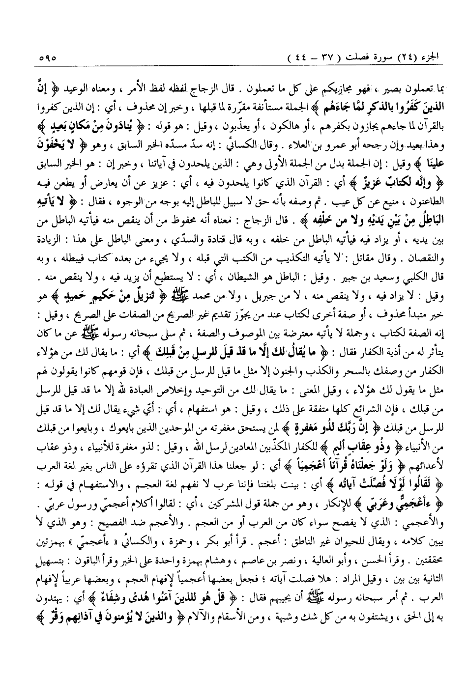 بِمَا تَعْمَلُونَ بَصِيرٌ، فَهُوَ مُجَازِيكُمْ عَلَى كُلِّ مَا تَعْمَلُونَ. قَالَ الزَّجَّاجُ لَفْظُهُ لَفْظُ الْأَمْرِ، وَمَعْنَاهُ الْوَعِيدُ إِنَّ الَّذِينَ كَفَرُوا بِالذِّكْرِ لَمَّا جاءَهُمْ الْجُمْلَةُ مُسْتَأْنَفَةٌ مُقَرِّرَةٌ لِمَا قَبْلَهَا، وَخَبَرُ إِنَّ مَحْذُوفٌ، أَيْ: إِنَّ الَّذِينَ كَفَرُوا بِالْقُرْآنِ لَمَّا جَاءَهُمْ يُجَازَوْنَ بِكُفْرِهِمْ، أَوْ هَالِكُونَ، أَوْ يُعَذَّبُونَ، وَقِيلَ: هُوَ قَوْلُهُ: يُنادَوْنَ مِنْ مَكانٍ بَعِيدٍ وَهَذَا بَعِيدٌ وَإِنْ رَجَّحَهُ أَبُو عَمْرِو بْنُ الْعَلَاءِ. وَقَالَ الْكِسَائِيُّ: إِنَّهُ سَدَّ مَسَدَّهُ الْخَبَرُ السَّابِقُ، وَهُوَ لَا يَخْفَوْنَ عَلَيْنا وَقِيلَ: إِنَّ الْجُمْلَةَ بَدَلٌ مِنَ الْجُمْلَةِ الْأُولَى وَهِيَ: الَّذِينَ يُلْحِدُونَ فِي آيَاتِنَا، وَخَبَرُ إِنَّ: هُوَ الْخَبَرُ السَّابِقُ وَإِنَّهُ لَكِتابٌ عَزِيزٌ أَيِ: الْقُرْآنُ الَّذِي كَانُوا يُلْحِدُونَ فِيهِ، أَيْ: عَزِيزٌ عَنْ أن يعارض أن يَطْعَنَ فِيهِ الطَّاعِنُونَ، مَنِيعٌ عَنْ كُلِّ عَيْبٍ. ثُمَّ وَصَفَهُ بِأَنَّهُ حَقٌّ لَا سَبِيلَ لِلْبَاطِلِ إِلَيْهِ بِوَجْهٍ مِنَ الْوُجُوهِ، فَقَالَ: لَا يَأْتِيهِ الْباطِلُ مِنْ بَيْنِ يَدَيْهِ وَلا مِنْ خَلْفِهِ. قَالَ الزَّجَّاجُ: مَعْنَاهُ أَنَّهُ مَحْفُوظٌ مِنْ أَنْ يُنْقَصَ مِنْهُ فَيَأْتِيهِ الْبَاطِلُ مِنْ بَيْنِ يَدَيْهِ، أَوْ يُزَادَ فِيهِ فَيَأْتِيهِ الْبَاطِلُ مِنْ خَلْفِهِ، وَبِهِ قَالَ قَتَادَةُ وَالسُّدِّيُّ، وَمَعْنَى الْبَاطِلِ عَلَى هَذَا: الزِّيَادَةُ وَالنُّقْصَانُ. وَقَالَ مُقَاتِلٌ: لَا يَأْتِيهِ التَّكْذِيبُ مِنَ الْكُتُبِ الَّتِي قَبْلَهُ، وَلَا يَجِيءُ مِنْ بَعْدِهِ كِتَابٌ فَيُبْطِلُهُ، وَبِهِ قَالَ الْكَلْبِيُّ وَسَعِيدُ بْنُ جُبَيْرٍ. وَقِيلَ: الْبَاطِلُ هُوَ الشَّيْطَانُ، أَيْ: لَا يَسْتَطِيعُ أَنْ يَزِيدَ فِيهِ، وَلَا يَنْقُصَ مِنْهُ.