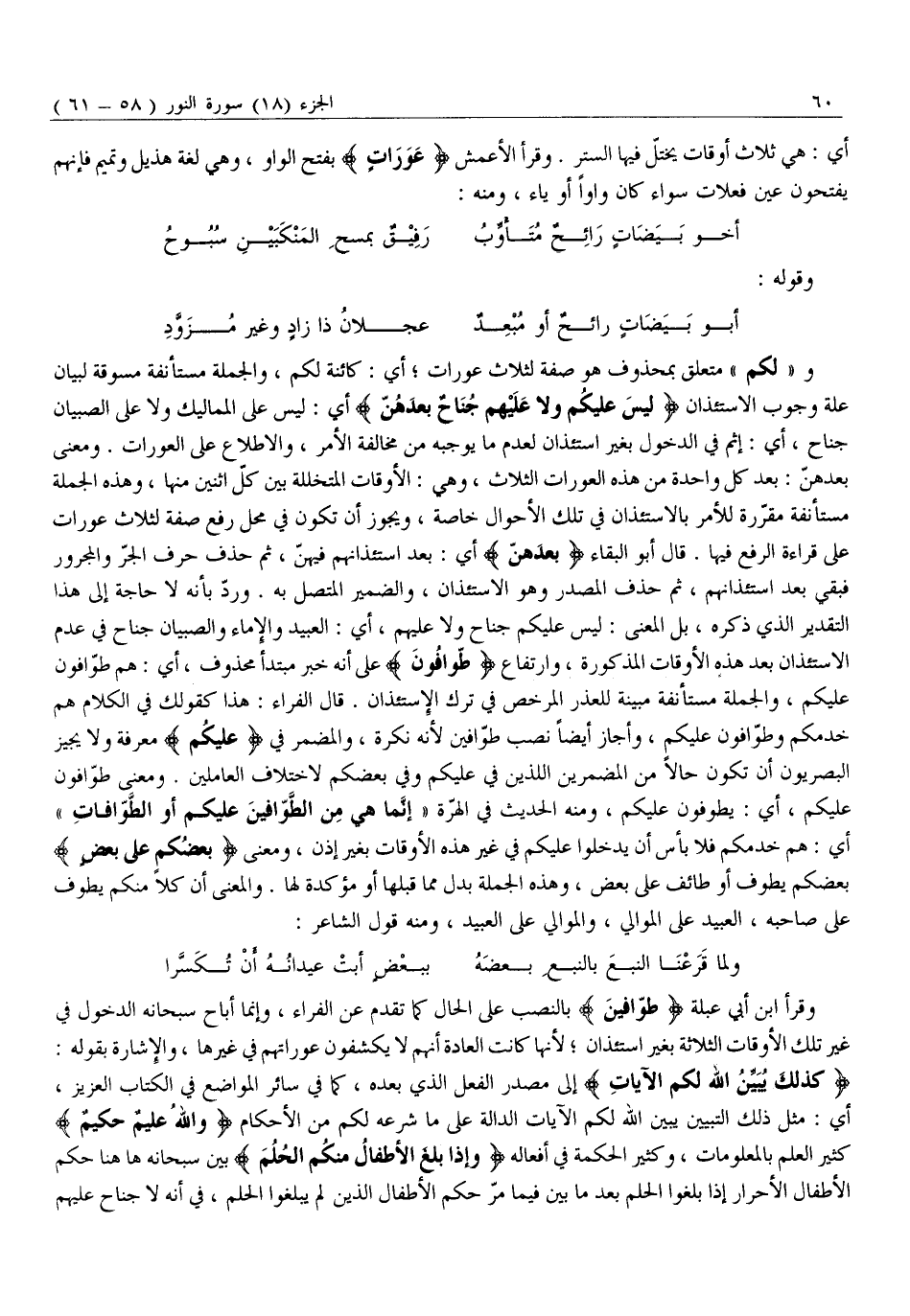 كَذلِكَ يُبَيِّنُ اللَّهُ لَكُمُ الْآياتِ إِلَى مَصْدَرِ الْفِعْلِ الَّذِي بَعْدَهُ، كَمَا فِي سَائِرِ الْمَوَاضِعِ فِي الْكِتَابِ الْعَزِيزِ، أَيْ: مِثْلُ ذَلِكَ التَّبْيِينِ يُبَيِّنُ اللَّهُ لَكُمُ الْآيَاتِ الدَّالَّةَ عَلَى مَا شَرَعَهُ لَكُمْ مِنَ الْأَحْكَامِ وَاللَّهُ عَلِيمٌ حَكِيمٌ كَثِيرُ الْعِلْمِ بِالْمَعْلُومَاتِ، وَكَثِيرُ الْحِكْمَةِ فِي أَفْعَالِهِ وَإِذا بَلَغَ الْأَطْفالُ مِنْكُمُ الْحُلُمَ بَيَّنَ سُبْحَانَهُ هَاهُنَا حُكْمَ الْأَطْفَالِ الْأَحْرَارِ إِذَا بَلَغُوا الْحُلُمَ بَعْدَ مَا بَيَّنَ فِيمَا مَرَّ حُكْمَ الْأَطْفَالِ الَّذِينَ لَمْ يَبْلُغُوا الْحُلُمَ، فِي أَنَّهُ لَا جُنَاحَ عَلَيْهِمْ