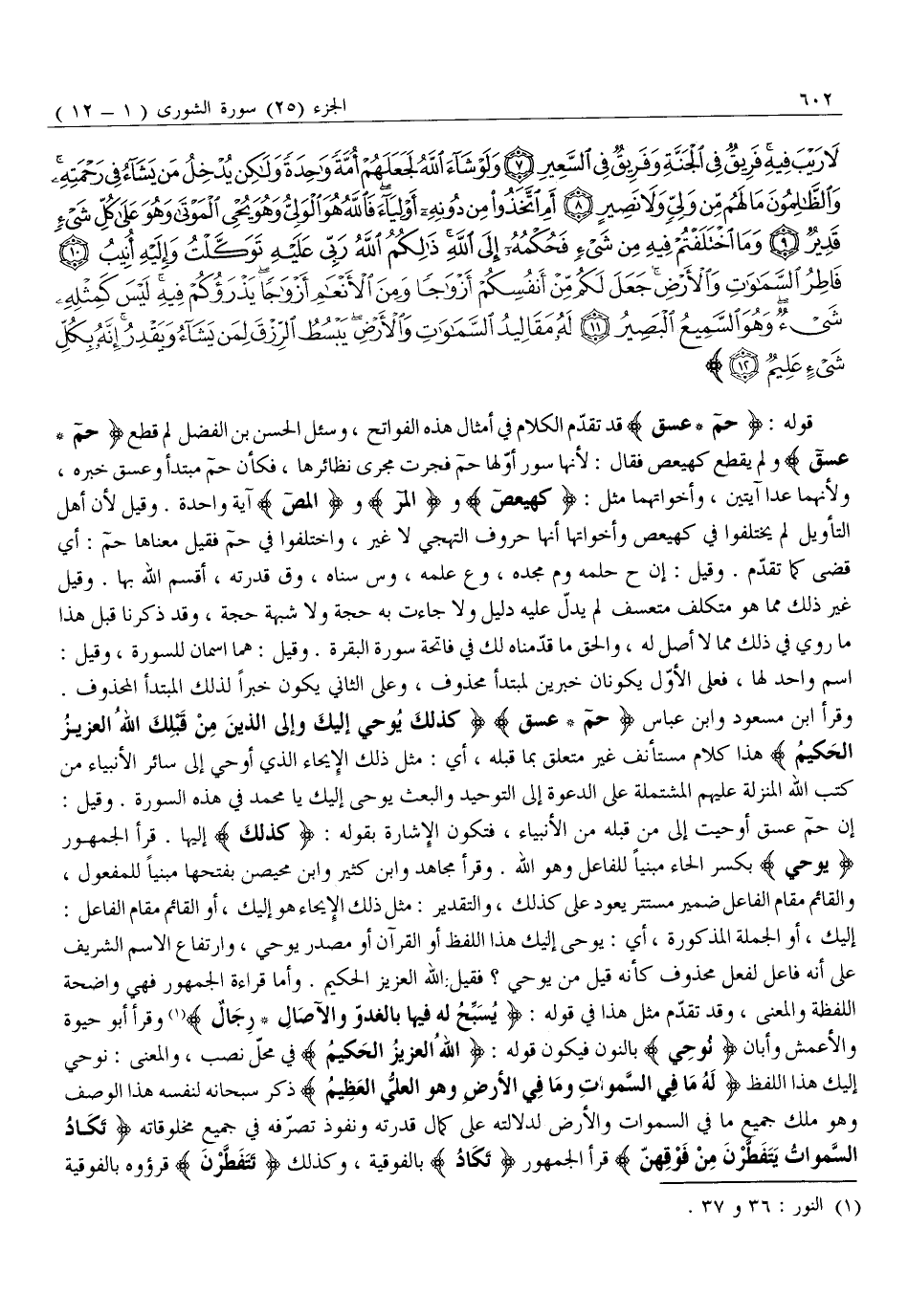 قَوْلُهُ: حم عسق قَدْ تَقَدَّمَ الْكَلَامُ فِي أَمْثَالِ هَذِهِ الْفَوَاتِحِ، وَسُئِلَ الْحَسَنُ بْنُ الْفَضْلِ لِمَ قَطَعَ حم عسق، وَلَمْ يَقْطَعْ كهيعص فَقَالَ: لِأَنَّهَا سُوَرٌ أَوَّلُهَا حم فَجَرَتْ مَجْرَى نَظَائِرِهَا، فَكَأَنَّ حم مُبْتَدَأٌ وَعسق خَبَرُهُ، وَلِأَنَّهُمَا عَدَا آيَتَيْنِ، وَأَخَوَاتُهُمَا مِثْلُ: كهيعص وَالمر وَالمص آيَةٌ وَاحِدَةٌ. وَقِيلَ لِأَنَّ أَهْلَ التَّأْوِيلِ لَمْ يَخْتَلِفُوا فِي كهيعص وَأَخَوَاتِهَا أَنَّهَا حُرُوفُ التَّهَجِّي لَا غَيْرَ، وَاخْتَلَفُوا فِي حم فَقِيلَ مَعْنَاهَا حُمَّ: أَيْ قَضَى كَمَا تَقَدَّمَ. وَقِيلَ: إِنَّ ح حِلْمُهُ وَم مَجْدُهُ، وَع عِلْمُهُ، وَس سَنَاهُ، وَق قُدْرَتُهُ، أَقْسَمَ اللَّهُ بِهَا. وَقِيلَ غَيْرُ ذَلِكَ مِمَّا هُوَ مُتَكَلَّفٌ مُتَعَسَّفٌ لَمْ يَدُلَّ عَلَيْهِ دَلِيلٌ وَلَا جَاءَتْ بِهِ حُجَّةٌ وَلَا شُبْهَةُ حُجَّةٍ، وَقَدْ ذَكَرْنَا قَبْلَ هَذَا مَا رُوِيَ فِي ذَلِكَ مِمَّا لَا أَصْلَ لَهُ، وَالْحَقُّ مَا قَدَّمْنَاهُ لَكَ فِي فَاتِحَةِ سُورَةِ الْبَقَرَةِ. وَقِيلَ: هُمَا اسْمَانِ لِلسُّورَةِ، وَقِيلَ: