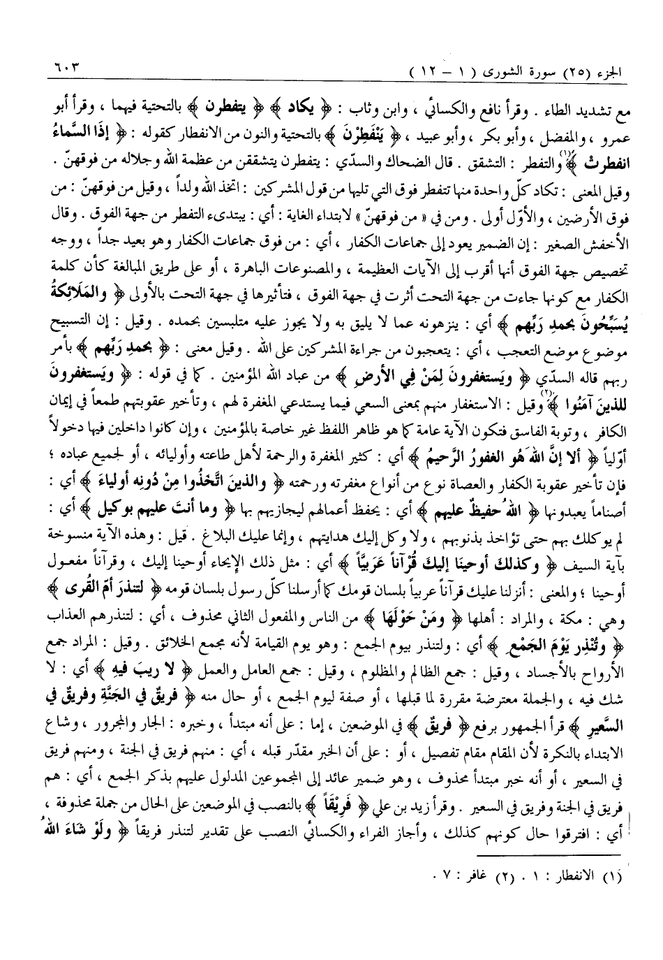 وَقِيلَ الْمَعْنَى: تَكَادُ كُلُّ وَاحِدَةٍ مِنْهَا تَتَفَطَّرُ فَوْقَ الَّتِي تَلِيهَا مِنْ قَوْلِ الْمُشْرِكِينَ: اتَّخَذَ اللَّهُ وَلَدًا، وَقِيلَ مِنْ فَوْقِهِنَّ: مِنْ فَوْقِ الْأَرَضِينَ، وَالْأَوَّلُ أَوْلَى. وَمِنْ فِي «مِنْ فَوْقِهِنَّ» لِابْتِدَاءِ الْغَايَةِ: أَيْ: يَبْتَدِئُ التَّفَطُّرُ مِنْ جِهَةِ الْفَوْقِ. وَقَالَ الْأَخْفَشُ الصَّغِيرُ: إِنَّ الضَّمِيرَ يَعُودُ إِلَى جَمَاعَاتِ الْكُفَّارِ، أَيْ: مِنْ فَوْقِ جَمَاعَاتِ الْكُفَّارِ وَهُوَ بَعِيدٌ جِدًّا، وَوَجْهُ تَخْصِيصِ جِهَةِ الْفَوْقِ أَنَّهَا أَقْرَبُ إِلَى الْآيَاتِ الْعَظِيمَةِ، وَالْمَصْنُوعَاتِ الْبَاهِرَةِ، أَوْ عَلَى طَرِيقِ الْمُبَالَغَةِ كَأَنَّ كَلِمَةَ الْكُفَّارِ مَعَ كَوْنِهَا جَاءَتْ مِنْ جِهَةِ التَّحْتِ أَثَّرَتْ فِي جِهَةِ الْفَوْقِ، فَتَأْثِيرُهَا فِي جِهَةِ التَّحْتِ بِالْأَوْلَى وَالْمَلائِكَةُ يُسَبِّحُونَ بِحَمْدِ رَبِّهِمْ أَيْ: يُنَزِّهُونَهُ عَمَّا لَا يَلِيقُ بِهِ وَلَا يَجُوزُ عَلَيْهِ مُتَلَبِّسِينَ بِحَمْدِهِ. وَقِيلَ: إِنَّ التَّسْبِيحَ مَوْضُوعٌ مَوْضِعَ التَّعَجُّبِ، أَيْ: يَتَعَجَّبُونَ مِنْ جَرَاءَةِ الْمُشْرِكِينَ عَلَى اللَّهِ. وَقِيلَ مَعْنَى: بِحَمْدِ رَبِّهِمْ بِأَمْرِ رَبِّهِمْ قَالَهُ السُّدِّيُّ وَيَسْتَغْفِرُونَ لِمَنْ فِي الْأَرْضِ مِنْ عِبَادِ اللَّهِ الْمُؤْمِنِينَ. كَمَا فِي قَوْلِهِ: وَيَسْتَغْفِرُونَ لِلَّذِينَ آمَنُوا «2» وَقِيلَ: الِاسْتِغْفَارُ مِنْهُمْ بِمَعْنَى السَّعْيِ فِيمَا يَسْتَدْعِي الْمَغْفِرَةَ لَهُمْ، وَتَأْخِيرَ عُقُوبَتِهِمْ طَمَعًا فِي إِيمَانِ الْكَافِرِ، وَتَوْبَةِ الْفَاسِقِ فَتَكُونُ الْآيَةُ عَامَّةً كَمَا هُوَ ظَاهِرُ اللَّفْظِ غَيْرَ خَاصَّةٍ بِالْمُؤْمِنِينَ، وَإِنْ كَانُوا دَاخِلِينَ فِيهَا دُخُولًا أَوَّلِيًّا أَلا إِنَّ اللَّهَ هُوَ الْغَفُورُ الرَّحِيمُ أَيْ: كَثِيرُ الْمَغْفِرَةِ وَالرَّحْمَةِ لِأَهْلِ طَاعَتِهِ وَأَوْلِيَائِهِ، أَوْ لِجَمِيعِ عِبَادِهِ فَإِنَّ تَأْخِيرَ عُقُوبَةِ الْكُفَّارِ وَالْعُصَاةِ نَوْعٌ مِنْ أَنْوَاعِ مَغْفِرَتِهِ وَرَحْمَتِهِ وَالَّذِينَ اتَّخَذُوا مِنْ دُونِهِ أَوْلِياءَ أَيْ: