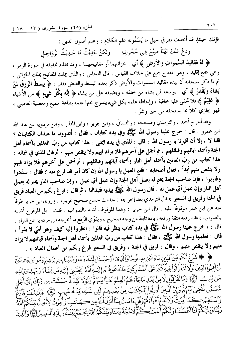 وَقَدْ أَخْرَجَ أَحْمَدُ، وَالتِّرْمِذِيُّ وَصَحَّحَهُ، وَالنَّسَائِيُّ، وَابْنُ جَرِيرٍ، وَابْنُ الْمُنْذِرِ، وَابْنُ مَرْدَوَيْهِ عَنْ عَبْدِ الله ابن عَمْرٍو. قَالَ: خَرَجَ عَلَيْنَا رَسُولُ اللَّهِ صَلَّى اللَّهُ عَلَيْهِ وَسَلَّمَ وَفِي يَدِهِ كِتَابَانِ. فَقَالَ: أَتَدْرُونَ مَا هَذَانِ الْكِتَابَانِ؟