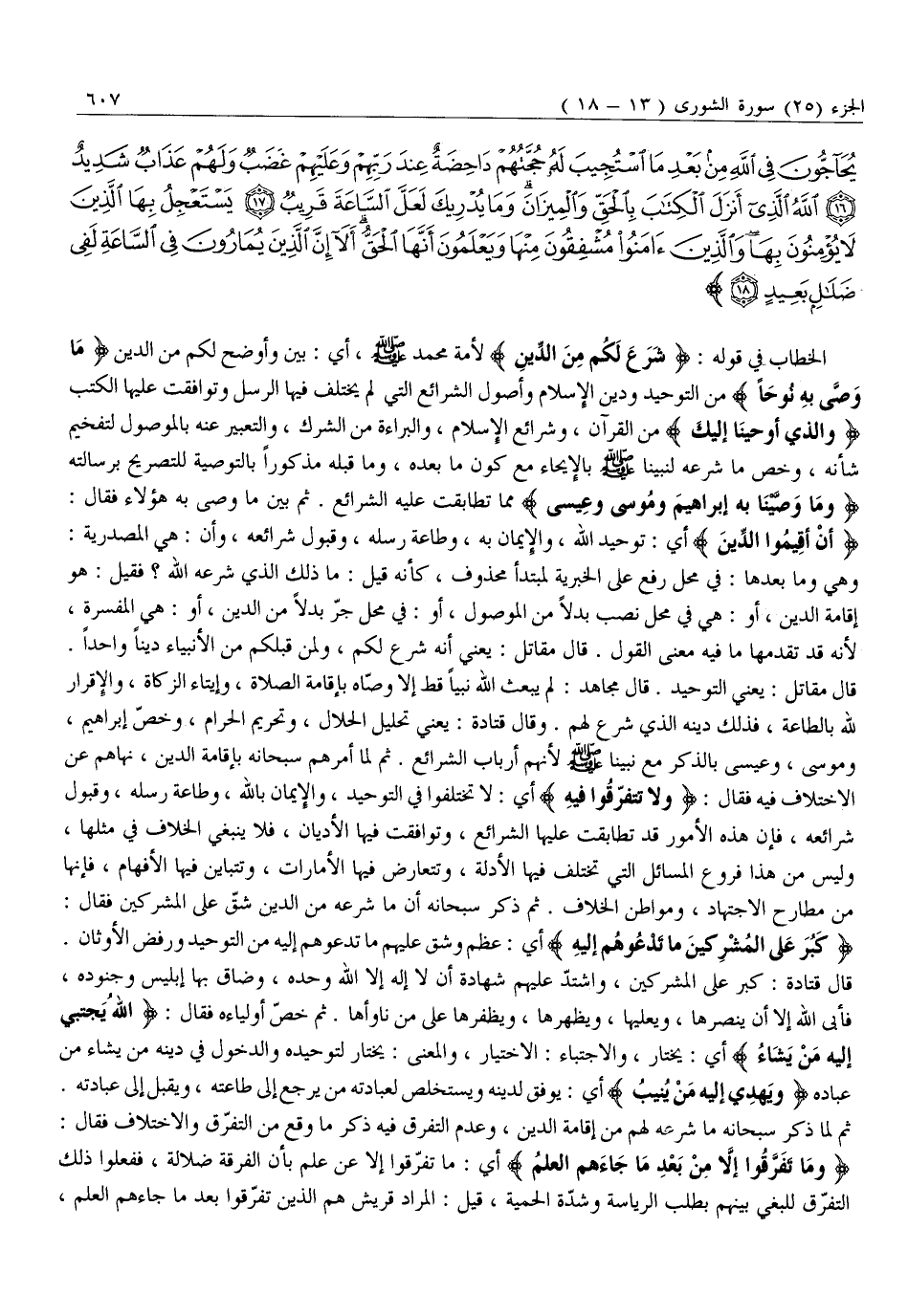 الْخِطَابُ فِي قَوْلِهِ: شَرَعَ لَكُمْ مِنَ الدِّينِ لأمة محمد صلّى الله عليه وَسَلَّمَ، أَيْ: بَيَّنَ وَأَوْضَحَ لَكُمْ مِنَ الدِّينِ مَا وَصَّى بِهِ نُوحاً مِنَ التَّوْحِيدِ وَدِينِ الْإِسْلَامِ وَأُصُولِ الشَّرَائِعِ الَّتِي لَمْ يَخْتَلِفْ فِيهَا الرُّسُلُ وَتَوَافَقَتْ عَلَيْهَا الْكُتُبُ وَالَّذِي أَوْحَيْنا إِلَيْكَ مِنَ الْقُرْآنِ، وَشَرَائِعِ الْإِسْلَامِ، وَالْبَرَاءَةِ مِنَ الشِّرْكِ، وَالتَّعْبِيرُ عَنْهُ بِالْمَوْصُولِ لِتَفْخِيمِ شَأْنِهِ، وَخَصَّ مَا شرعه لنبينا صلّى الله عليه وَسَلَّمَ بِالْإِيحَاءِ مَعَ كَوْنِ مَا بَعْدَهُ، وَمَا قَبْلَهُ مَذْكُورًا بِالتَّوْصِيَةِ لِلتَّصْرِيحِ بِرِسَالَتِهِ وَما وَصَّيْنا بِهِ إِبْراهِيمَ وَمُوسى وَعِيسى مِمَّا تَطَابَقَتْ عَلَيْهِ الشَّرَائِعُ. ثُمَّ بَيَّنَ مَا وَصَّى بِهِ هَؤُلَاءِ فَقَالَ: