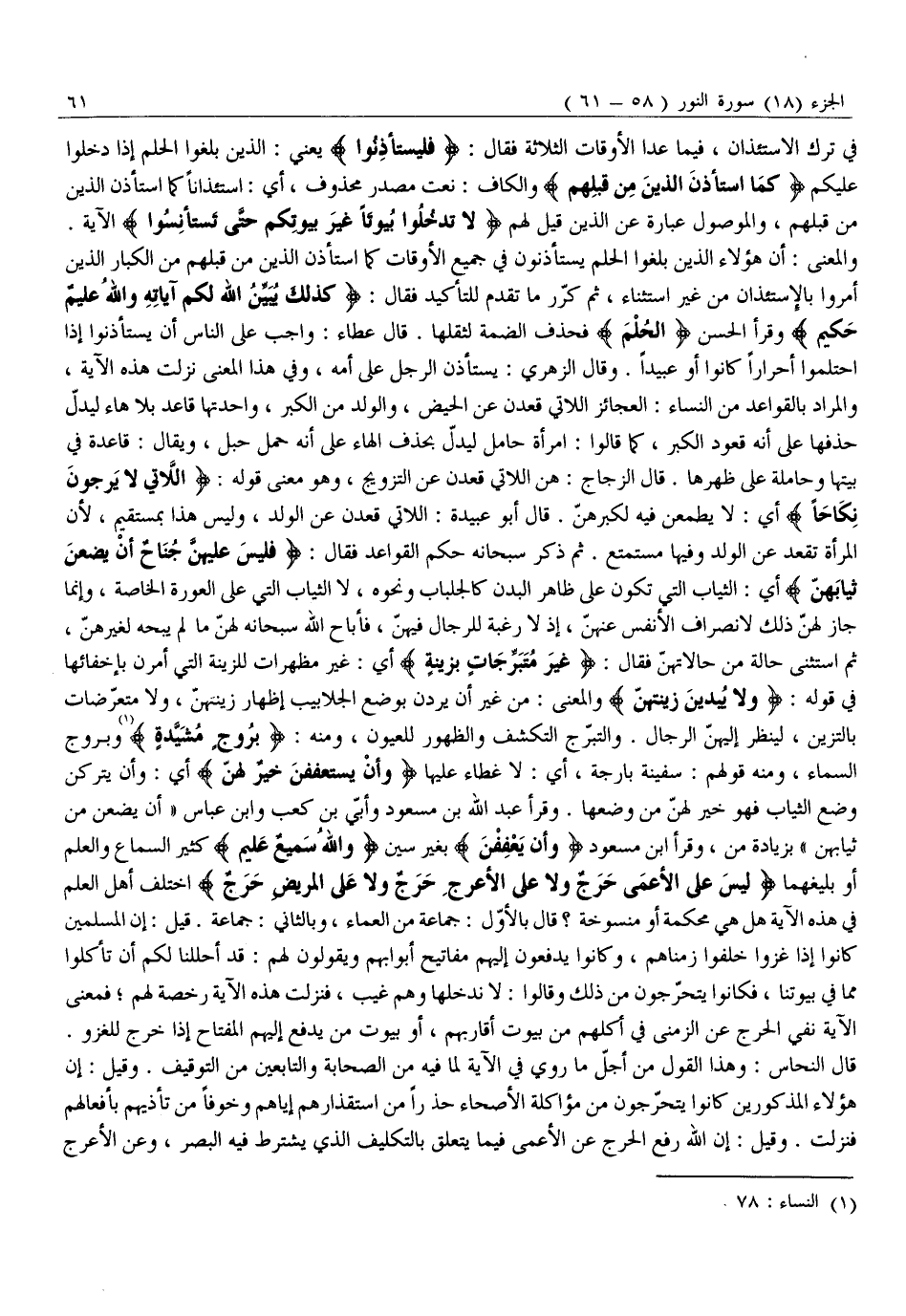 وَالْمَعْنَى: أَنَّ هَؤُلَاءِ الَّذِينَ بَلَغُوا الْحُلُمَ يَسْتَأْذِنُونَ فِي جَمِيعِ الْأَوْقَاتِ كَمَا اسْتَأْذَنَ الَّذِينَ مِنْ قَبْلِهِمْ مِنَ الْكِبَارِ الَّذِينَ أُمِرُوا بِالِاسْتِئْذَانِ مِنْ غَيْرِ اسْتِثْنَاءٍ، ثُمَّ كَرَّرَ مَا تَقَدَّمَ لِلتَّأْكِيدِ فَقَالَ: كَذلِكَ يُبَيِّنُ اللَّهُ لَكُمْ آياتِهِ وَاللَّهُ عَلِيمٌ حَكِيمٌ وَقَرَأَ الْحَسَنُ الْحُلُمَ فَحَذَفَ الضَّمَّةَ لِثِقَلِهَا. قَالَ عَطَاءٌ: وَاجِبٌ عَلَى النَّاسِ أَنْ يَسْتَأْذِنُوا إِذَا احْتَلَمُوا أَحْرَارًا كَانُوا أَوْ عَبِيْدًا. وَقَالَ الزُّهْرِيُّ: يَسْتَأْذِنُ الرَّجُلُ عَلَى أُمِّهِ، وَفِي هَذَا الْمَعْنَى نَزَلَتْ هَذِهِ الْآيَةُ، وَالْمُرَادُ بِالْقَوَاعِدِ مِنَ النِّسَاءِ: الْعَجَائِزُ اللَّاتِي قَعَدْنَ عَنِ الْحَيْضِ، وَالْوَلَدِ مِنَ الْكِبَرِ، وَاحِدَتُهَا قَاعِدٌ بِلَا هَاءٍ لِيَدُلَّ حَذْفُهَا عَلَى أَنَّهُ قُعُودُ الْكِبَرِ، كَمَا قَالُوا: امْرَأَةٌ حَامِلٌ لِيَدُلَّ بِحَذْفِ الْهَاءِ عَلَى أَنَّهُ حَمْلُ حَبَلٍ، وَيُقَالُ: قَاعِدَةٌ فِي بَيْتِهَا وَحَامِلَةٌ عَلَى ظَهْرِهَا. قَالَ الزَّجَّاجُ: هُنَّ اللَّاتِي قَعَدْنَ عَنِ التَّزْوِيجِ، وَهُوَ مَعْنَى قَوْلِهِ: اللَّاتِي لَا يَرْجُونَ نِكاحاً أَيْ: لَا يَطْمَعْنَ فيه لكبرهنّ. قال أَبُو عُبَيْدَةَ: اللَّاتِي قَعَدْنَ عَنِ الْوَلَدِ، وَلَيْسَ هَذَا بِمُسْتَقِيمٍ، لِأَنَّ الْمَرْأَةَ تَقْعُدُ عَنِ الْوَلَدِ وَفِيهَا مُسْتَمْتَعٌ. ثُمَّ ذَكَرَ سُبْحَانَهُ حُكْمَ الْقَوَاعِدِ فَقَالَ: فَلَيْسَ عَلَيْهِنَّ جُناحٌ أَنْ يَضَعْنَ ثِيابَهُنَّ أَيِ: الثِّيَابَ الَّتِي تَكُونُ عَلَى ظَاهِرِ الْبَدَنِ كالجلباب ونحوه، لا الثِّيَابُ الَّتِي عَلَى الْعَوْرَةِ الْخَاصَّةِ، وَإِنَّمَا جَازَ لَهُنَّ ذَلِكَ لِانْصِرَافِ الْأَنْفُسِ عَنْهُنَّ، إِذْ لَا رَغْبَةَ لِلرِّجَالِ فِيهِنَّ، فَأَبَاحَ اللَّهُ سُبْحَانَهُ لَهُنَّ مَا لَمْ يُبِحْهُ لِغَيْرِهِنَّ، ثُمَّ اسْتَثْنَى حَالَةً مِنْ حَالَاتِهِنَّ فَقَالَ: غَيْرَ مُتَبَرِّجاتٍ بِزِينَةٍ أَيْ: غَيْرَ مُظْهِرَاتٍ لِلزِّينَةِ الَّتِي أُمِرْنَ بِإِخْفَائِهَا فِي قوله: وَلا يُبْدِينَ زِينَتَهُنَّ وَالْمَعْنَى: مِنْ غَيْرِ أَنْ يُرِدْنَ بِوَضْعِ الْجَلَابِيبِ إِظْهَارَ زَيَّنَتْهُنَّ، وَلَا مُتَعَرِّضَاتٍ بِالتَّزَيُّنِ، لِيَنْظُرَ إِلَيْهِنَّ الرِّجَالُ. وَالتَّبَرُّجُ التَّكَشُّفُ وَالظُّهُورُ لِلْعُيُونِ، وَمِنْهُ: بُرُوجٍ مُشَيَّدَةٍ «1» وَبُرُوجُ السَّمَاءِ، وَمِنْهُ قَوْلُهُمْ: سَفِينَةٌ بَارِجَةٌ، أَيْ: لَا غِطَاءَ عَلَيْهَا وَأَنْ يَسْتَعْفِفْنَ خَيْرٌ لَهُنَّ أَيْ: وَأَنْ يَتْرُكْنَ وَضْعَ الثِّيَابِ فَهُوَ خَيْرٌ لَهُنَّ مِنْ وَضْعِهَا. وَقَرَأَ عَبْدُ اللَّهِ بْنُ مَسْعُودٍ وَأُبَيُّ بْنُ كَعْبٍ وَابْنُ عَبَّاسٍ «أَنْ يَضَعْنَ مِنْ ثِيَابِهِنَّ» بِزِيَادَةِ مِنْ، وَقَرَأَ ابْنُ مَسْعُودٍ «وَأَنْ يَعْفُفْنَ» بِغَيْرِ سِينٍ وَاللَّهُ سَمِيعٌ عَلِيمٌ كَثِيرُ السَّمَاعِ وَالْعِلْمِ أَوْ بَلِيغُهُمَا لَيْسَ عَلَى الْأَعْمى حَرَجٌ وَلا عَلَى الْأَعْرَجِ حَرَجٌ وَلا عَلَى الْمَرِيضِ حَرَجٌ اخْتَلَفَ أَهْلُ الْعِلْمِ فِي هَذِهِ الْآيَةِ هَلْ هِيَ مُحْكَمَةٌ أَوْ منسوخة؟ قال بالأوّل: جماعة من العماء، وَبِالثَّانِي: جَمَاعَةٌ. قِيلَ: إِنَّ الْمُسْلِمِينَ كَانُوا إِذَا غَزَوْا خَلَّفُوا زَمْنَاهُمْ، وَكَانُوا يَدْفَعُونَ إِلَيْهِمْ مَفَاتِيحَ أَبْوَابِهِمْ وَيَقُولُونَ لَهُمْ: قَدْ أَحْلَلْنَا لَكُمْ أَنْ تَأْكُلُوا مِمَّا فِي بُيُوتِنَا، فَكَانُوا يَتَحَرَّجُونَ مِنْ ذَلِكَ وَقَالُوا: لَا نَدْخُلُهَا وَهُمْ غُيَّبٌ، فَنَزَلَتْ هَذِهِ الْآيَةُ رُخْصَةً لَهُمْ فَمَعْنَى الْ