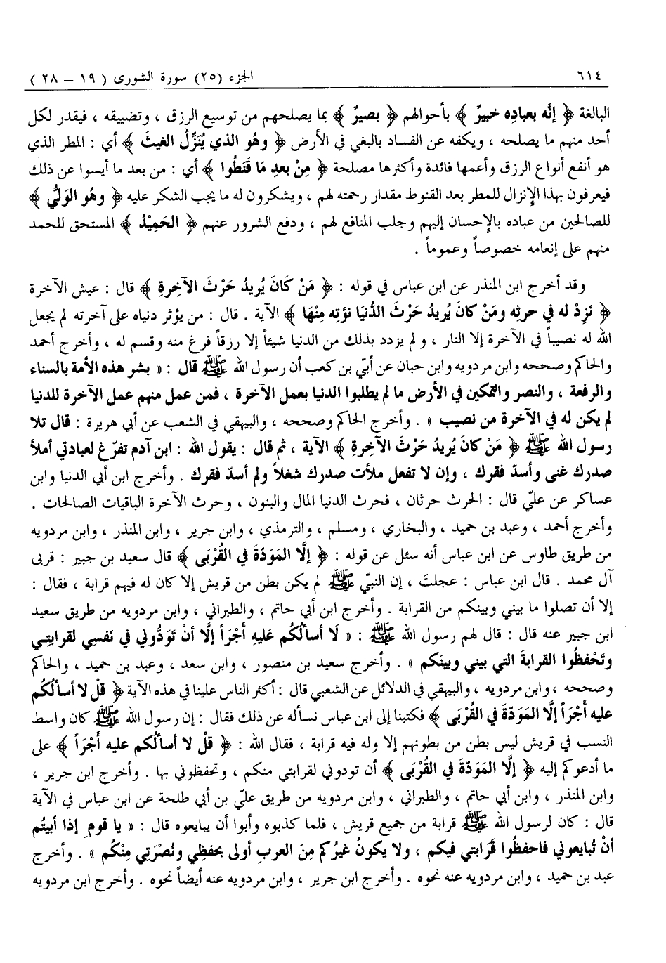 إِلَّا أَنْ تَصِلُوا مَا بَيْنِي وَبَيْنَكُمْ مِنَ الْقَرَابَةِ. وَأَخْرَجَ ابْنُ أَبِي حَاتِمٍ، وَالطَّبَرَانِيُّ، وَابْنُ مَرْدَوَيْهِ مِنْ طريق سعيد ابن جُبَيْرٍ عَنْهُ قَالَ: قَالَ لَهُمْ رَسُولُ اللَّهِ صَلَّى اللَّهُ عَلَيْهِ وَسَلَّمَ: «لَا أَسْأَلُكُمْ عَلَيْهِ أَجْرًا إِلَّا أَنْ تَوَدُّونِي فِي نَفْسِي لِقَرَابَتِي وَتَحْفَظُوا الْقَرَابَةَ الَّتِي بَيْنِي وَبَيْنَكُمْ» . وَأَخْرَجَ سَعِيدُ بْنُ مَنْصُورٍ، وَابْنُ سَعْدٍ، وَعَبْدُ بْنُ حُمَيْدٍ، وَالْحَاكِمُ وَصَحَّحَهُ، وَابْنُ مَرْدَوَيْهِ، وَالْبَيْهَقِيُّ فِي الدَّلَائِلِ عَنِ الشَّعْبِيِّ قَالَ: أَكْثَرَ النَّاسُ عَلَيْنَا فِي هَذِهِ الْآيَةِ قُلْ لا أَسْئَلُكُمْ عَلَيْهِ أَجْراً إِلَّا الْمَوَدَّةَ فِي الْقُرْبى فَكَتَبْنَا إِلَى ابْنِ عَبَّاسٍ نَسْأَلُهُ عَنْ ذَلِكَ فَقَالَ: أَنَّ رَسُولَ اللَّهِ صَلَّى اللَّهُ عَلَيْهِ وَسَلَّمَ كَانَ وَاسِطَ النَّسَبِ فِي قُرَيْشٍ لَيْسَ بَطْنٌ مِنْ بُطُونِهِمْ إِلَّا وَلَهُ فِيهِ قَرَابَةٌ، فقال الله: قُلْ لا أَسْئَلُكُمْ عَلَيْهِ أَجْراً عَلَى مَا أَدْعُوكُمْ إِلَيْهِ إِلَّا الْمَوَدَّةَ فِي الْقُرْبى أَنْ تَوَدُّونِي لِقَرَابَتِي مِنْكُمْ، وَتَحْفَظُونِي بِهَا. وَأَخْرَجَ ابْنُ جَرِيرٍ، وَابْنُ الْمُنْذِرِ، وَابْنُ أَبِي حَاتِمٍ، وَالطَّبَرَانِيُّ، وَابْنُ مَرْدَوَيْهِ مِنْ طَرِيقِ عَلِيُّ بْنُ أَبِي طَلْحَةَ عَنِ ابْنِ عَبَّاسٍ فِي الْآيَةِ قَالَ: كَانَ لِرَسُولِ اللَّهِ صَلَّى اللَّهُ عَلَيْهِ وَسَلَّمَ قَرَابَةٌ مِنْ جَمِيعِ قُرَيْشٍ، فَلَمَّا كَذَّبُوهُ وَأَبَوْا أَنْ يُبَايِعُوهُ قَالَ: «يَا قَوْمِ إِذَا أبيتم أن تبايعوني فاحفظوا قرابتي فيكم، وَلَا يَكُونُ غَيْرُكُمْ مِنَ الْعَرَبِ أَوْلَى بِحِفْظِي وَنُصْرَتِي مِنْكُمْ» . وَأَخْرَجَ عَبْدُ بْنُ حُمَيْدٍ، وَابْنُ مَرْدَوَيْهِ عَنْهُ نَحْوَهُ. وَأَخْرَجَ ابْنُ جَرِيرٍ، وَابْنُ مَرْدَوَيْهِ عَنْهُ أَيْضًا نَحْوَهُ. وَأَخْرَجَ ابْنُ مَرْدَوَيْهِ