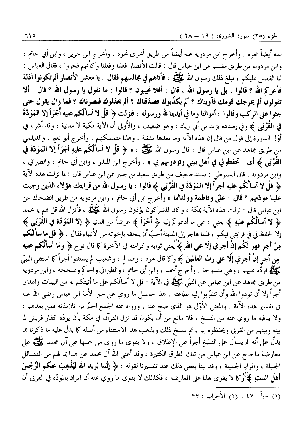 لَنَا الْفَضْلُ عَلَيْكُمْ، فَبَلَغَ ذَلِكَ رَسُولُ اللَّهِ صَلَّى اللَّهُ عَلَيْهِ وَسَلَّمَ، فَأَتَاهُمْ فِي مَجَالِسِهِمْ فَقَالَ: يَا مَعْشَرَ الْأَنْصَارِ أَلَمْ تَكُونُوا أَذِلَّةً فَأَعَزَّكُمُ اللَّهُ؟ قَالُوا: بَلَى يَا رَسُولَ اللَّهِ، قَالَ: أَفَلَا تُجِيبُونَ؟ قَالُوا: مَا نَقُولُ يَا رَسُولَ اللَّهِ؟ قَالَ: أَلَا تَقُولُونَ أَلَمْ يُخْرِجْكَ قَوْمُكَ فَآوَيْنَاكَ؟ أَلَمْ يُكَذِّبُوكَ فَصَدَّقْنَاكَ؟ أَلَمْ يَخْذُلُوكَ فَنَصَرْنَاكَ؟ فَمَا زَالَ يَقُولُ حَتَّى جَثَوْا عَلَى الرُّكَبِ وَقَالُوا: أَمْوَالُنَا وَمَا فِي أَيْدِينَا لِلَّهِ وَرَسُولِهِ، فَنَزَلَتْ قُلْ لا أَسْئَلُكُمْ عَلَيْهِ أَجْراً إِلَّا الْمَوَدَّةَ فِي الْقُرْبى وَفِي إِسْنَادِهِ يَزِيدُ بْنُ أَبِي زِيَادٍ، وَهُوَ ضَعِيفٌ، وَالْأَوْلَى أَنَّ الْآيَةَ مَكِّيَّةٌ لَا مَدَنِيَّةٌ، وَقَدْ أَشَرْنَا فِي أَوَّلِ السُّورَةِ إِلَى قَوْلِ مَنْ قَالَ إِنَّ هَذِهِ الْآيَةَ وَمَا بَعْدَهَا مَدَنِيَّةٌ، وَهَذَا مُتَمَسَّكُهُمْ. وَأَخْرَجَ أَبُو نُعَيْمٍ، وَالدَّيْلَمِيُّ مِنْ طَرِيقِ مُجَاهِدٍ عَنِ ابْنِ عَبَّاسٍ قَالَ: قَالَ رَسُولُ اللَّهِ صَلَّى اللَّهُ عَلَيْهِ وَسَلَّمَ: «قُلْ لا أَسْئَلُكُمْ عَلَيْهِ أَجْراً إِلَّا الْمَوَدَّةَ فِي الْقُرْبى أَيْ: تَحْفَظُونِي فِي أَهْلِ بَيْتِي وَتَوَدُّونَهُمْ بِي» . وَأَخْرَجَ ابْنُ الْمُنْذِرِ، وَابْنُ أَبِي حَاتِمٍ، وَالطَّبَرَانِيُّ، وَابْنُ مَرْدَوَيْهِ. قَالَ السُّيُوطِيُّ: بِسَنَدٍ ضَعِيفٍ مِنْ طَرِيقِ سَعِيدِ بْنِ جُبَيْرٍ عَنِ ابْنِ عَبَّاسٍ قَالَ: لَمَّا نَزَلَتْ هَذِهِ الآية قُلْ لا أَسْئَلُكُمْ عَلَيْهِ أَجْراً إِلَّا الْمَوَدَّةَ فِي الْقُرْبى قَالُوا: يَا رَسُولَ اللَّهِ مَنْ قَرَابَتُكَ هَؤُلَاءِ الَّذِينَ وجبت علينا مودّتهم؟ قال: عليّ وفاطمة وولدهما» وَأَخْرَجَ ابْنُ أَبِي حَاتِمٍ، وَابْنُ مَرْدَوَيْهِ مِنْ طَرِيقِ الضَّحَّاكِ عَنِ ابْنِ عَبَّاسٍ قَالَ: نَزَلَتْ هَذِهِ الْآيَةُ بِمَكَّةَ، وَكَانَ الْمُشْرِكُونَ يُؤْذُونَ رَسُولَ اللَّهِ صَلَّى اللَّهُ عَلَيْهِ وَسَلَّمَ، فَأَنْزَلَ اللَّهُ قُلْ لَهُمْ يَا مُحَمَّدُ لا أَسْئَلُكُمْ عَلَيْهِ يَعْنِي: عَلَى مَا أَدْعُوكُمْ إِلَيْهِ أَجْراً عَرَضًا مِنَ الدُّنْيَا إِلَّا الْمَوَدَّةَ فِي الْقُرْبى إِلَّا الْحِفْظَ لِي فِي قَرَابَتِي فِيكُمْ، فَلَمَّا هَاجَرَ إِلَى الْمَدِينَةِ أَحَبَّ أَنْ يُلْحِقَهُ بِإِخْوَتِهِ مِنَ الْأَنْبِيَاءِ فَقَالَ: قُلْ مَا سَأَلْتُكُمْ مِنْ أَجْرٍ فَهُوَ لَكُمْ إِنْ أَجْرِيَ إِلَّا عَلَى اللَّهِ «1» يَعْنِي ثَوَابَهُ وَكَرَامَتَهُ فِي الْآخِرَةِ كَمَا قَالَ نوح وَما أَسْئَلُكُمْ عَلَيْهِ مِنْ أَجْرٍ إِنْ أَجْرِيَ إِلَّا عَلى رَبِّ الْعالَمِينَ وَكَمَا قَالَ هُودٌ، وَصَالِحٌ، وَشُعَيْبٌ لَمْ يَسْتَثْنُوا أَجْرًا كَمَا اسْتَثْنَى النَّبِيُّ صَلَّى اللَّهُ عَلَيْهِ وَسَلَّمَ فَرَدَّهُ عَلَيْهِمْ، وَهِيَ مَنْسُوخَةٌ. وَأَخْرَجَ أَحْمَدُ، وَابْنُ أَبِي حَاتِمٍ، وَالطَّبَرَانِيُّ وَالْحَاكِمُ وَصَحَّحَهُ، وَابْنُ مَرْدَوَيْهِ مِنْ طَرِيقِ مُجَاهِدٍ عَنِ ابْنِ عَبَّاسٍ عَنِ النَّبِيِّ صَلَّى اللَّهُ عَلَيْهِ وَسَلَّمَ فِي الْآيَةِ: قُلْ لَا أَسْأَلُكُمْ عَلَى مَا أَتَيْتُكُمْ بِهِ مِنَ الْبَيِّنَاتِ وَالْهُدَى أَجْرًا إِلَّا أَنْ تَوَدُّوا اللَّهَ وَأَنْ تَتَقَرَّبُوا إِلَيْهِ بِطَاعَتِهِ. هَذَا حَاصِلُ مَا رُوِيَ عَنْ حَبْرِ الْأُمَّةِ ابْنِ عَبَّاسٍ رَضِيَ اللَّهُ عَنْهُ فِي تَفْسِيرِ هَذِهِ الْآيَةِ. وَالْمَعْنَى الْأَوَّلُ هُوَ الَّذِي صَحَّ عَنْهُ، وَرَوَاهُ عَنْهُ الْجَمْعُ الْجَمُّ مِنْ تَلَامِذَتِهِ فَمَنْ بَعْدَهُمْ، وَلَا يُنَافِيهِ مَا رُوِيَ ع