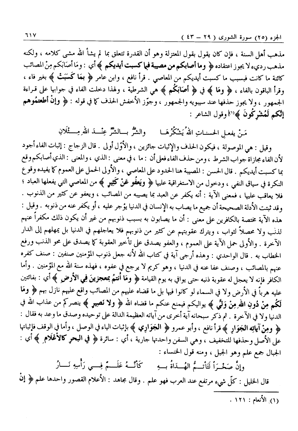 وَمِنْ آياتِهِ الْجَوارِ قَرَأَ نَافِعٌ، وَأَبُو عَمْرٍو «الْجَوَارِي» بِإِثْبَاتِ الْيَاءِ فِي الْوَصْلِ، وَأَمَّا فِي الْوَقْفِ فَإِثْبَاتُهَا عَلَى الْأَصْلِ وَحَذْفُهَا لِلتَّخْفِيفِ، وَهِيَ السُّفُنُ وَاحِدَتُهَا جَارِيَةٌ، أَيْ: سَائِرَةٌ فِي الْبَحْرِ كَالْأَعْلامِ أَيِ: