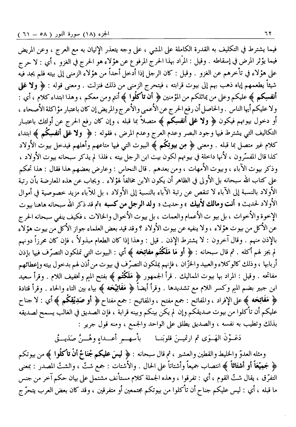 وَلَا عَلَيْكُمْ أَيُّهَا النَّاسُ. وَالْحَاصِلُ أَنَّ رَفْعَ الْحَرَجِ عَنِ الْأَعْمَى وَالْأَعْرَجِ وَالْمَرِيضِ إِنْ كَانَ بِاعْتِبَارِ مُؤَاكَلَةِ الْأَصِحَّاءِ، أَوْ دُخُولِ بُيُوتِهِمْ فَيَكُونُ وَلا عَلى أَنْفُسِكُمْ مُتَّصِلًا بِمَا قَبْلَهُ، وَإِنْ كَانَ رَفْعُ الْحَرَجِ عَنْ أُولَئِكَ بِاعْتِبَارِ التَّكَالِيفِ الَّتِي يُشْتَرَطُ فِيهَا وُجُودُ الْبَصَرِ وَعَدَمِ الْعَرَجِ وَعَدَمِ الْمَرَضِ، فَقَوْلُهُ: وَلا عَلى أَنْفُسِكُمْ ابْتِدَاءُ كَلَامٍ غَيْرِ مُتَّصِلٍ بِمَا قَبْلَهُ. وَمَعْنَى مِنْ بُيُوتِكُمْ الْبُيُوتُ الَّتِي فِيهَا مَتَاعُهُمْ وَأَهْلُهُمْ فَيَدْخُلُ بُيُوتَ الْأَوْلَادِ كَذَا قَالَ الْمُفَسِّرُونَ، لِأَنَّهَا دَاخِلَةٌ فِي بُيُوتِهِمْ لِكَوْنِ بَيْتِ ابْنِ الرَّجُلِ بَيْتَهُ، فَلِذَا لَمْ يَذْكُرْ سُبْحَانَهُ بُيُوتَ الْأَوْلَادِ، وَذَكَرَ بُيُوتَ الْآبَاءِ، وَبُيُوتَ الْأُمَّهَاتِ، وَمَنْ بَعْدَهُمْ. قَالَ النَّحَّاسُ: وَعَارَضَ بَعْضُهُمْ هَذَا فَقَالَ: هَذَا تَحَكُّمٌ عَلَى كِتَابِ اللَّهِ سُبْحَانَهُ بَلِ الْأَوْلَى فِي الظَّاهِرِ أَنْ يَكُونَ الِابْنُ مُخَالِفًا لِهَؤُلَاءِ. وَيُجَابُ عَنْ هَذِهِ الْمُعَارَضَةِ بِأَنَّ رُتْبَةَ الْأَوْلَادِ بِالنِّسْبَةِ إِلَى الْآبَاءِ لَا تَنْقُصُ عَنْ رُتْبَةِ الْآبَاءِ بِالنِّسْبَةِ إِلَى الْأَوْلَادِ، بَلْ لِلْآبَاءِ مَزِيدُ خُصُوصِيَّةٍ فِي أَمْوَالِ الْأَوْلَادِ لِحَدِيثِ «أَنْتَ وَمَالُكَ لِأَبِيكَ» وَحَدِيثُ «وَلَدُ الرَّجُلِ مِنْ كَسْبِهِ» ثُمَّ قَدْ ذَكَرَ اللَّهُ سُبْحَانَهُ هَاهُنَا بُيُوتَ الْإِخْوَةِ وَالْأَخَوَاتِ، بَلْ بُيُوتَ الْأَعْمَامِ وَالْعَمَّاتِ، بَلْ بُيُوتَ الْأَخْوَالِ وَالْخَالَاتِ، فَكَيْفَ يَنْفِي سُبْحَانَهُ الْحَرَجَ عَنِ الْأَكْلِ مِنْ بُيُوتِ هَؤُلَاءِ، وَلَا يَنْفِيِهِ عَنْ بُيُوتِ الْأَوْلَادِ؟ وَقَدْ قَيَّدَ بَعْضُ الْعُلَمَاءِ جَوَازَ الْأَكْلِ مِنْ بُيُوتِ هَؤُلَاءِ بِالْإِذْنِ مِنْهُمْ. وَقَالَ آخَرُونَ: لَا يُشْتَرَطُ الْإِذْنُ. قِيلَ: وَهَذَا إِذَا كَانَ الطَّعَامُ مَبْذُولًا، فَإِنْ كَانَ مُحَرَّزًا دُونَهُمْ لَمْ يَجُزْ لَهُمْ أَكْلُهُ. ثُمَّ قَالَ سُبْحَانَهُ: أَوْ مَا مَلَكْتُمْ مَفاتِحَهُ أَيِ: الْبُيُوتُ الَّتِي تَمْلِكُونَ التَّصَرُّفَ فِيهَا بِإِذْنِ أَرْبَابِهَا، وَذَلِكَ كَالْوُكَلَاءِ وَالْعَبِيدِ وَالْخُزَّانِ، فَإِنَّهُمْ يَمْلِكُونَ التَّصَرُّفَ فِي بُيُوتِ مَنْ أَذِنَ لَهُمْ بِدُخُولِ بَيْتِهِ وَإِعْطَائِهِمْ مَفَاتِحَهُ. وَقِيلَ: الْمُرَادُ بِهَا بُيُوتُ الْمَمَالِيكِ. قَرَأَ الْجُمْهُورُ مَلَكْتُمْ بِفَتْحِ الميم وتخفيف اللام. وقرأ سعيد ابن جُبَيْرٍ بِضَمِّ الْمِيمِ وَكَسْرِ اللَّامِ مَعَ تَشْدِيدِهَا. وَقَرَأَ أَيْضًا «مَفَاتِيحَهُ» بِيَاءٍ بَيْنَ التَّاءِ وَالْحَاءِ. وَقَرَأَ قَتَادَةُ مَفاتِحَهُ عَلَى الْإِفْرَادِ، وَالْمَفَاتِحُ: جَمْعُ مَفْتَحٍ، وَالْمَفَاتِيحُ: جَمْعُ مِفْتَاحٍ أَوْ صَدِيقِكُمْ أَيْ: لَا جُنَاحَ عَلَيْكُمْ أَنْ تَأْكُلُوا مِنْ بُيُوتِ صَدِيقِكُمْ وَإِنْ لَمْ يَكُنْ بَيْنَكُمْ وَبَيْنَهُ قُرَابَةٌ، فَإِنَّ الصَّدِيقَ فِي الْغَالِبِ يَسْمَحُ لِصَدِيقِهِ بِذَلِكَ وَتَطِيبُ بِهِ نَفْسُهُ، وَالصَّدِيقُ يُطْلَقُ عَلَى الْوَاحِدِ وَالْجَمْعِ، وَمِنْهُ قَوْلُ جَرِيرٍ: