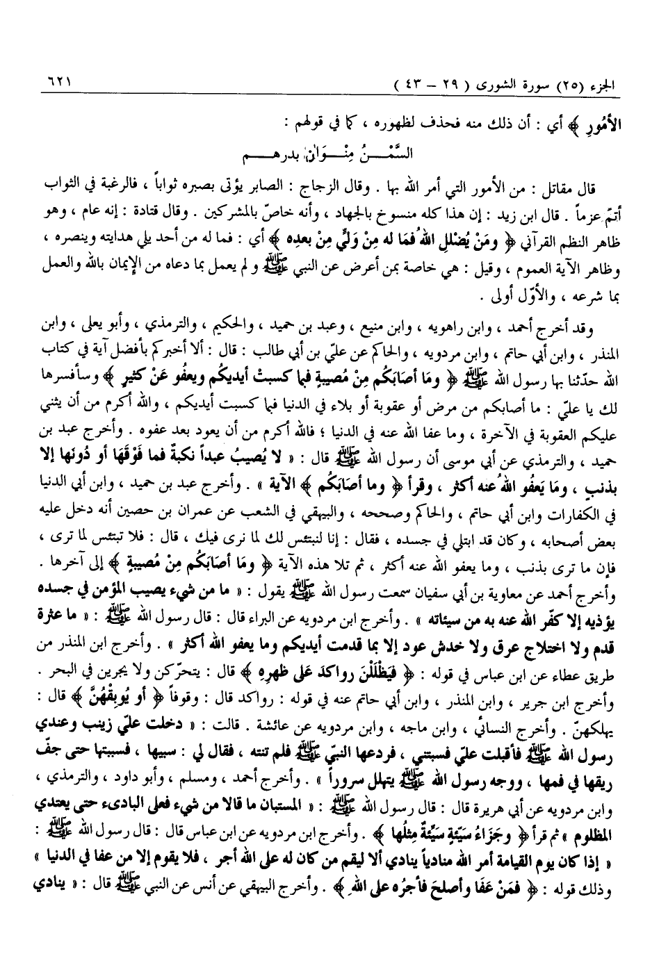 وَقَدْ أَخْرَجَ أَحْمَدُ، وَابْنُ رَاهَوَيْهِ، وَابْنُ منيع، وعبد بن حميد، والحكيم، والترمذي، وَأَبُو يَعْلَى، وَابْنُ الْمُنْذِرِ، وَابْنُ أَبِي حَاتِمٍ، وَابْنُ مَرْدَوَيْهِ، وَالْحَاكِمُ عَنْ عَلِيِّ بْنِ أَبِي طَالِبٍ: قَالَ: أَلَا أُخْبِرُكُمْ بِأَفْضَلِ آيَةٍ فِي كِتَابِ اللَّهِ حَدَّثَنَا بِهَا رَسُولُ اللَّهِ صَلَّى اللَّهُ عَلَيْهِ وَسَلَّمَ وَما أَصابَكُمْ مِنْ مُصِيبَةٍ فَبِما كَسَبَتْ أَيْدِيكُمْ وَيَعْفُوا عَنْ كَثِيرٍ وَسَأُفَسِّرُهَا لَكَ يَا عَلِيُّ: مَا أَصَابَكُمْ مِنْ مَرَضٍ أَوْ عُقُوبَةٍ أَوْ بَلَاءٍ فِي الدُّنْيَا فَبِمَا كَسَبَتْ أَيْدِيكُمْ، وَاللَّهُ أَكْرَمُ مِنْ أَنْ يُثْنِيَ عَلَيْكُمُ الْعُقُوبَةَ فِي الْآخِرَةِ، وَمَا عَفَا اللَّهُ عَنْهُ فِي الدُّنْيَا فَاللَّهُ أَكْرَمُ مِنْ أَنْ يَعُودَ بَعْدَ عَفْوِهِ. وَأَخْرَجَ عَبْدُ بْنُ حُمَيْدٍ، وَالتِّرْمِذِيُّ عَنْ أَبِي مُوسَى أَنَّ رَسُولَ اللَّهِ صَلَّى اللَّهُ عَلَيْهِ وَسَلَّمَ قَالَ: «لَا يُصِيبُ عَبْدًا نَكْبَةٌ فَمَا فَوْقَهَا أَوْ دُونَهَا إِلَّا بِذَنْبٍ، وَمَا يَعْفُو اللَّهُ عَنْهُ أَكْثَرُ، وَقَرَأَ وَما أَصابَكُمْ الْآيَةَ» . وَأَخْرَجَ عَبْدُ بْنُ حُمَيْدٍ، وَابْنُ أَبِي الدُّنْيَا فِي الْكَفَّارَاتِ وَابْنُ أَبِي حَاتِمٍ، وَالْحَاكِمُ وَصَحَّحَهُ، وَالْبَيْهَقِيُّ فِي الشُّعَبِ عَنْ عِمْرَانَ بْنِ حُصَيْنٍ أَنَّهُ دَخَلَ عَلَيْهِ بَعْضُ أَصْحَابِهِ، وَكَانَ قَدِ ابْتُلِيَ فِي جَسَدِهِ، فَقَالَ: إِنَّا لَنَبْتَئِسُ لَكَ لِمَا نَرَى فِيكَ، قَالَ: فَلَا تَبْتَئِسْ لِمَا تَرَى، فَإِنَّ مَا تَرَى بِذَنْبٍ، وَمَا يَعْفُو اللَّهُ عَنْهُ أَكْثَرُ، ثُمَّ تَلَا هَذِهِ الْآيَةَ وَما أَصابَكُمْ مِنْ مُصِيبَةٍ إِلَى آخِرِهَا.