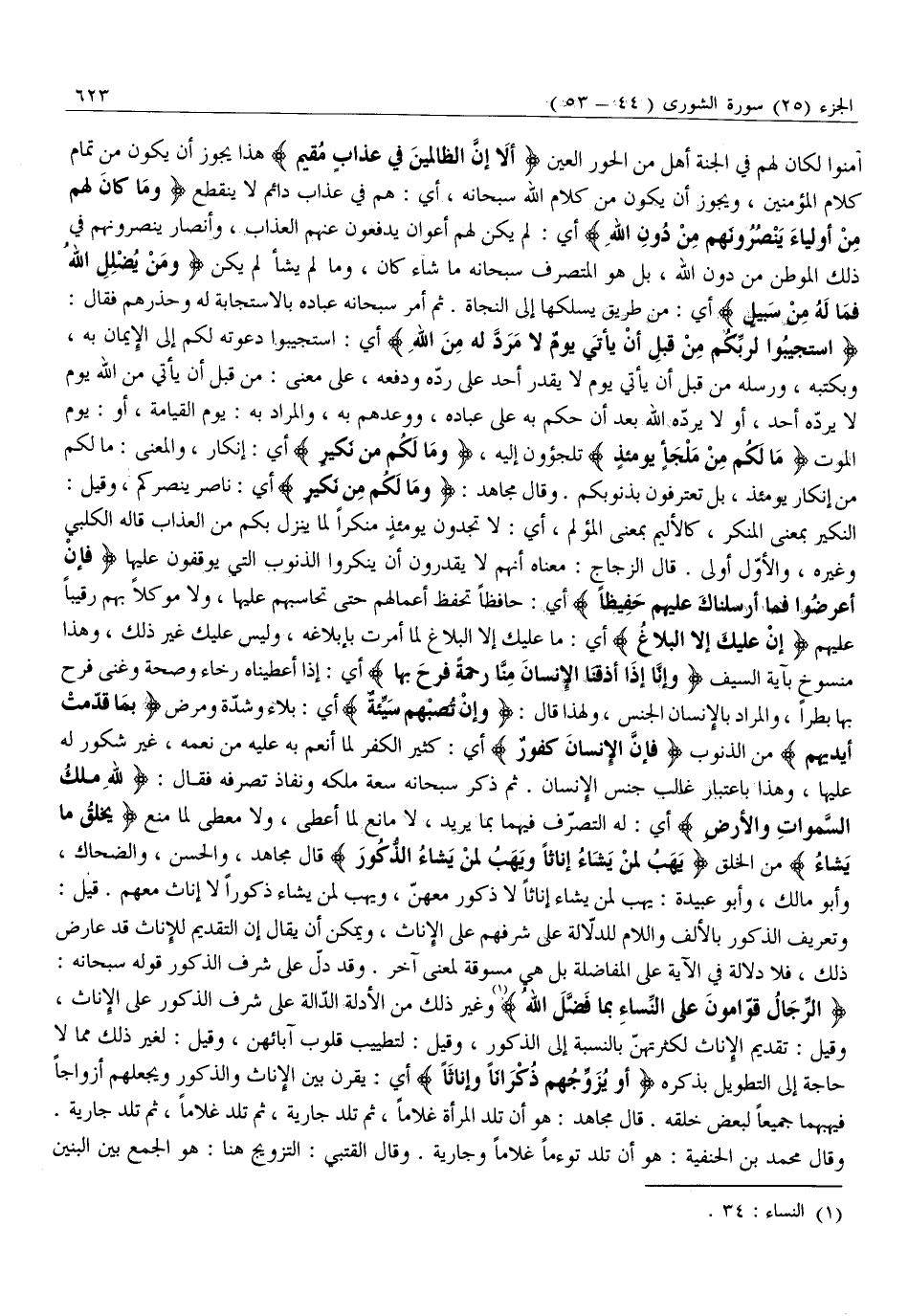 النَّكِيرُ بِمَعْنَى الْمُنْكِرِ، كَالْأَلِيمِ بِمَعْنَى الْمُؤْلِمِ، أَيْ: لَا تَجِدُونَ يَوْمَئِذٍ مُنْكِرًا لِمَا يَنْزِلُ بِكُمْ مِنَ الْعَذَابِ قَالَهُ الْكَلْبِيُّ وَغَيْرُهُ، وَالْأَوَّلُ أَوْلَى. قَالَ الزَّجَّاجُ: مَعْنَاهُ أَنَّهُمْ لَا يَقْدِرُونَ أَنْ يُنْكِرُوا الذُّنُوبَ الَّتِي يُوقَفُونَ عَلَيْهَا فَإِنْ أَعْرَضُوا فَما أَرْسَلْناكَ عَلَيْهِمْ حَفِيظاً أَيْ: حَافِظًا تَحْفَظُ أَعْمَالَهُمْ حَتَّى تُحَاسِبَهُمْ عَلَيْهَا، وَلَا مُوَكَّلًا بِهِمْ رَقِيبًا عَلَيْهِمْ إِنْ عَلَيْكَ إِلَّا الْبَلاغُ أَيْ: مَا عَلَيْكَ إِلَّا الْبَلَاغُ لِمَا أُمِرْتَ بِإِبْلَاغِهِ، وَلَيْسَ عَلَيْكَ غَيْرُ ذَلِكَ، وَهَذَا مَنْسُوخٌ بِآيَةِ السَّيْفِ وَإِنَّا إِذا أَذَقْنَا الْإِنْسانَ مِنَّا رَحْمَةً فَرِحَ بِها أَيْ: إِذَا أَعْطَيْنَاهُ رَخَاءً وَصِحَّةً وَغِنًى فَرِحَ بِهَا بَطَرًا، وَالْمُرَادُ بِالْإِنْسَانِ الْجِنْسُ، وَلِهَذَا قَالَ: وَإِنْ تُصِبْهُمْ سَيِّئَةٌ أَيْ: بَلَاءٌ وَشِدَّةٌ وَمَرَضٌ بِما قَدَّمَتْ أَيْدِيهِمْ مِنَ الذُّنُوبِ فَإِنَّ الْإِنْسانَ كَفُورٌ أَيْ: كَثِيرُ الْكُفْرِ لِمَا أَنْعَمَ بِهِ عَلَيْهِ مِنْ نِعَمِهِ، غَيْرُ شَكُورٍ لَهُ عَلَيْهَا، وَهَذَا بِاعْتِبَارِ غَالِبِ جِنْسِ الْإِنْسَانِ. ثُمَّ ذَكَرَ سُبْحَانَهُ سَعَةَ مُلْكِهِ وَنَفَاذَ تَصَرُّفِهِ فَقَالَ: لِلَّهِ مُلْكُ السَّماواتِ وَالْأَرْضِ أَيْ: لَهُ التَّصَرُّفُ فِيهِمَا بِمَا يُرِيدُ، لَا مَانِعَ لِمَا أَعْطَى، وَلَا مُعْطِيَ لِمَا مَنَعَ يَخْلُقُ مَا يَشاءُ مِنَ الْخَلْقِ يَهَبُ لِمَنْ يَشاءُ إِناثاً وَيَهَبُ لِمَنْ يَشاءُ الذُّكُورَ قَالَ مُجَاهِدٌ، وَالْحَسَنُ، وَالضَّحَّاكُ، وَأَبُو مَالِكٍ، وَأَبُو عُبَيْدَةَ: يَهَبُ لِمَنْ يَشَاءُ إِنَاثًا لَا ذُكُورَ مَعَهُنَّ، وَيَهَبُ لِمَنْ يَشَاءُ ذُكُورًا لَا إِنَاثَ مَعَهُمْ. قِيلَ: